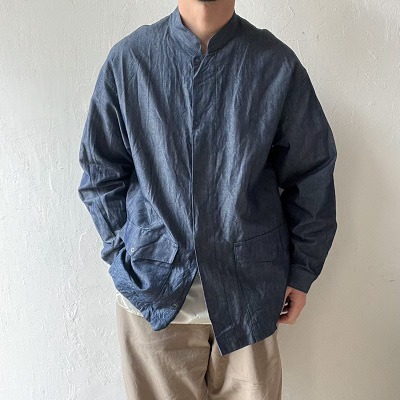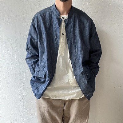 ジャケットはスッキリとした立ち襟のデザ