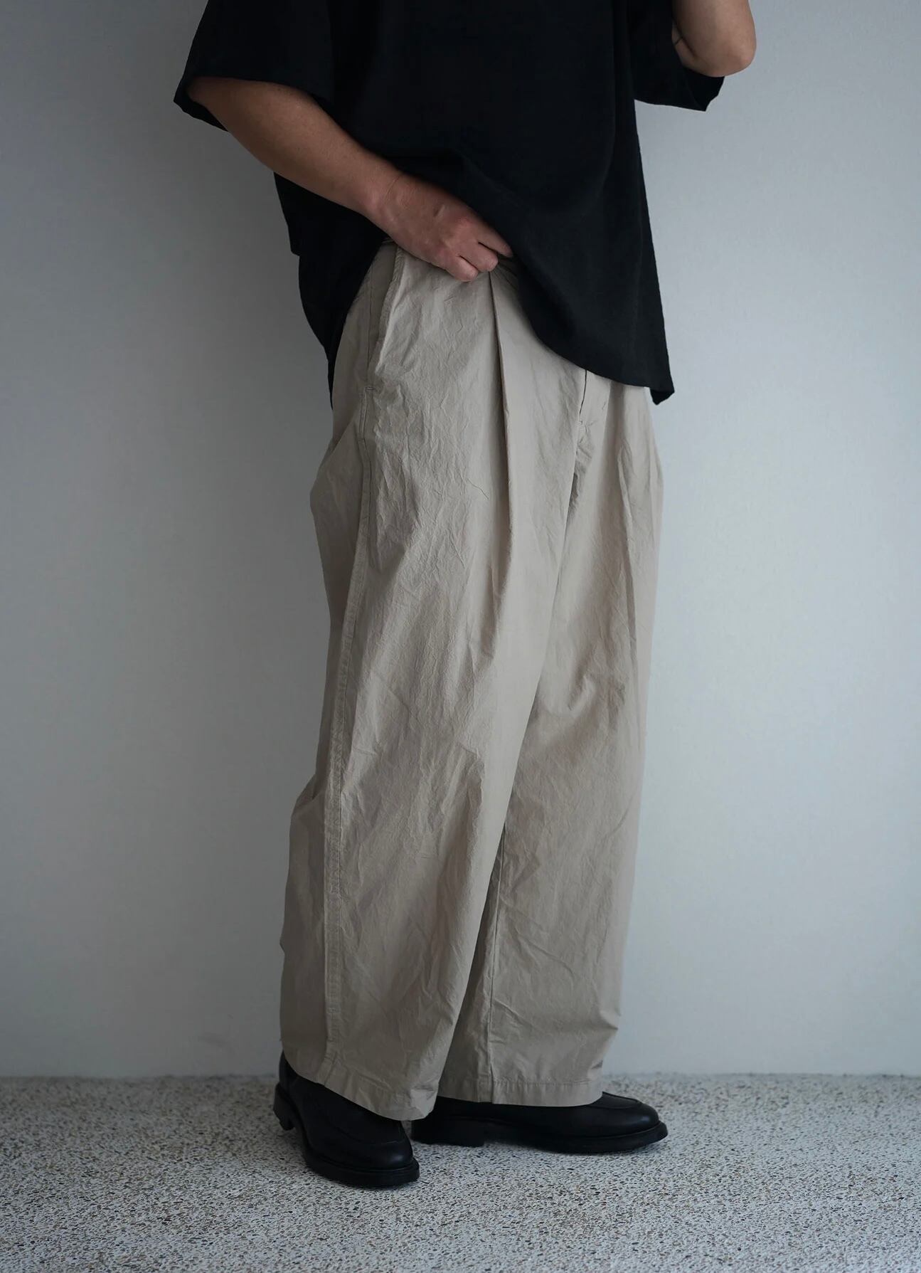 細番手を高密度に織った薄手の生地で、反発感があり肌離れもよく、夏でも気持ち良く着用出来る素材感です。素材を活かした太いワタリに裾を少し細くすることでバランスの良いシルエットに。程よく個性を感じられるパンツです。