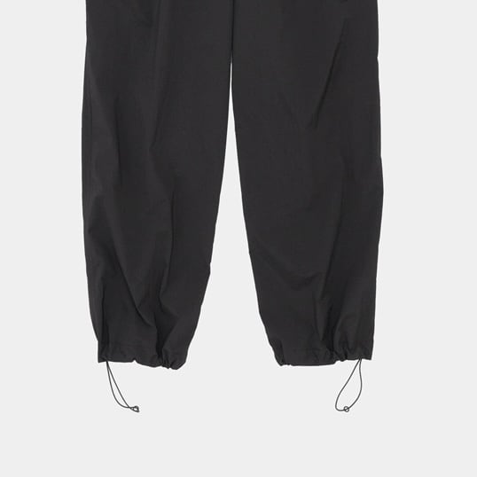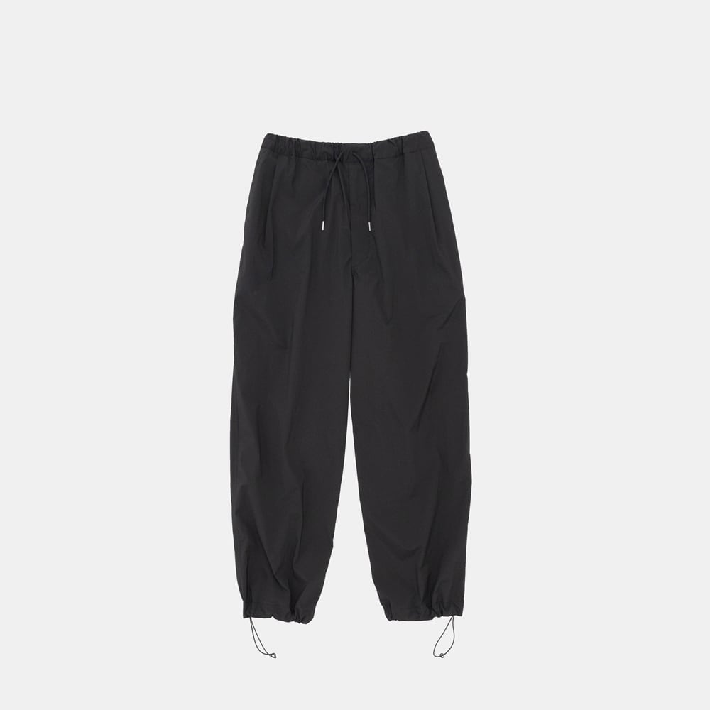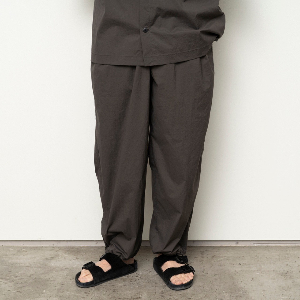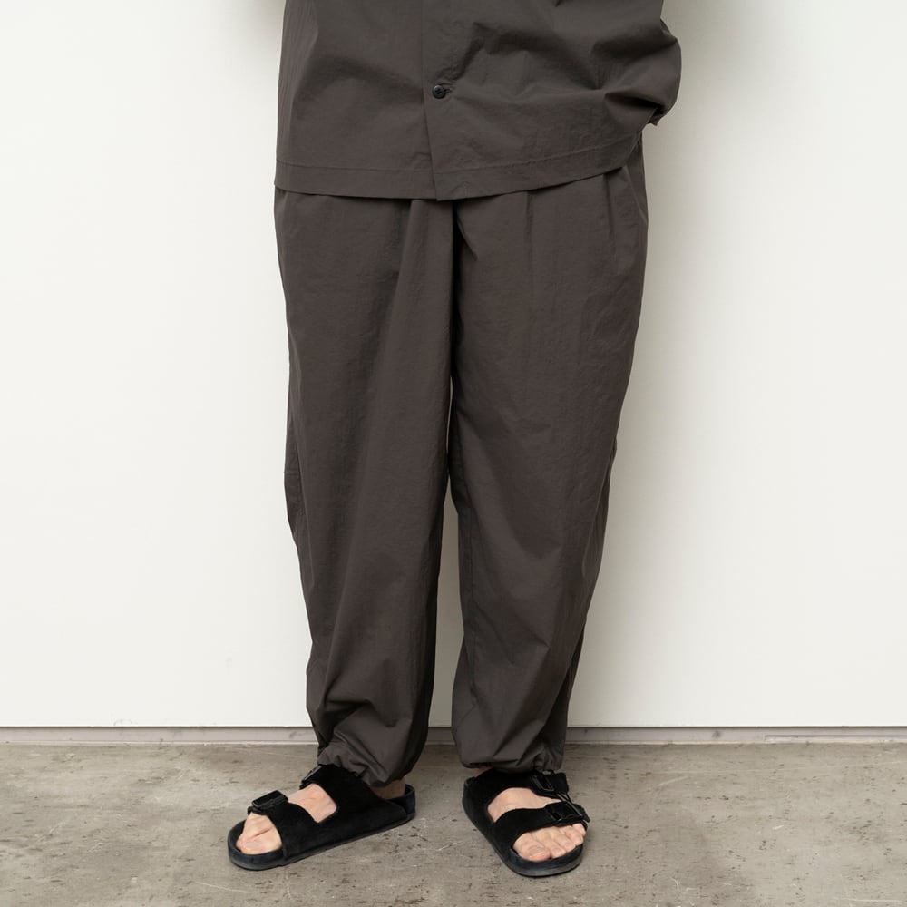 薄手で驚くほど軽いナイロン素材の生地を使用したワイドパンツ。裾が絞れるデザインで、スニーカーや革靴、サンダル等スタイルに合わせてシルエットの変更が可能です。ウエスト周りは平ゴムを叩きつけた仕様で、スピンドルで絞って穿いていただくタイプです。速乾性があり、イージーケアなところも◎。夏場でも快適に穿けるイージーパンツです。(同素材のシャツSH01252とセットアップのコーディネイトが可能です。)