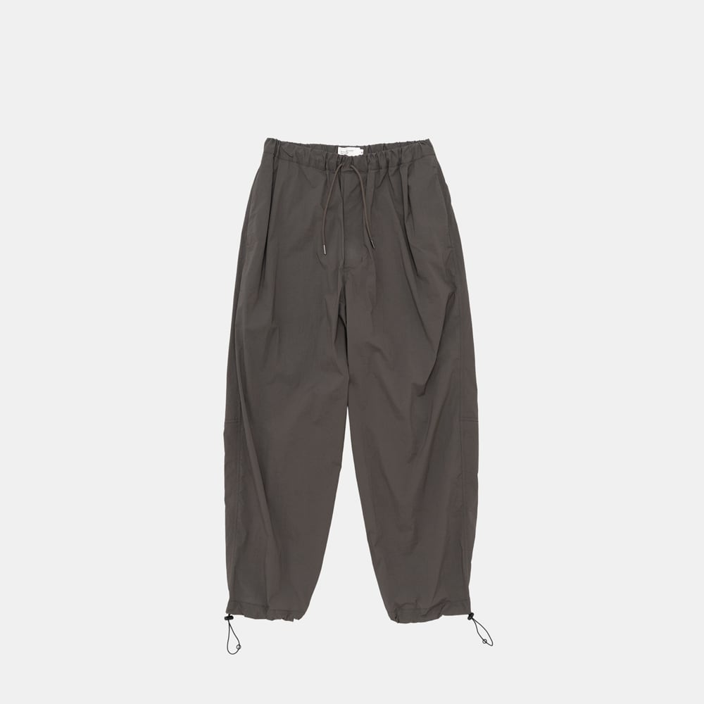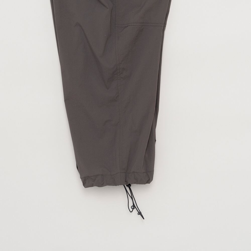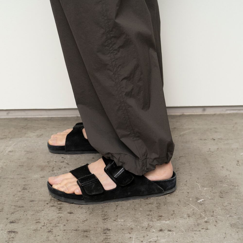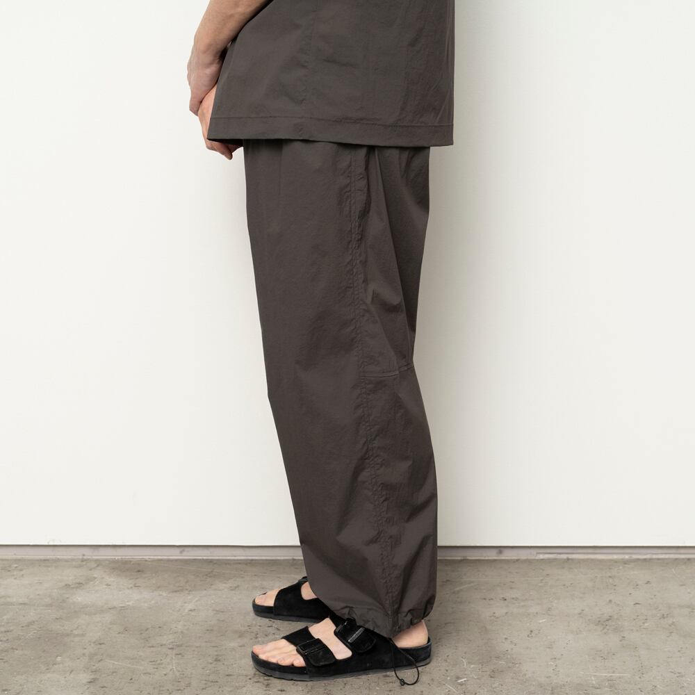 薄手で驚くほど軽いナイロン素材の生地を使用したワイドパンツ。裾が絞れるデザインで、スニーカーや革靴、サンダル等スタイルに合わせてシルエットの変更が可能です。ウエスト周りは平ゴムを叩きつけた仕様で、スピンドルで絞って穿いていただくタイプです。速乾性があり、イージーケアなところも◎。夏場でも快適に穿けるイージーパンツです。(同素材のシャツSH01252とセットアップのコーディネイトが可能です。)
