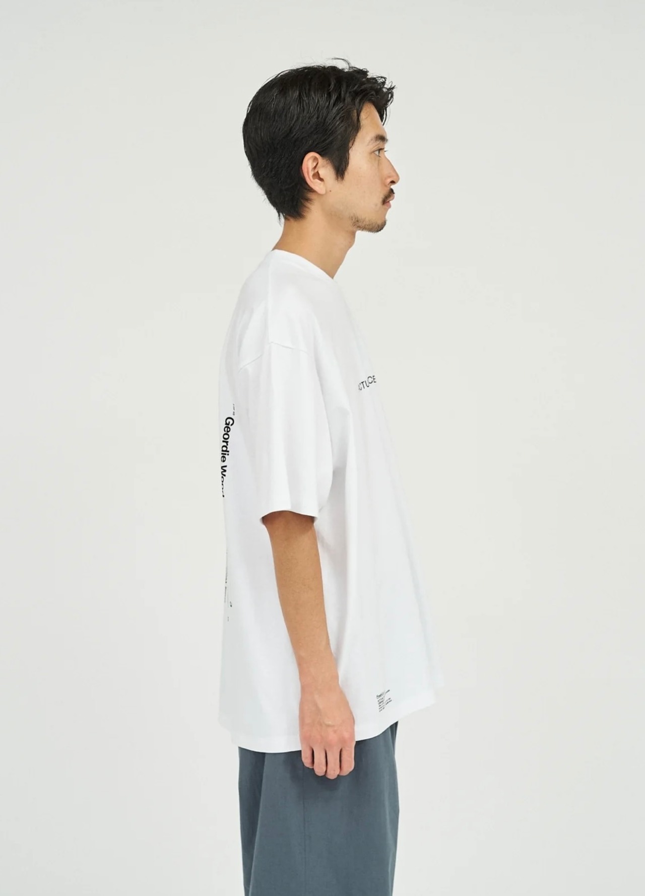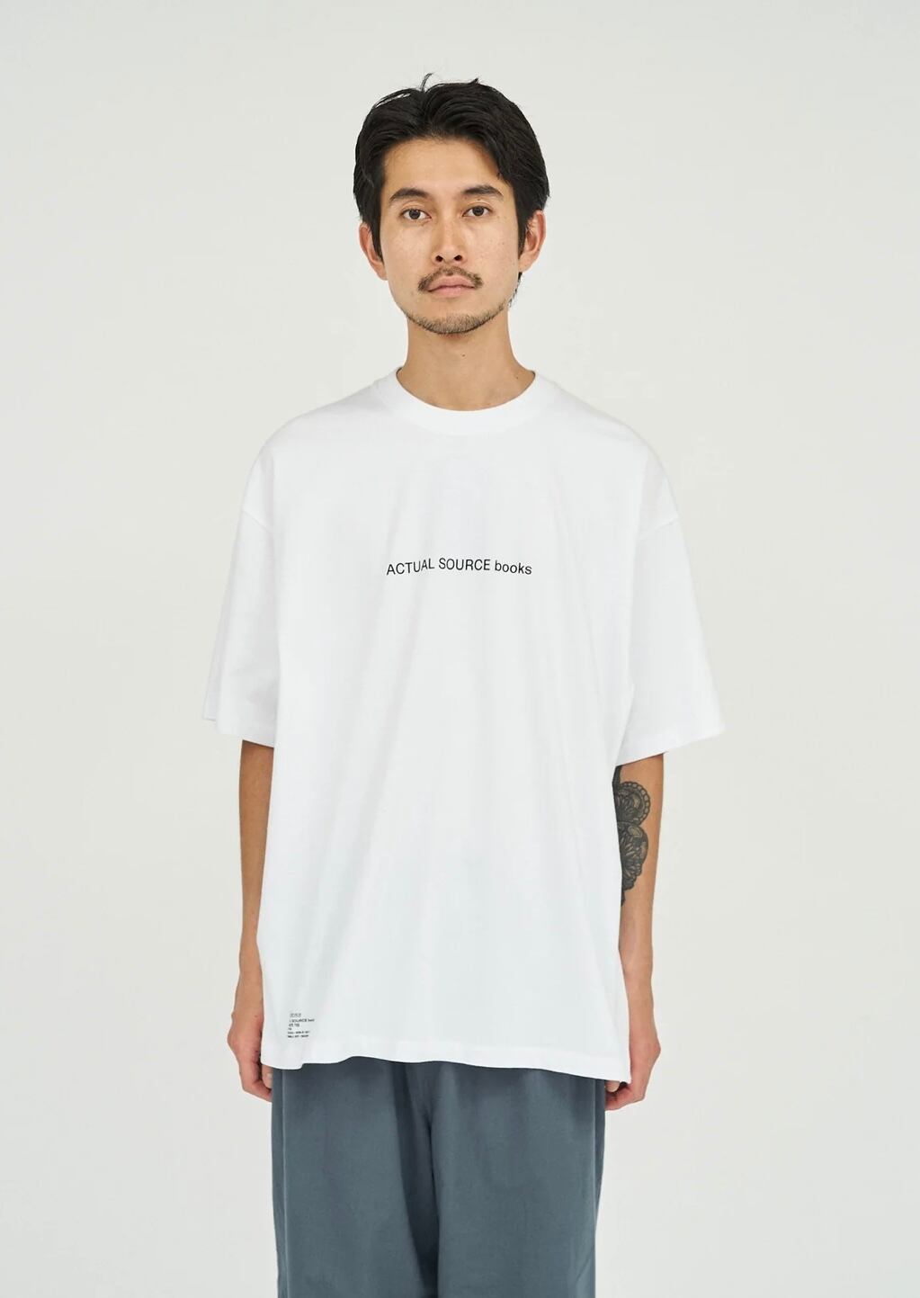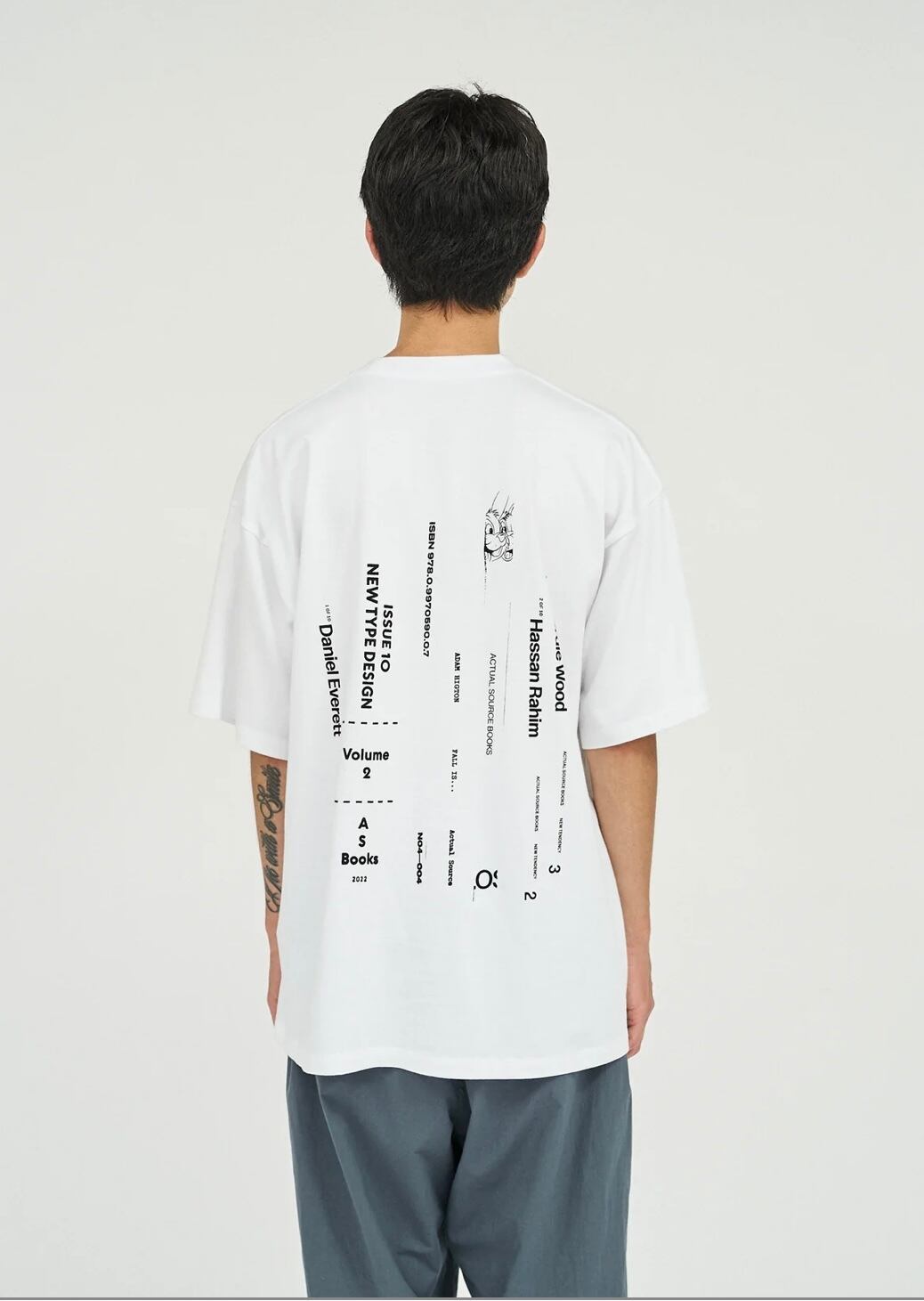 出版やアート、アパレルまで横断的に活動するデザインスタジオ『Actual Source』とのコラボレーションによるカプセルコレクション。彼らのルーツである出版カルチャーを象徴するグラフィックを背面にプリントしました。書籍の背表紙や刊行情報を積み重ねたようなレイアウトは、まさに“BOOK STACK”を思わせるデザイン。タイポグラフィと記号を組み合わせた独特の構図は、シンプルなホワイトTシャツに知的でアートフルなニュアンスを与えています。ドロップショルダーによるオーバーサイズシルエットで、リラックス感のある着心地。1枚で主役としても、ジャケットやシャツのインナーとしてもスタイリングを引き立てる一着です。