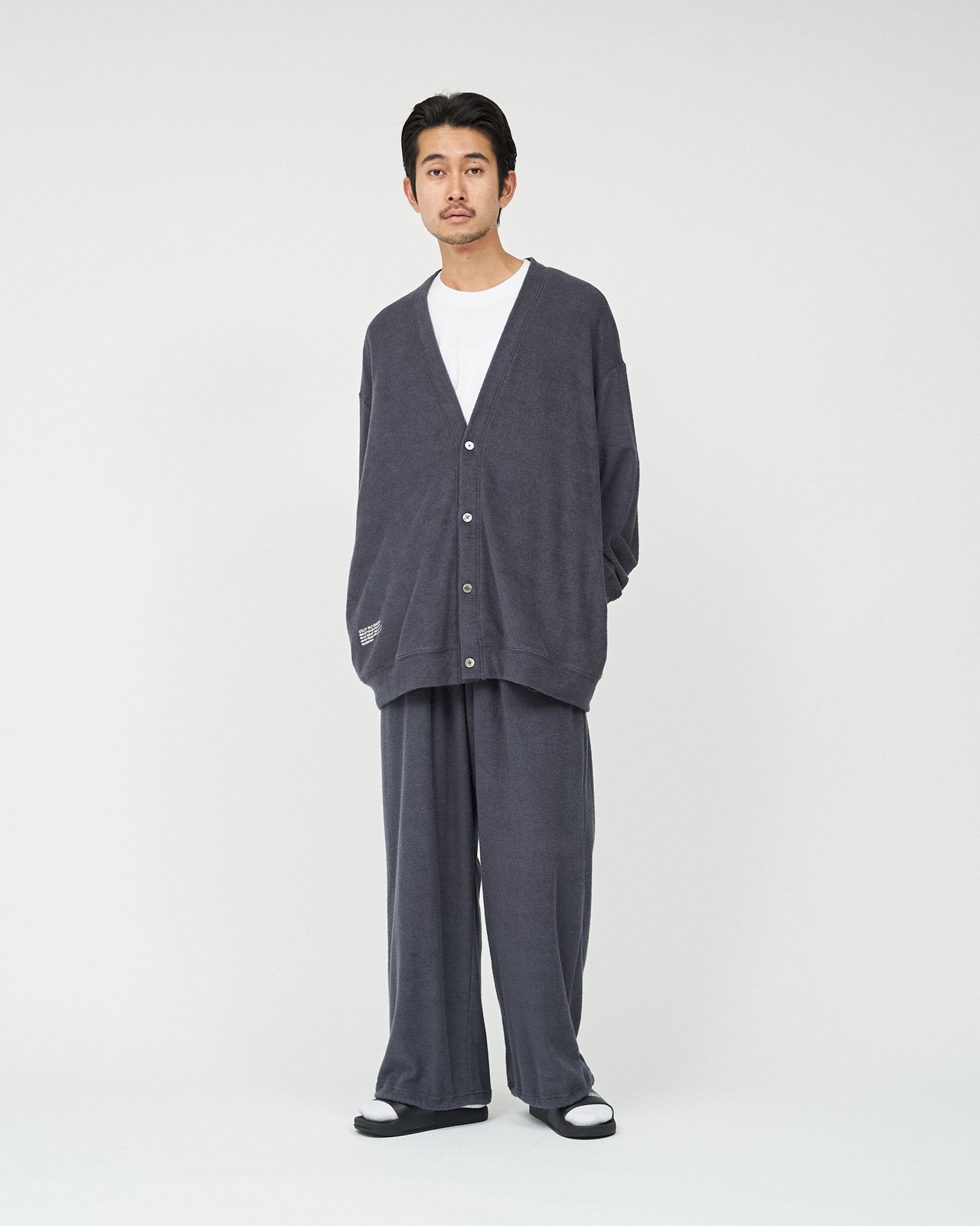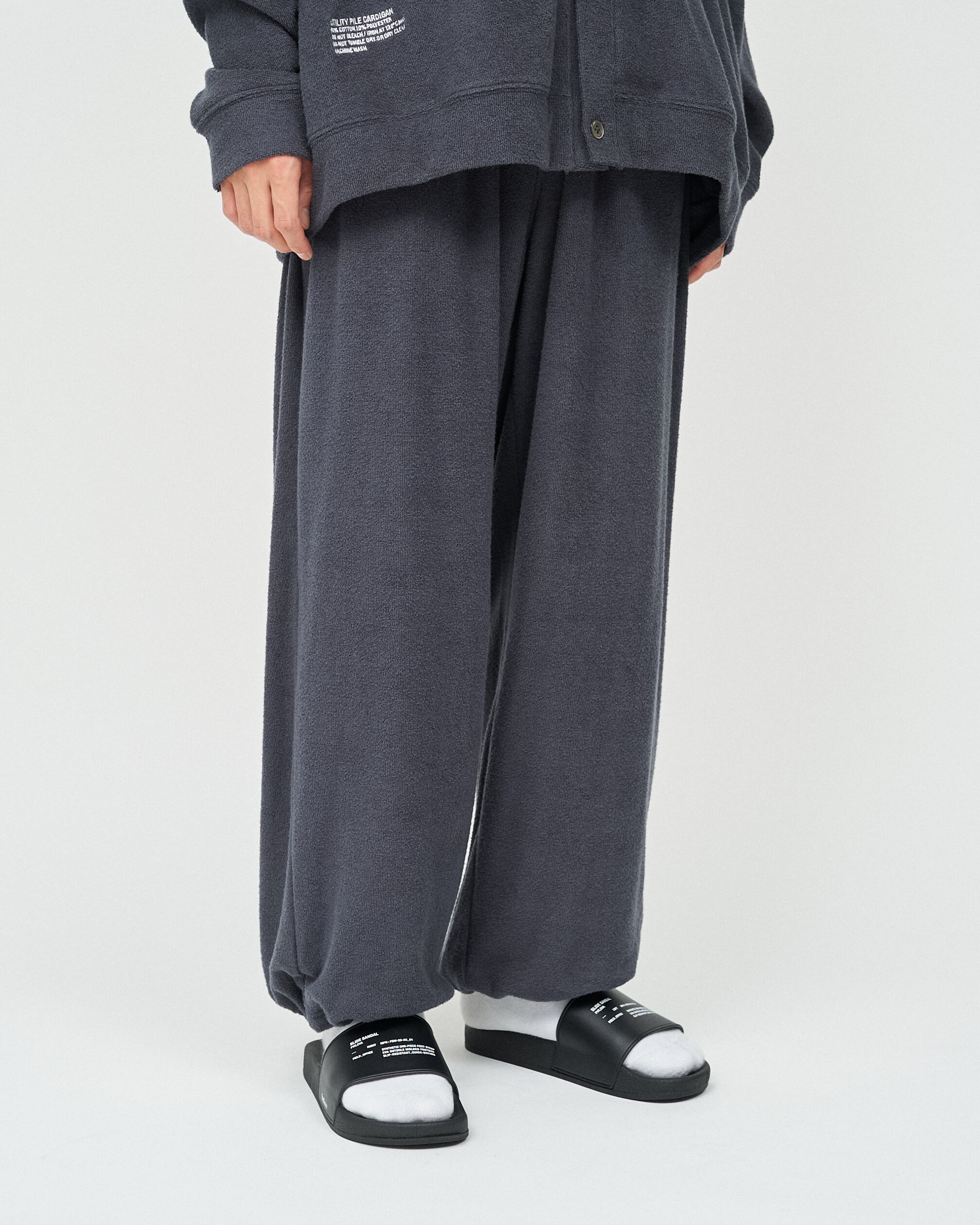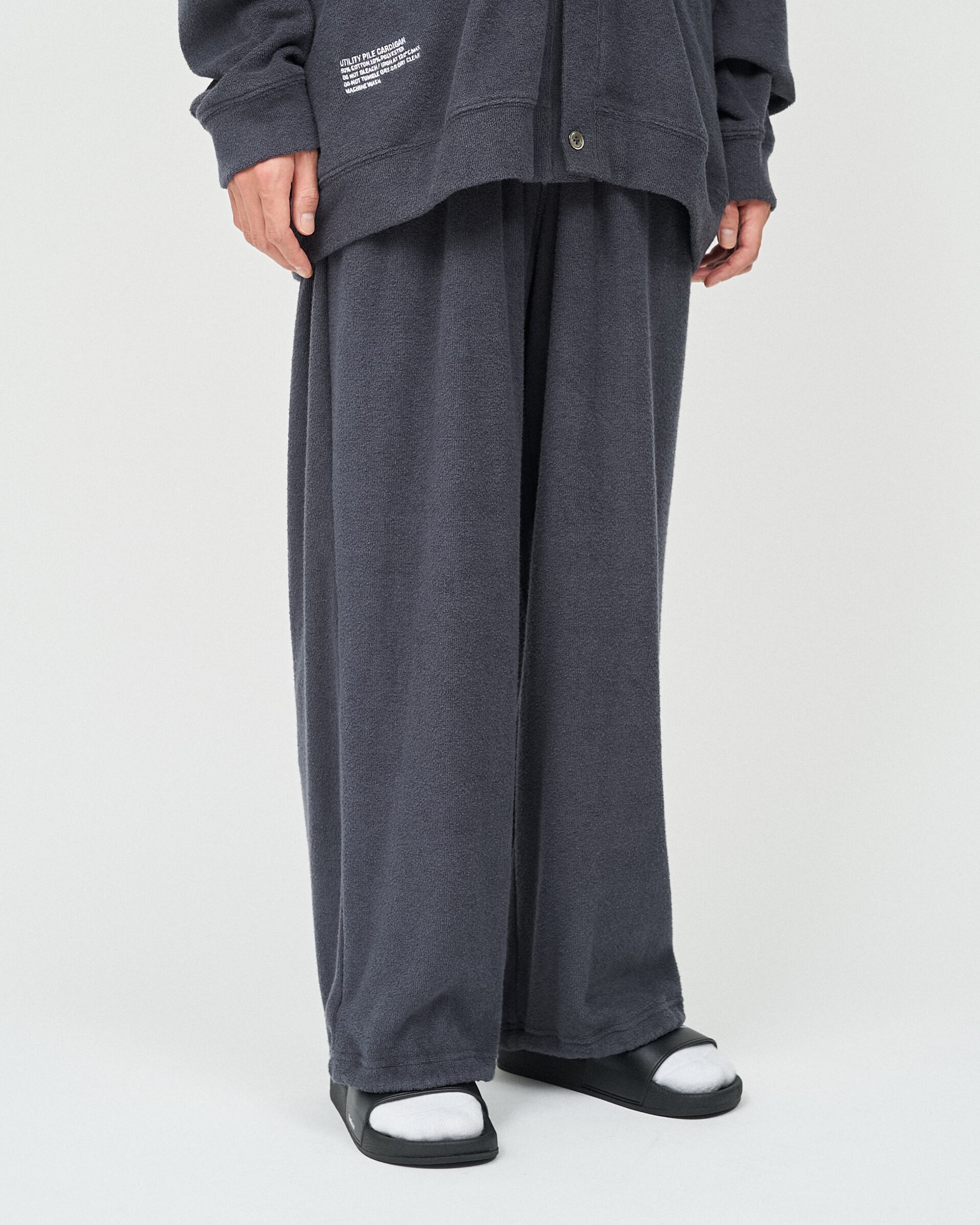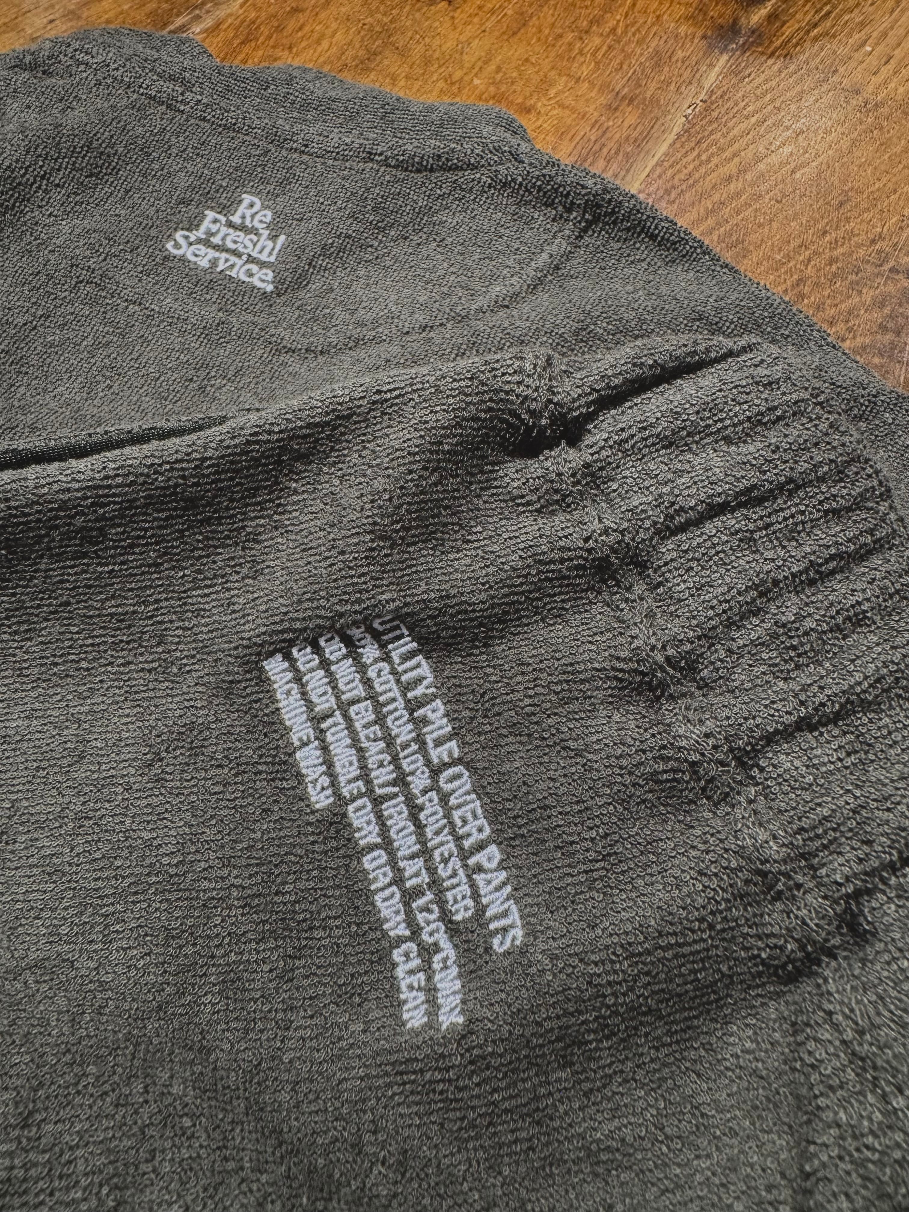 柔らかな肌触りでリラックス感溢れるパイル地を使用したReFresh!Serviceのカーディガンとイージーパンツのセットアップ。ゆったりとしたサイジングで伸縮性も抜群。通気性も良くルームウェアとしても快適。パンツの裾にはスピンドルコードが付いており、スタイリングのアレンジが可能です。