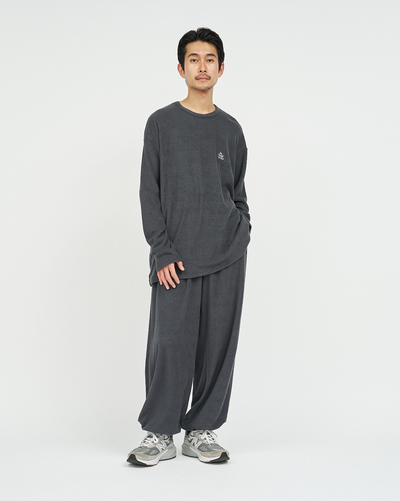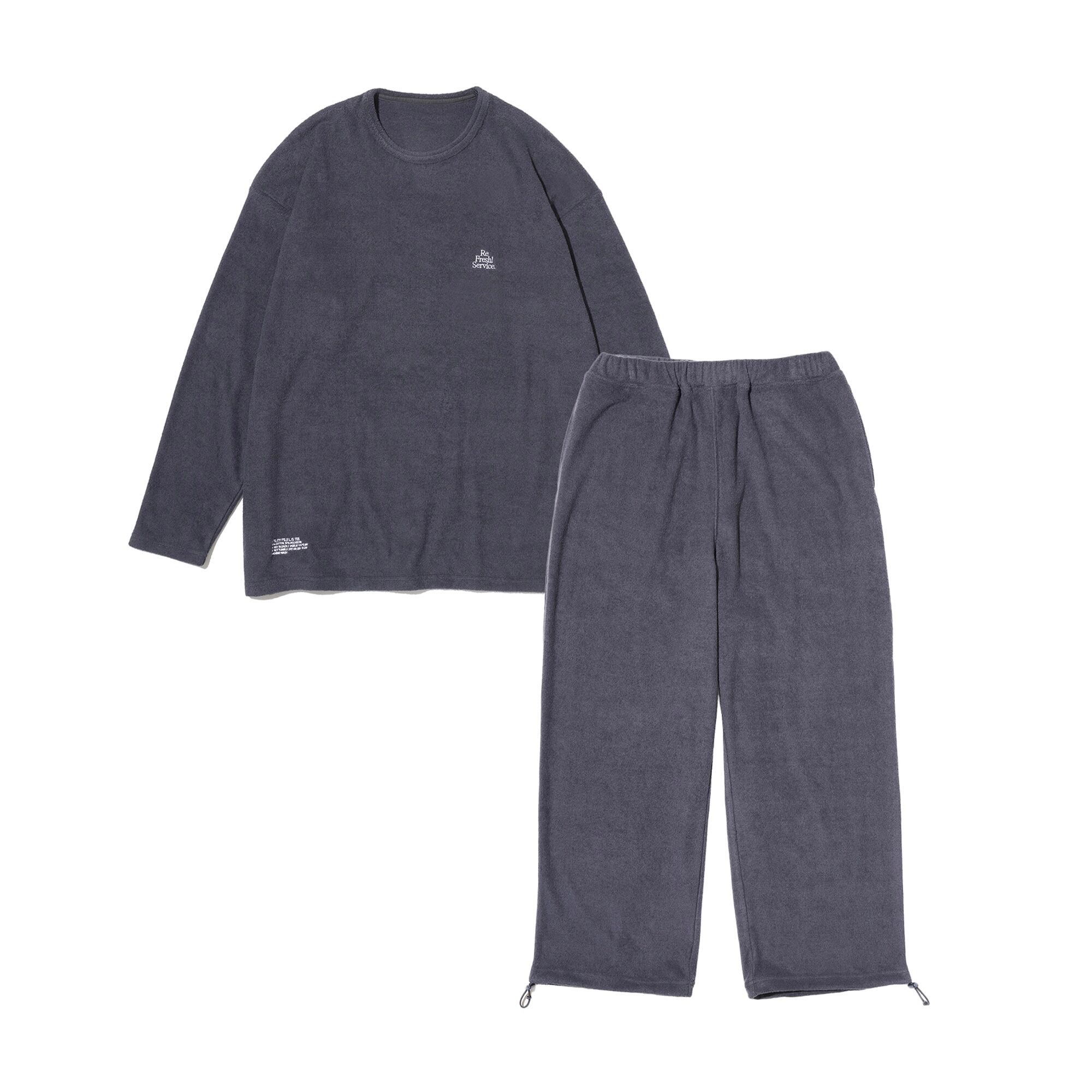 柔らかな肌触りでリラックス感溢れるパイル地を使用したReFresh!ServiceのロングスリーブTシャツとイージーパンツのセットアップ。ゆったりとしたサイジングで伸縮性も抜群。通気性も良くルームウェアとしても快適。パンツの裾にはスピンドルコードが付いており、スタイリングのアレンジが可能です。