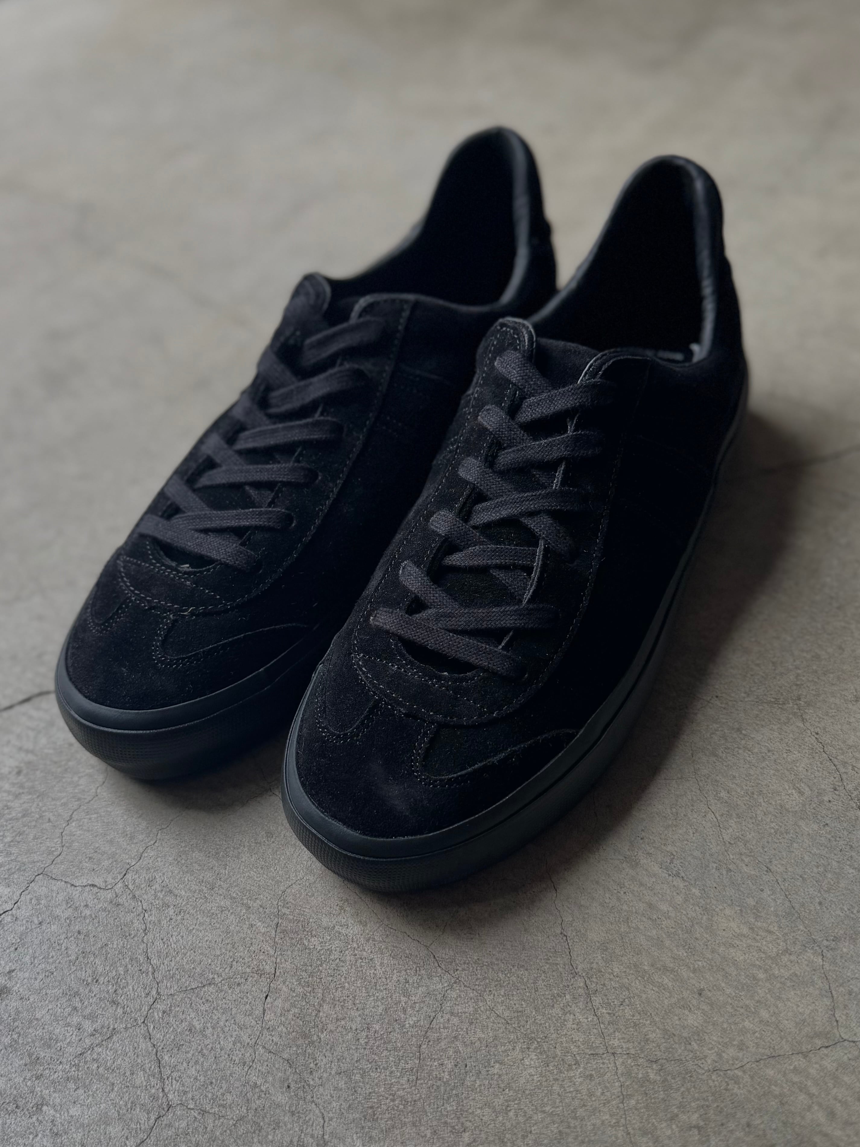 REPRODUCTION OF FOUNDとSTILL BY HANDが共同制作したスウェード素材のシューズ。ジャーマントレーナーをベースに、ソールとアッパーのデザインを変えて再構築。ソールは定番のガムソールではなく、アッパーと同色のゴム製ソールをヴァルカナイズ製法で装着しています。つま先部分の切り替えを別注し、70年代頃のジャーマントレーナーのキャップをトレース。単一カラーでまとめられたミニマムなデザインの一足です。