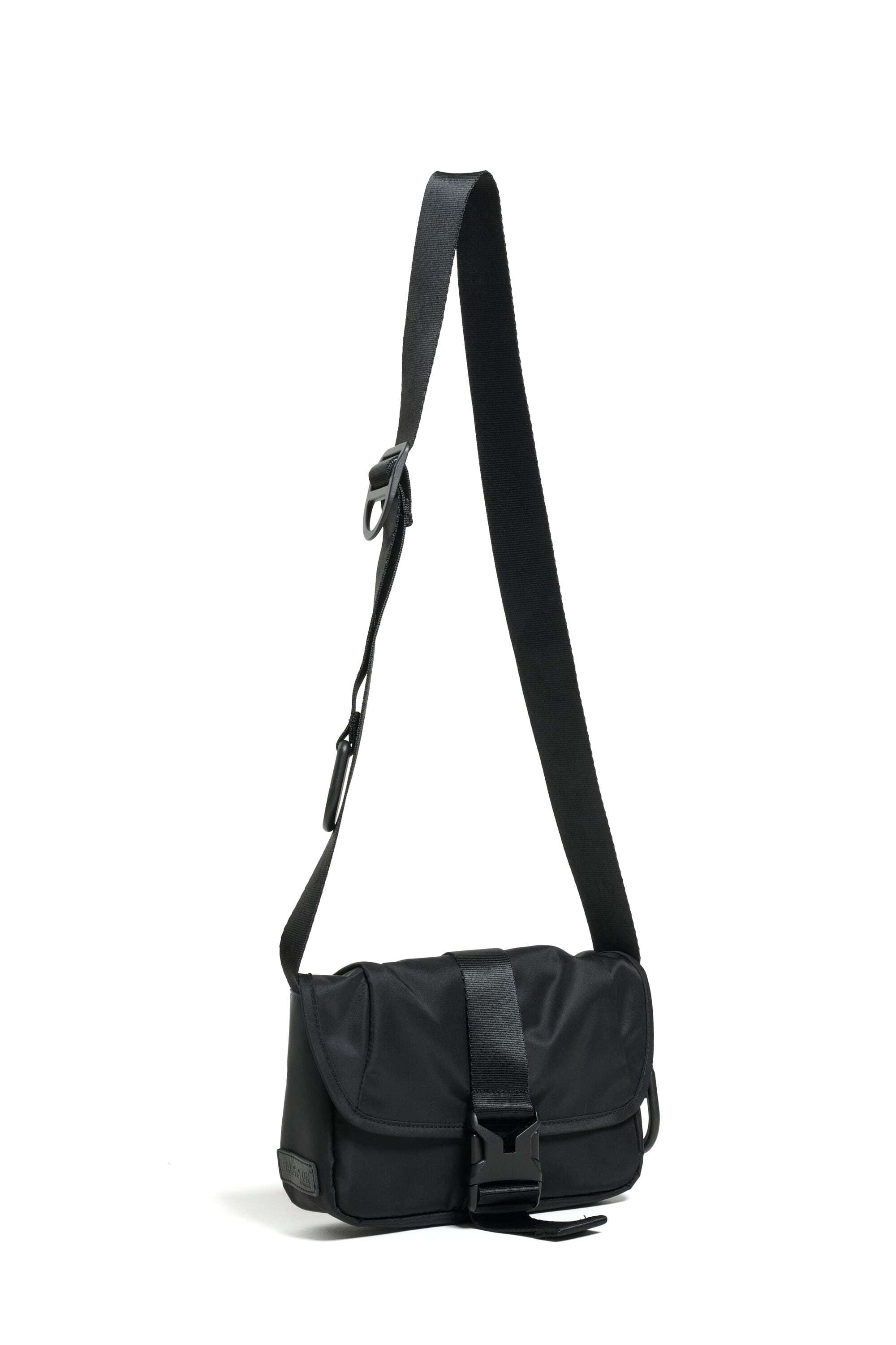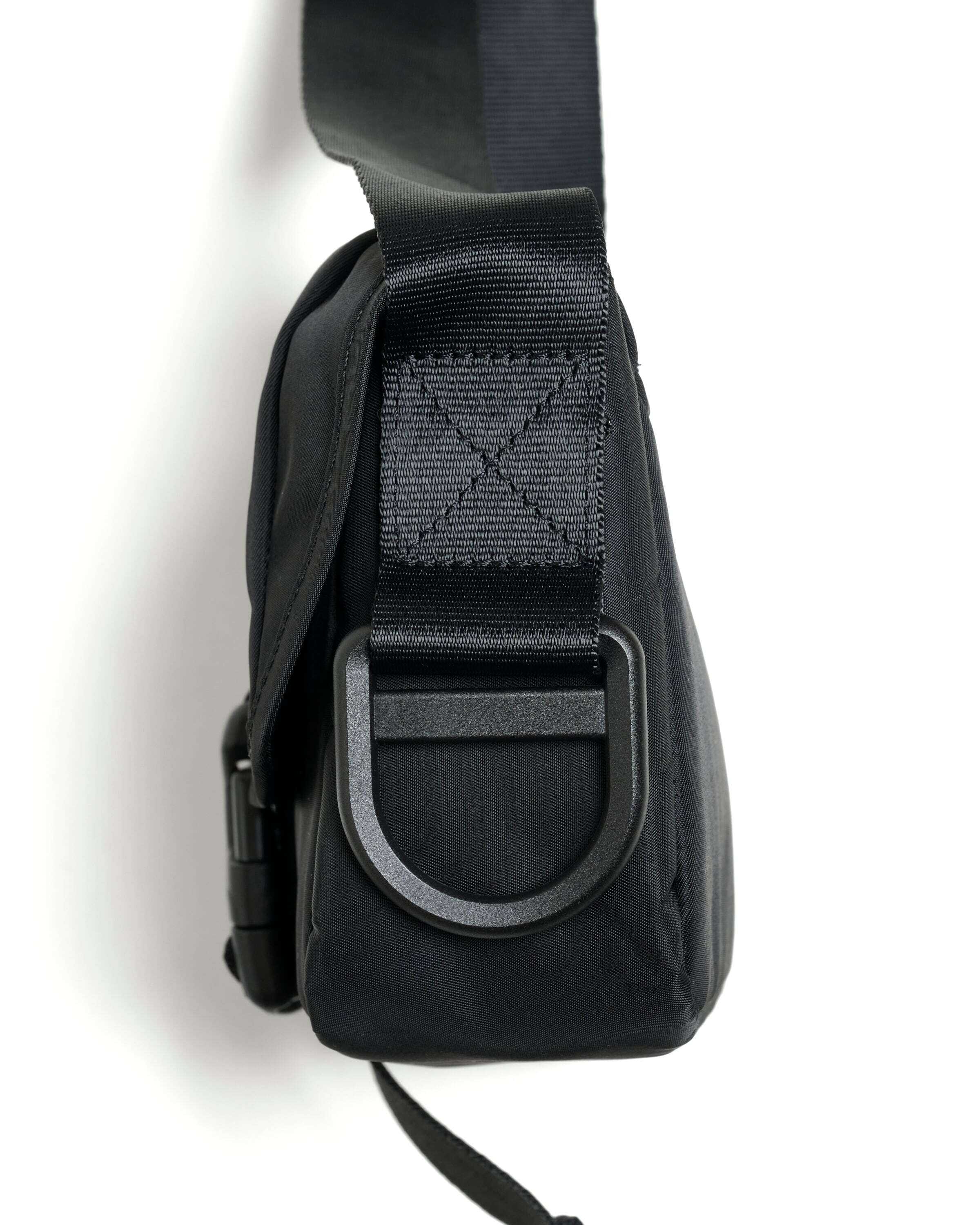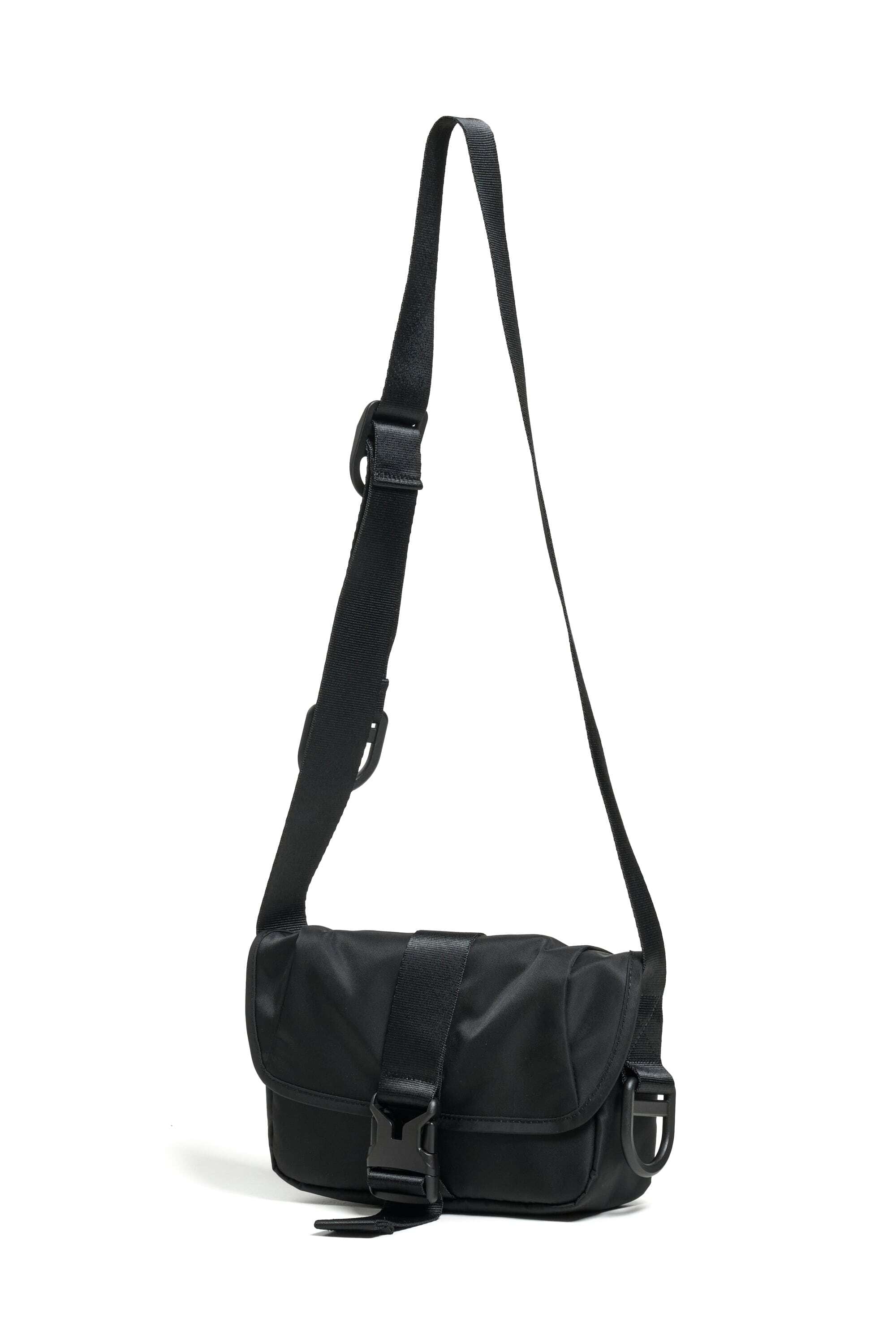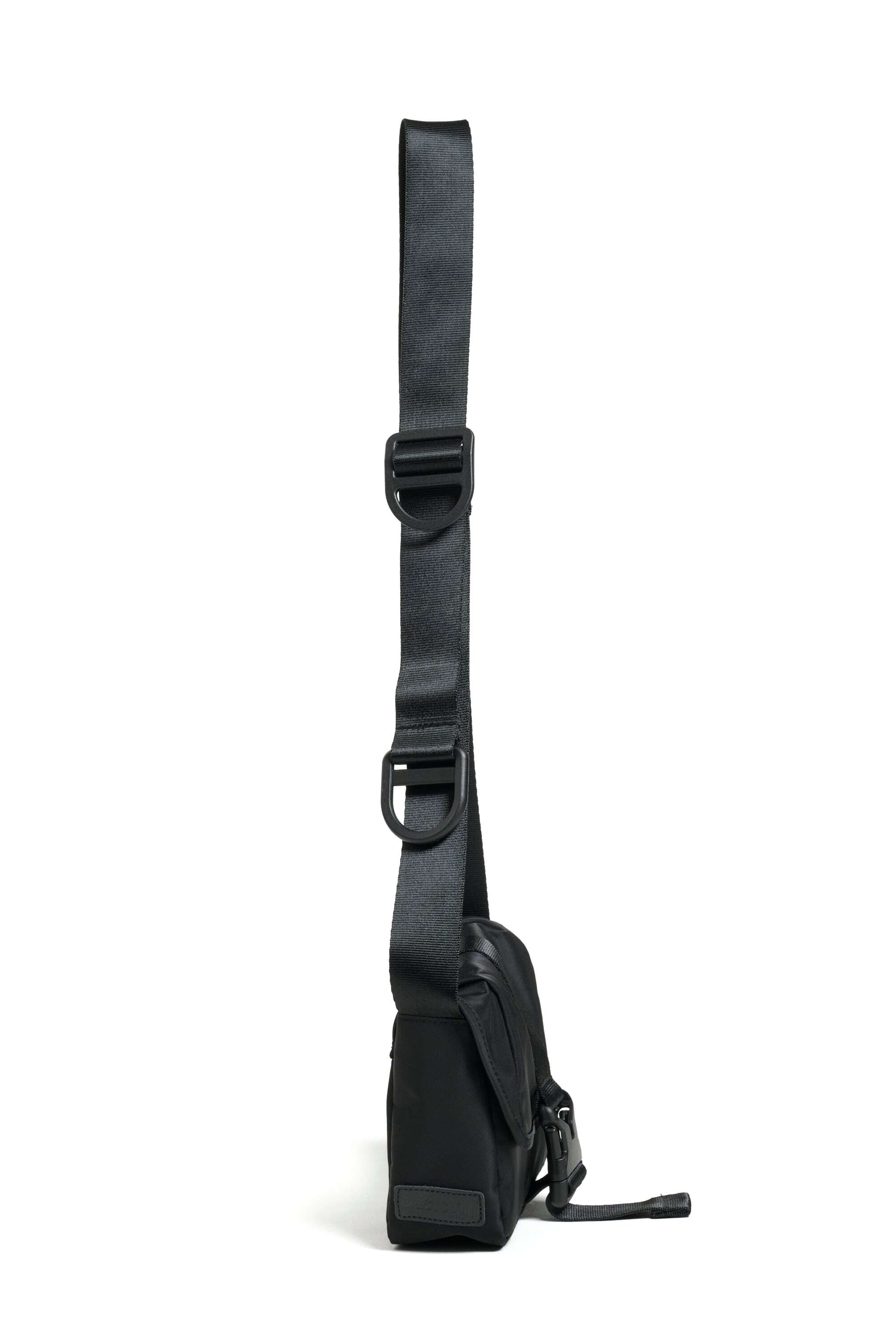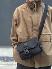 2025 FALL & WINTERコレクションの新作。コンパクトなボディのショルダーバッグは、普段使いからトラベルまで使い回しの利くサイズ感。中央の大きなバックルが印象的なデザインです。表面には撥水加工、裏面には AIR TIGHTNESS 加工を施し、気密性能を上げる為にシリコン樹脂を裏面コーティングしています。本体サイドとストラップにあるD管パーツには、キーホルダーやイヤホンケースなどが取り付けられます。内側にポケットが2つあります。