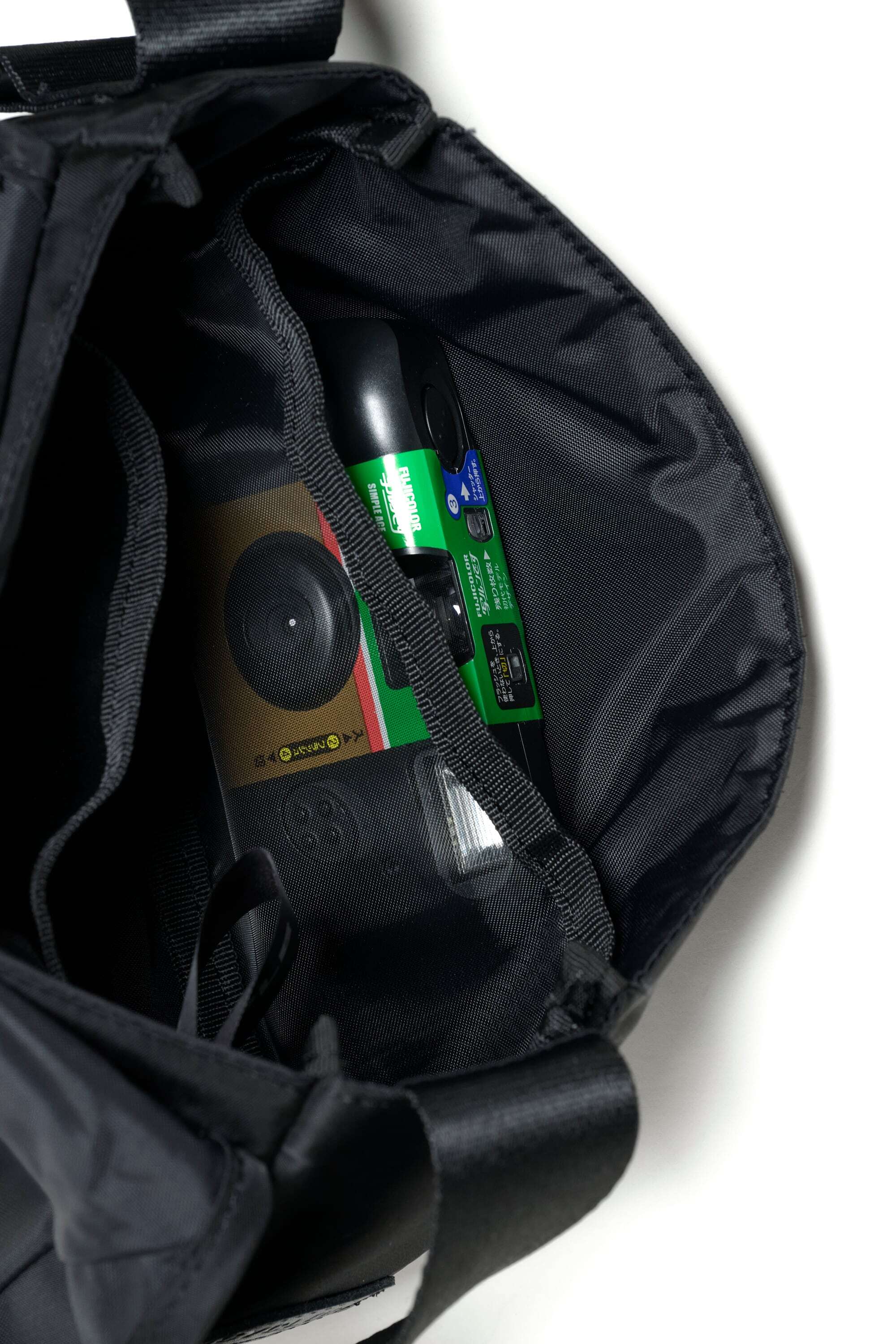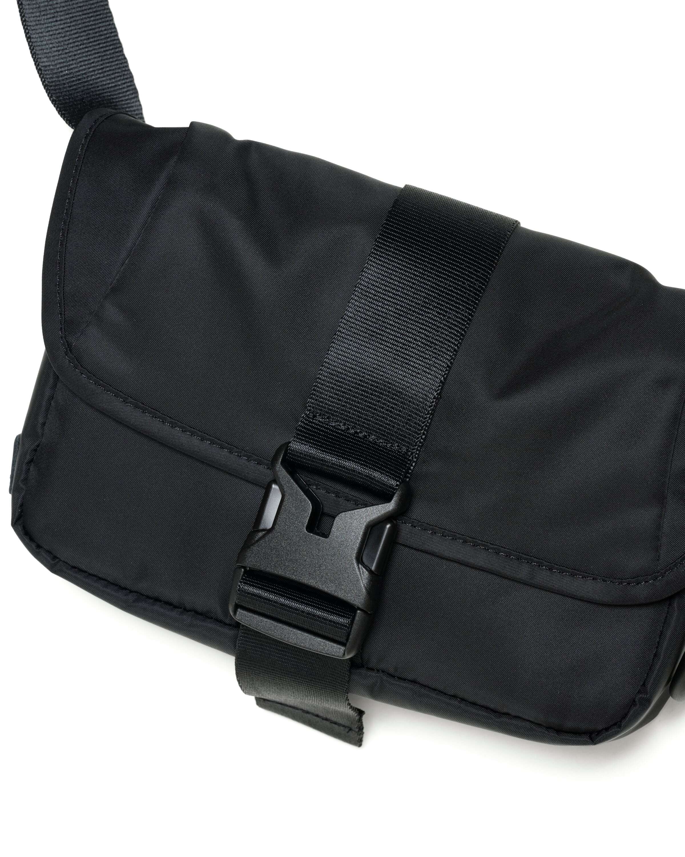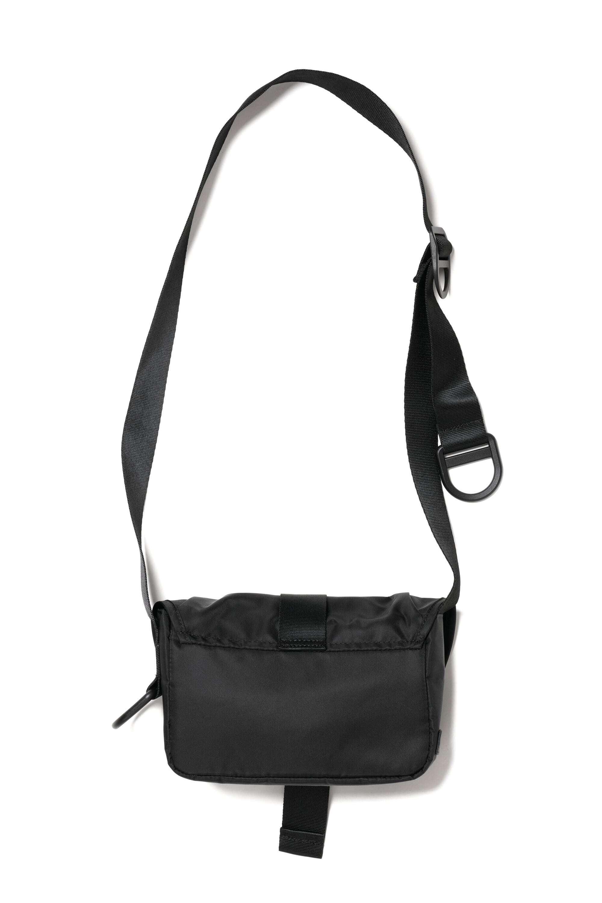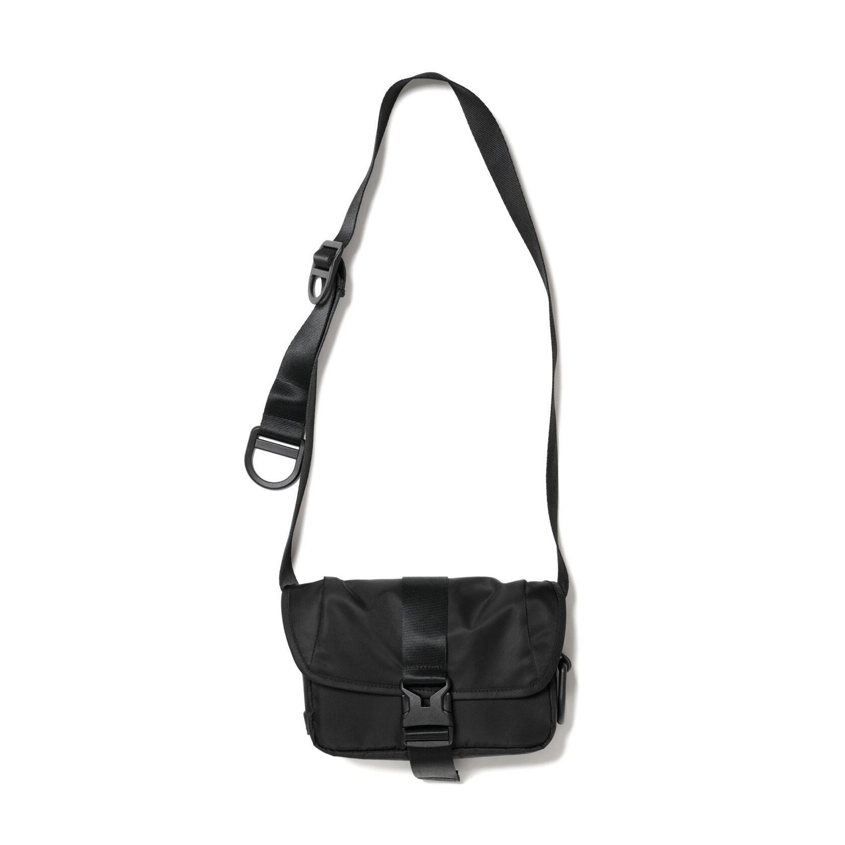 2025 FALL & WINTERコレクションの新作。コンパクトなボディのショルダーバッグは、普段使いからトラベルまで使い回しの利くサイズ感。中央の大きなバックルが印象的なデザインです。表面には撥水加工、裏面には AIR TIGHTNESS 加工を施し、気密性能を上げる為にシリコン樹脂を裏面コーティングしています。本体サイドとストラップにあるD管パーツには、キーホルダーやイヤホンケースなどが取り付けられます。内側にポケットが2つあります。