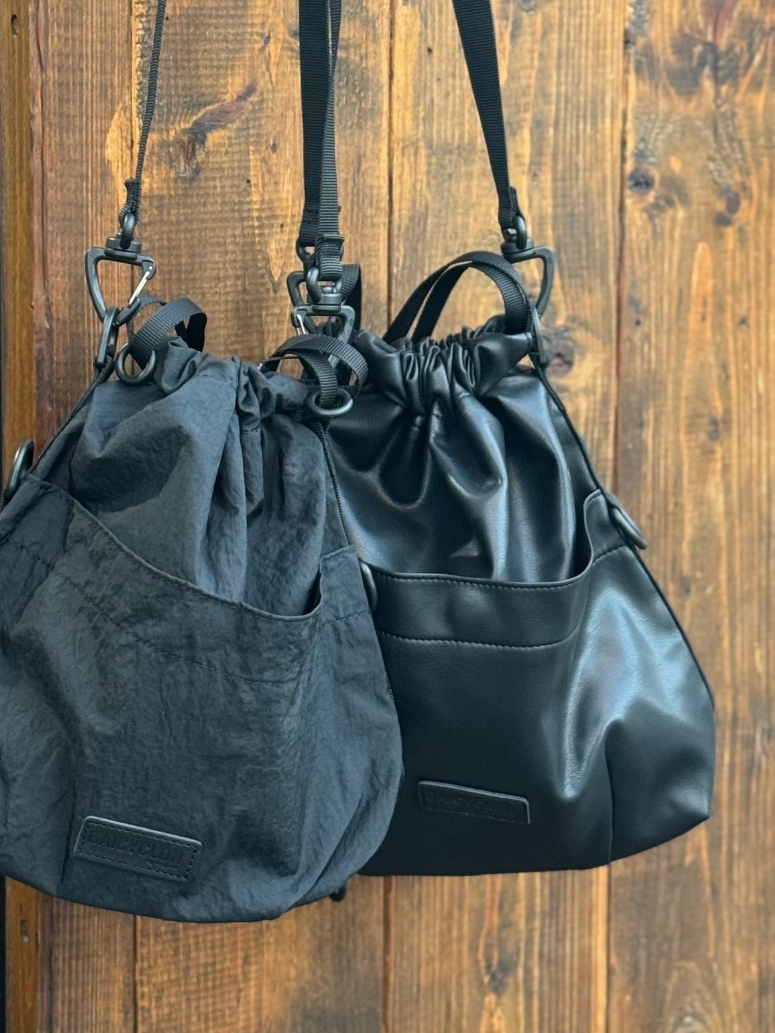 2025 FALL & WINTERコレクションの新作。人気の巾着型バッグで、柔らかく、しなやかなシンセティックレザー素材を使用しています。ショルダーバッグとして使うほか、ストラップを外して手持ちの巾着バッグとしても使える2WAY仕様。フロントポケットは、出し入れが多いアイテムを収納するのに便利。本体は広めの底マチ設計でザクザク荷物が入ります。500mlペットボトルや長財布などもすっぽり収納可能です。内側の後面部分にポケットを搭載しております。