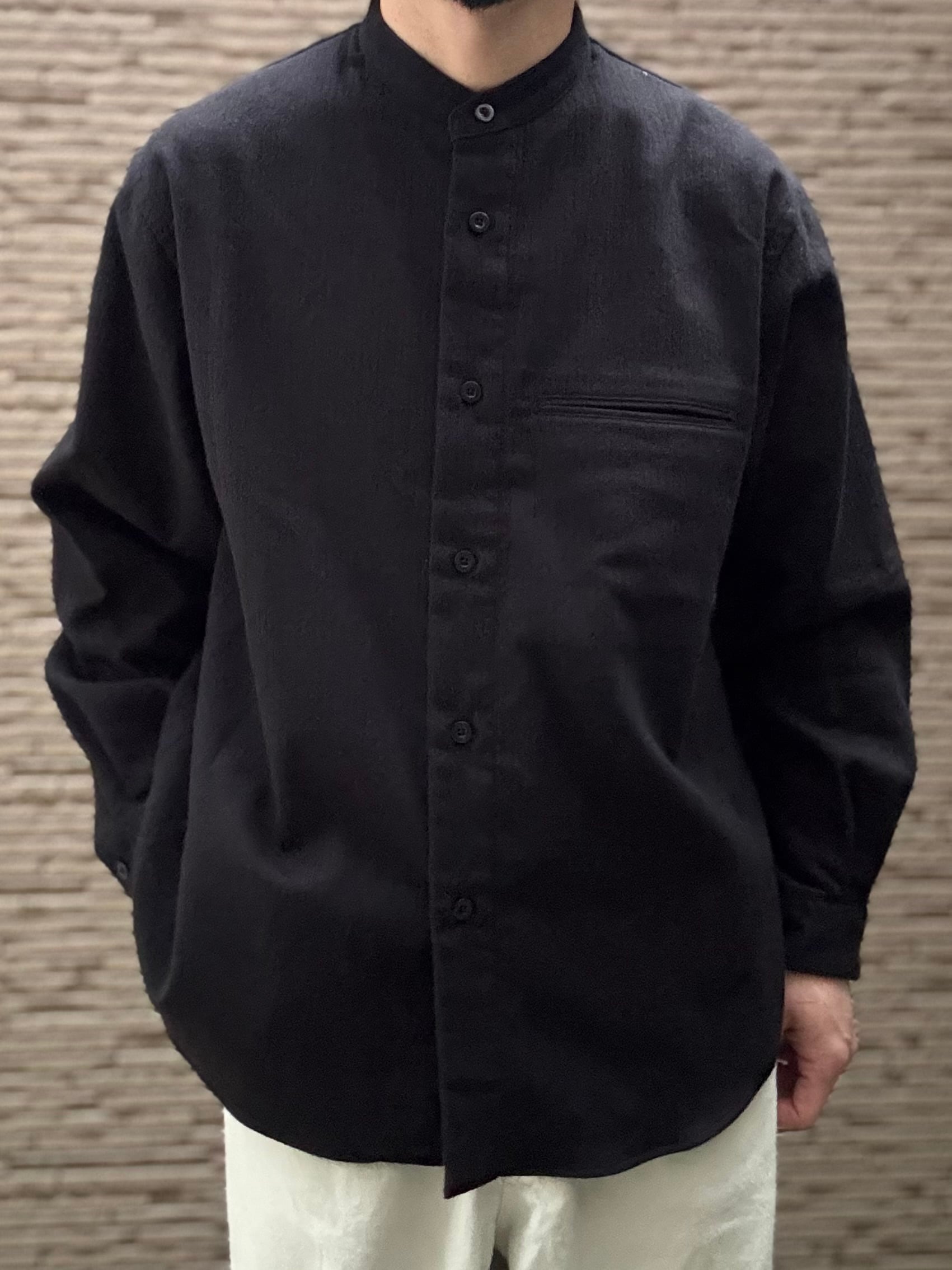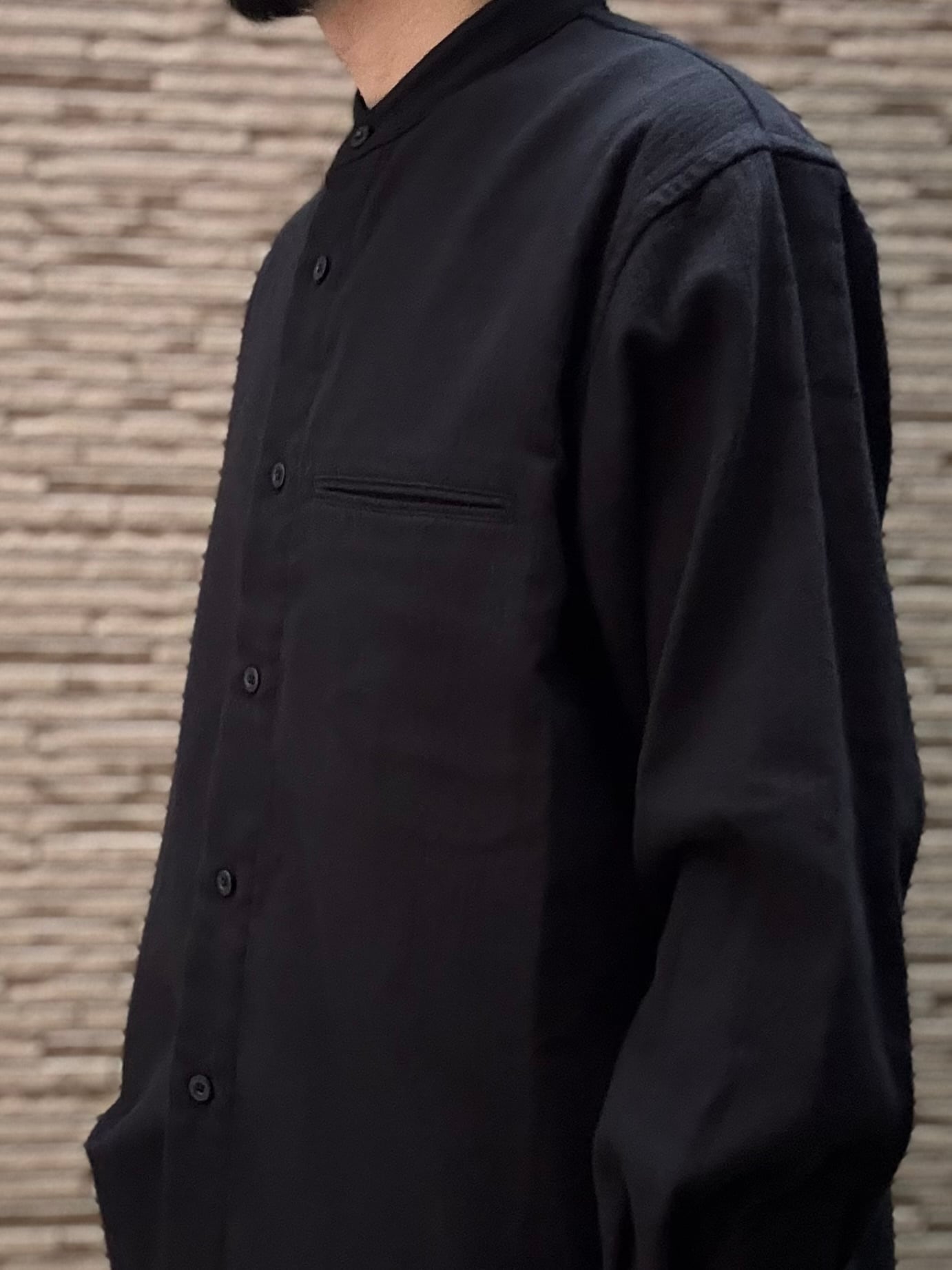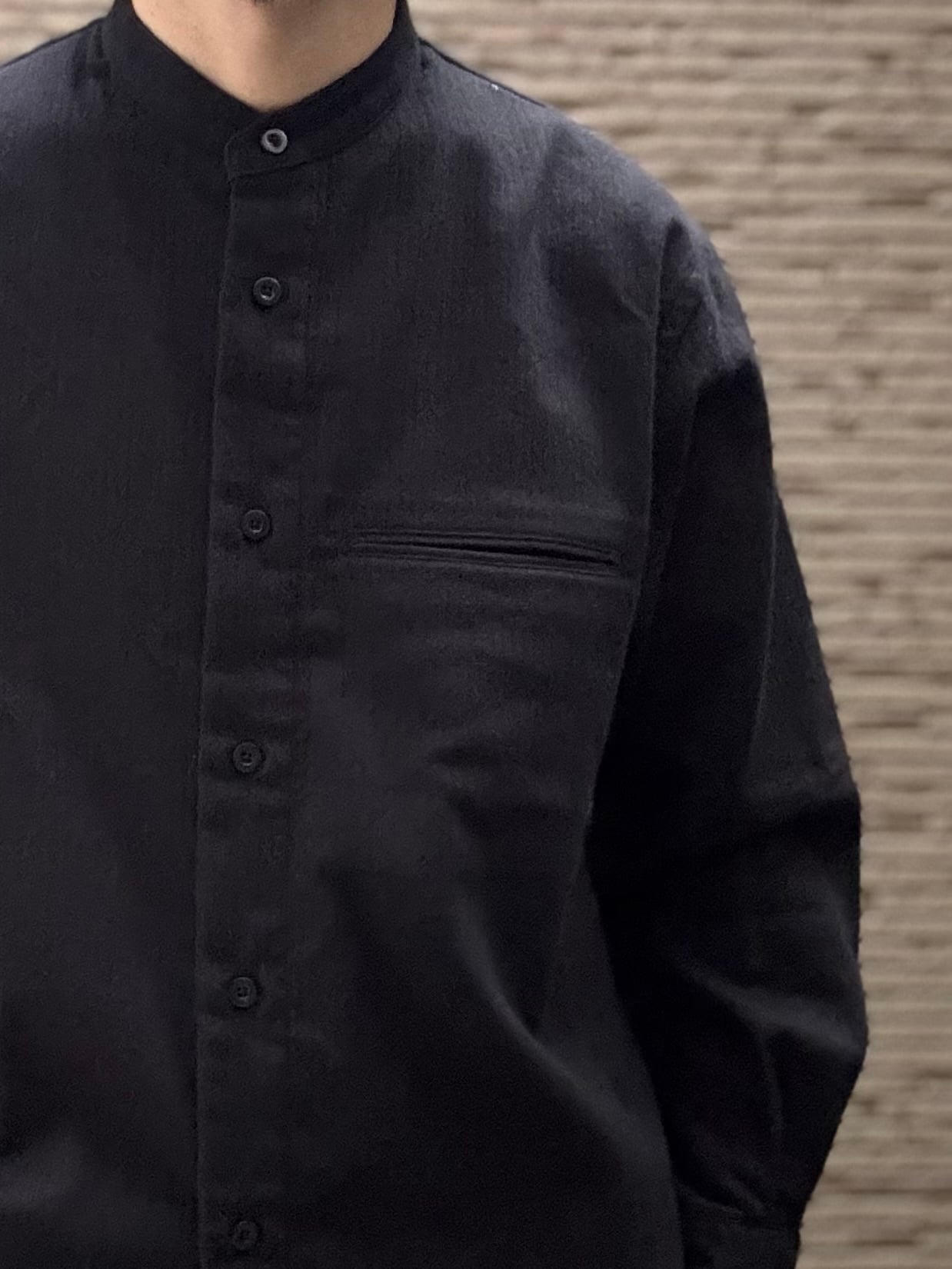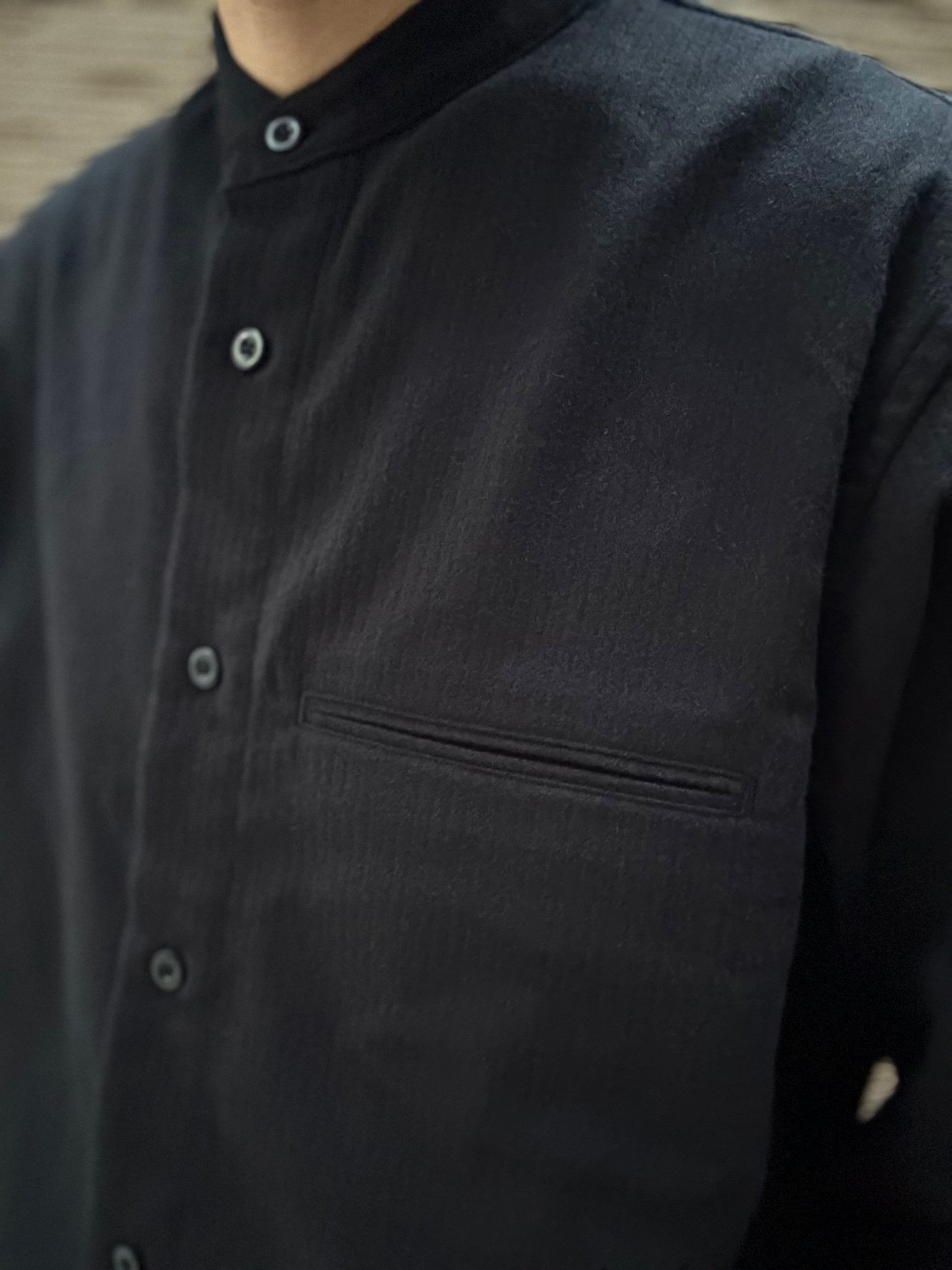 厚手のしっかりしたコットンピケ素材を使用したバンドカラーシャツ。素材の特徴でもある縦畝とふっくら起毛した表情が季節感のある一枚に仕上がっています。シンプルなデザインですが、胸ポケットを両玉縁で仕上げるなど各所にこだわりが見えます。スッキリと見えるバンドカラーに程よくゆったりとしたサイズ感が、落ち着いた大人の雰囲気です。