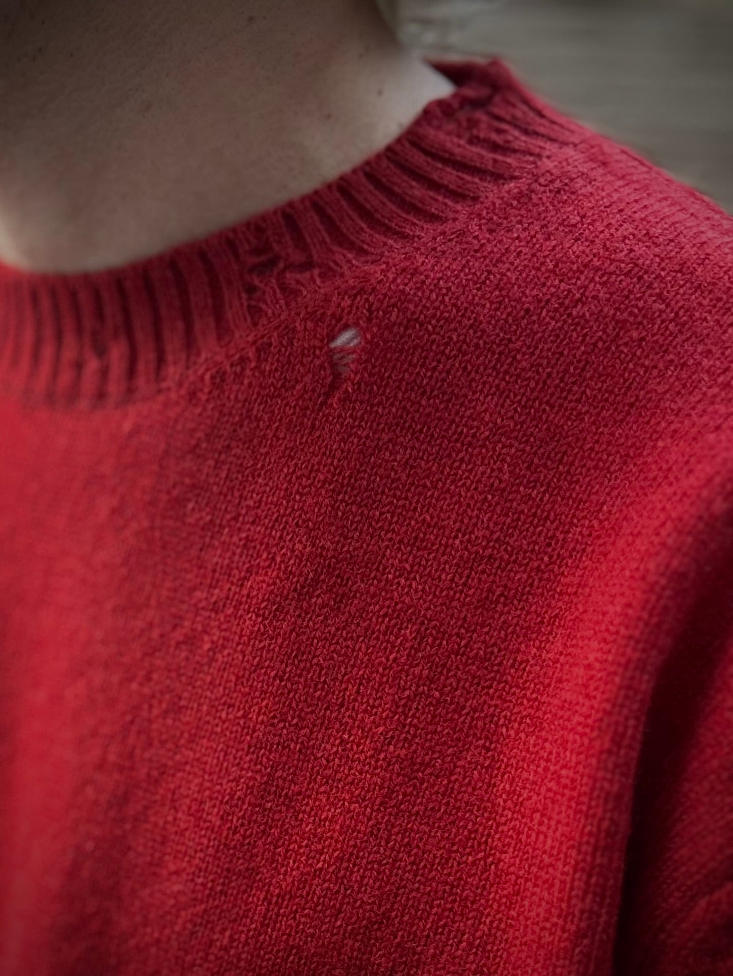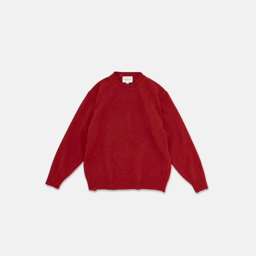 シェットランドウールを使用したダメージライクプルオーバーニット。穴を開けるダメージ加工ではなく、編みの段階で糸を飛ばすテクニックを使いダメージ感を表現しています。時代のムードをカジュアルになり過ぎないバランスで制作しています。