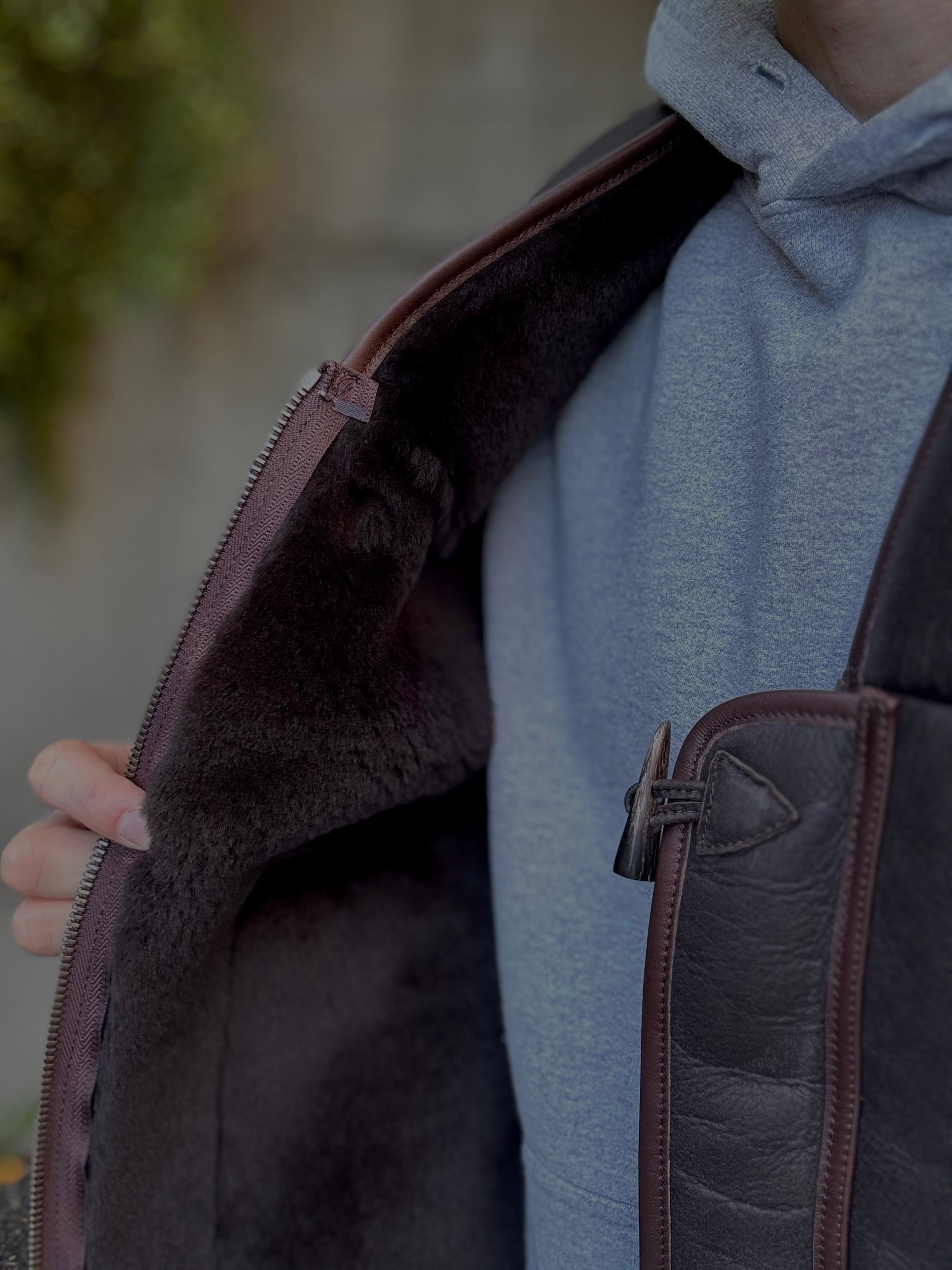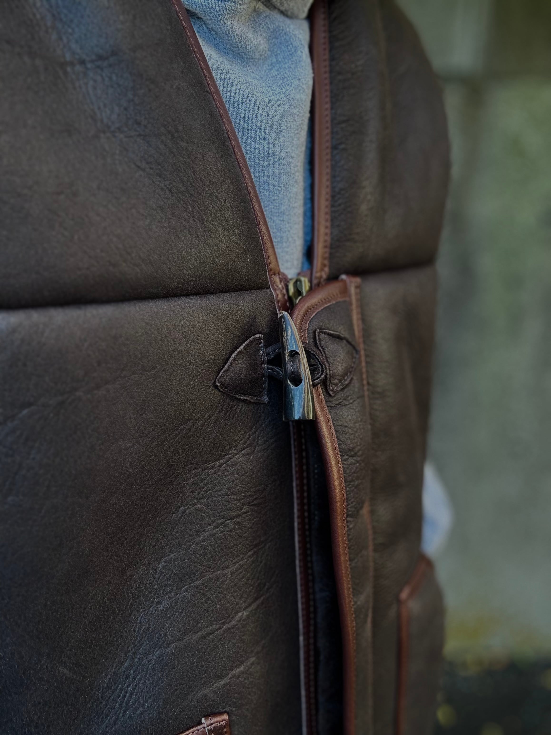 原皮の調達から皮革のなめし工程まで、全てが工房から120km以内のエロー地方とアヴェロン地方で調達されています。伝統を受け継ぎ熟練された職人によって作られた最高品質のベスト。ムートンはしっかりと厚みがありながら見た目以上に軽く、また、ラムウールを使用しているので毛の繊維が細くてしなやか。成羊よりも肌触りが非常に柔らかく滑らかです。そして、ラムウールの特徴として成羊ウールよりも保温性が高いのは言うまでもなく、非常に防寒に優れています。フロントはファスナーの比翼仕立てで、水牛の角で作ったトグルが象徴的なデザインになっています。