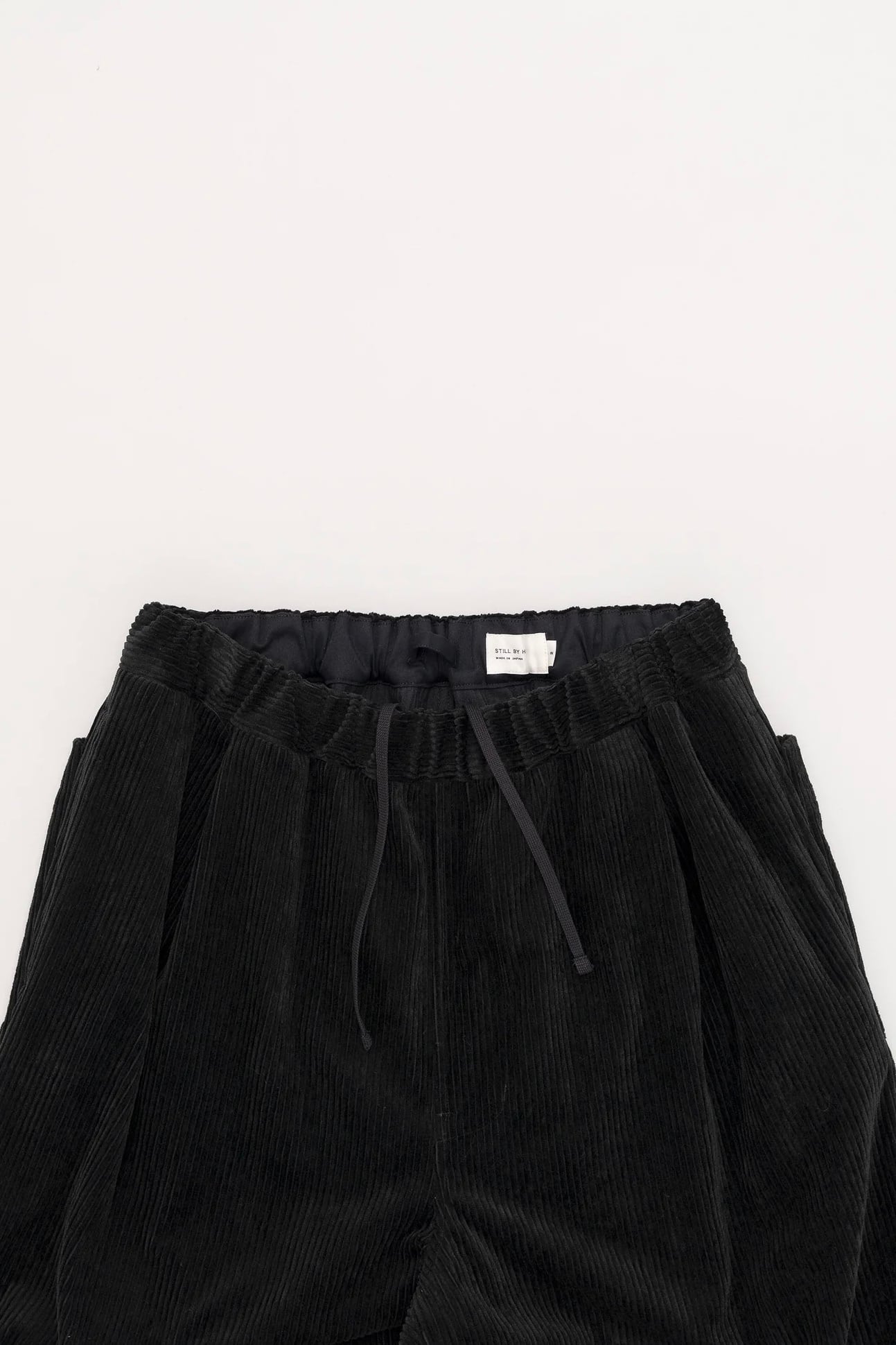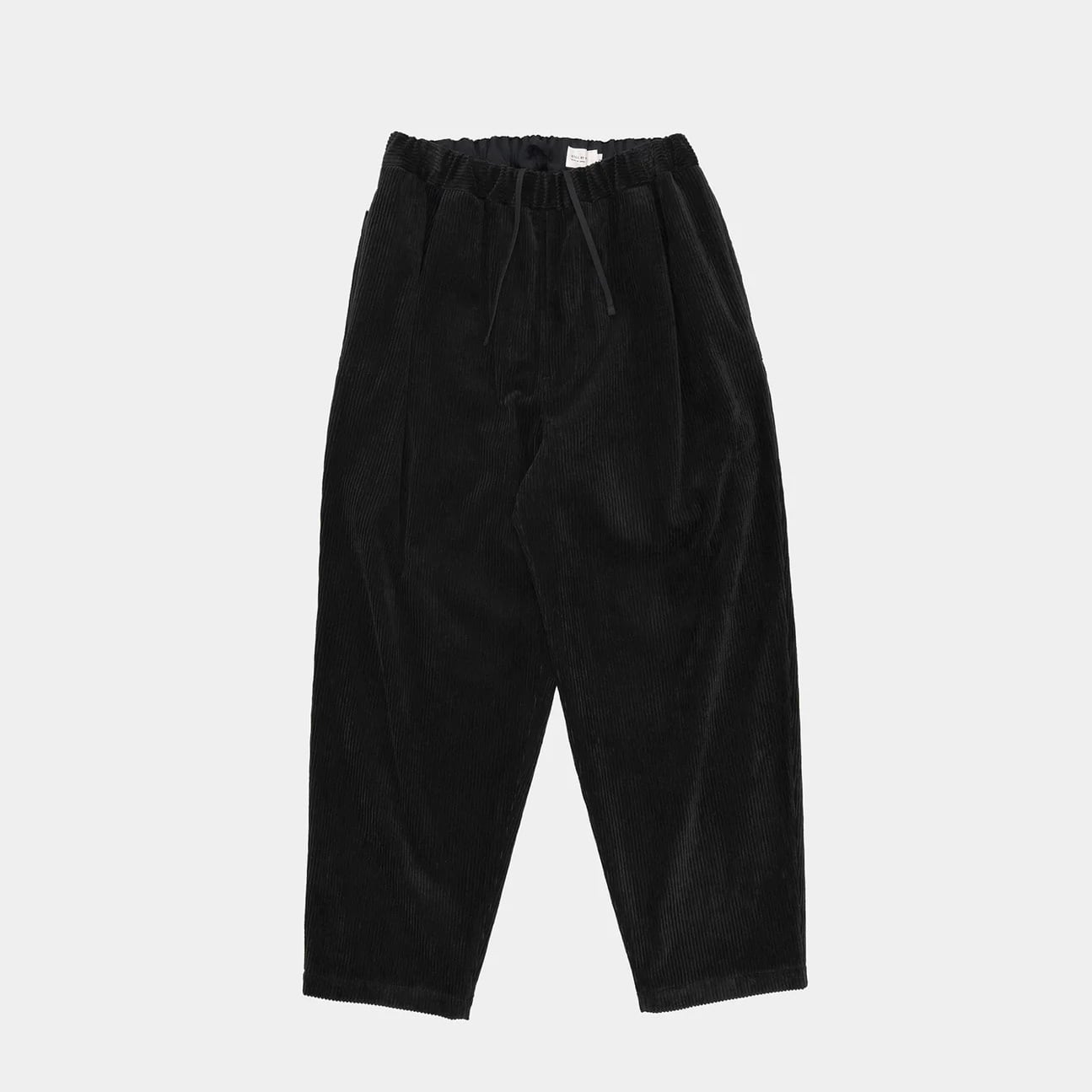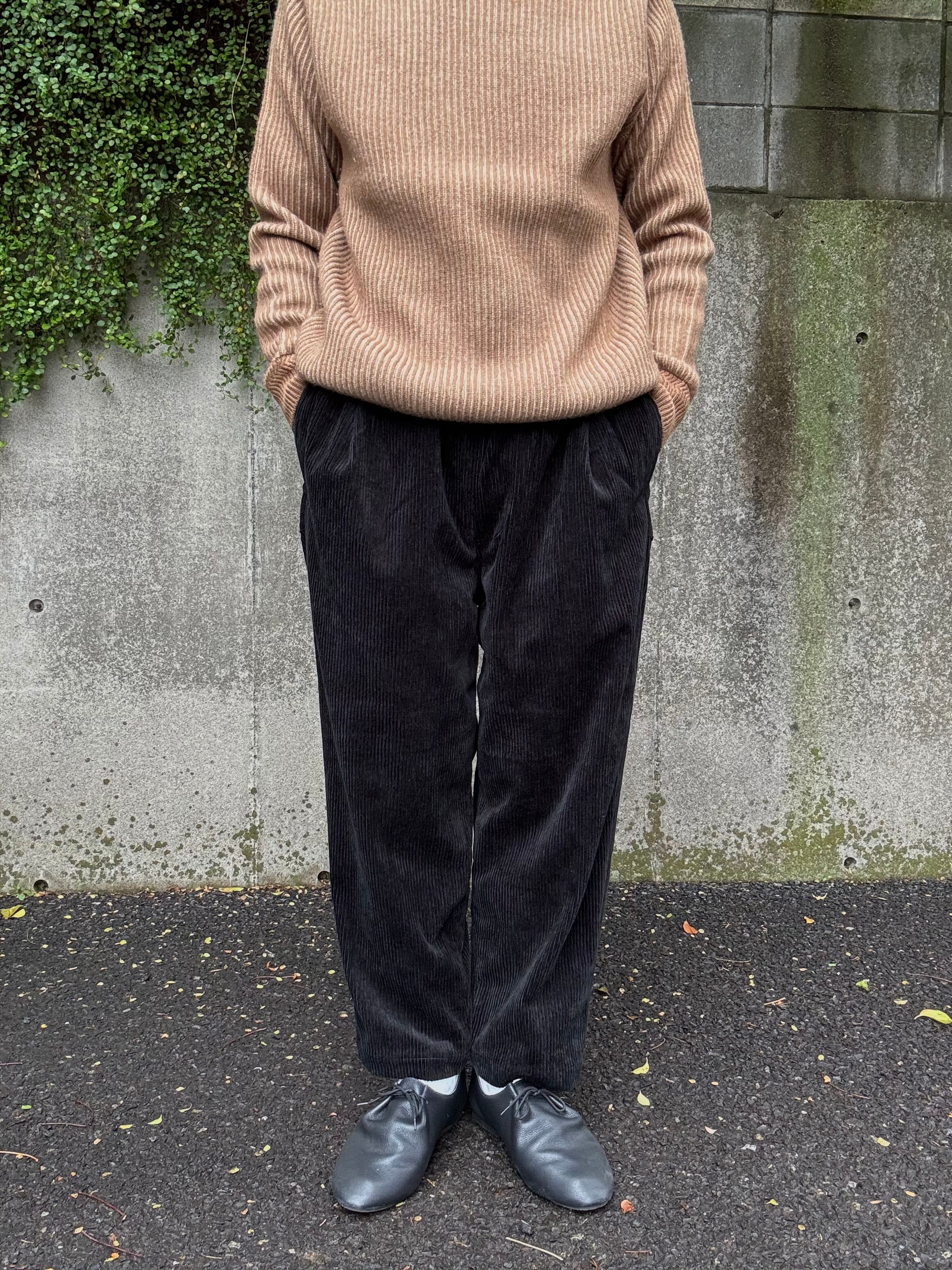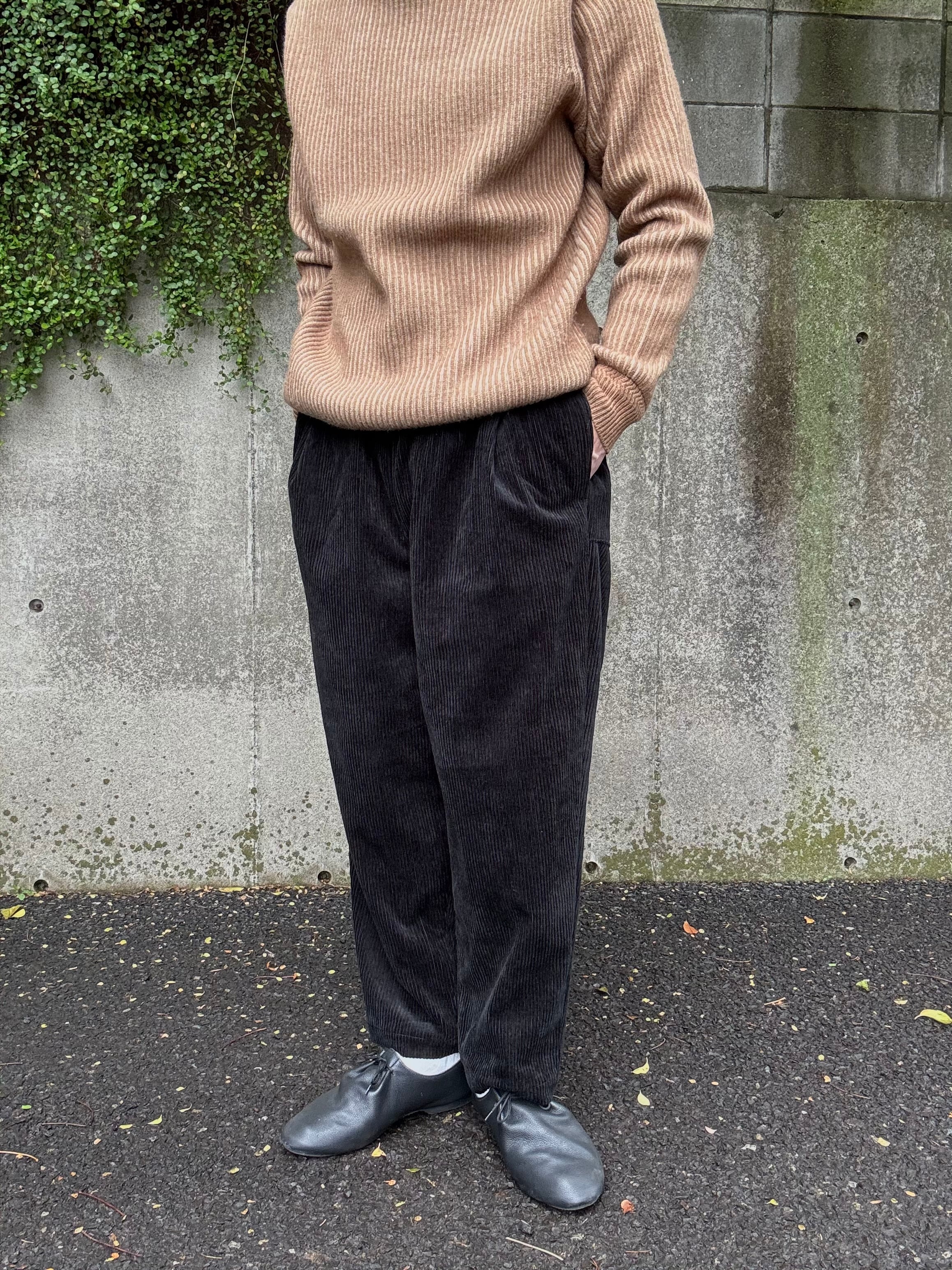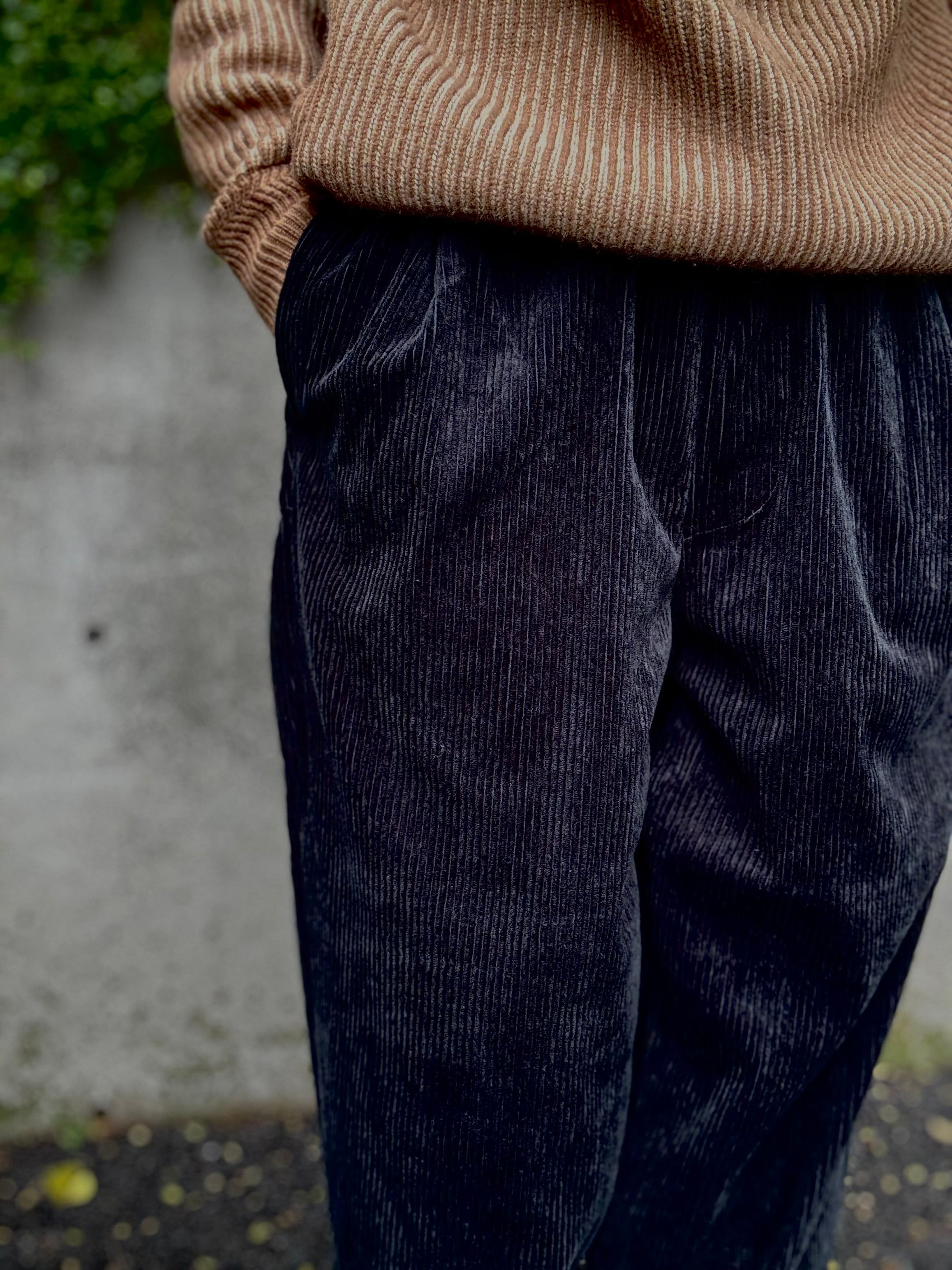 パイル部分に綿/レーヨンの混紡糸を使用した柔らかな風合いのコーデュロイイージーパンツ。程よくテーパーを効かせたリラックスシルエットで、ウエストはスピンドルコード仕様となります。合わせやすく気軽に穿けるデザインに仕上がっていますが、素材とシルエットの良さできちっとしたスタイリングにもマッチするイージーパンツです。