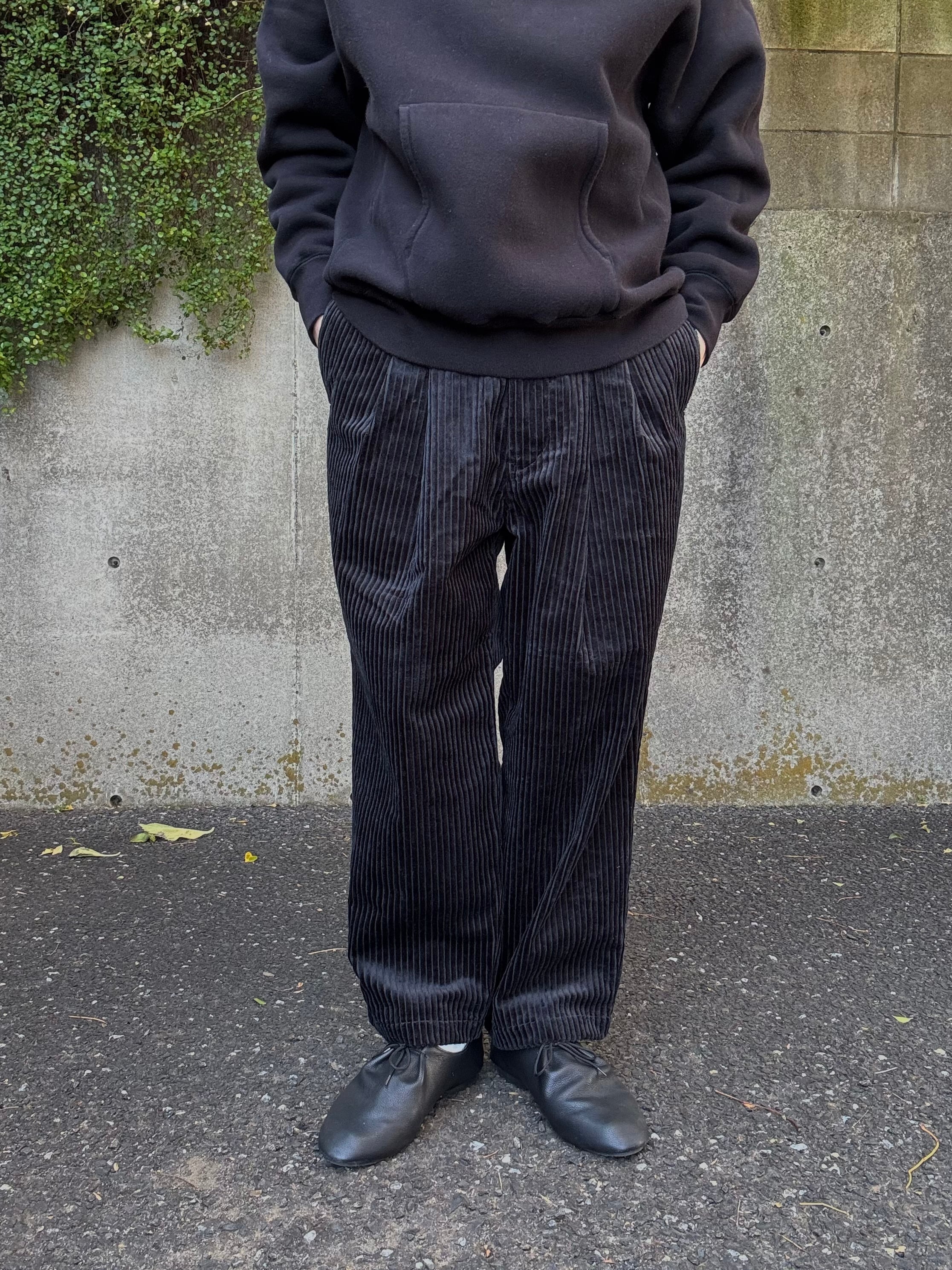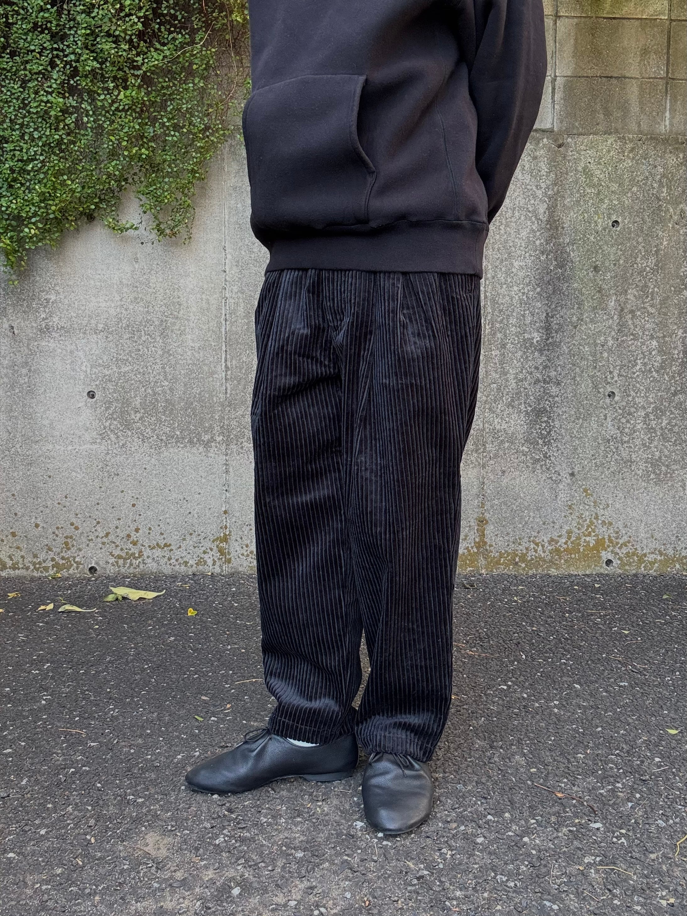 3.5Wという太畝のコーデュロイを使用したパンツ。タックが前に出るような独特な設計で、ボリュームのある適度な中太シルエットですが、落ち感がある素材のためすっきりと見えます。素材に存在感があるので、さりげなくアピールができるパンツです。