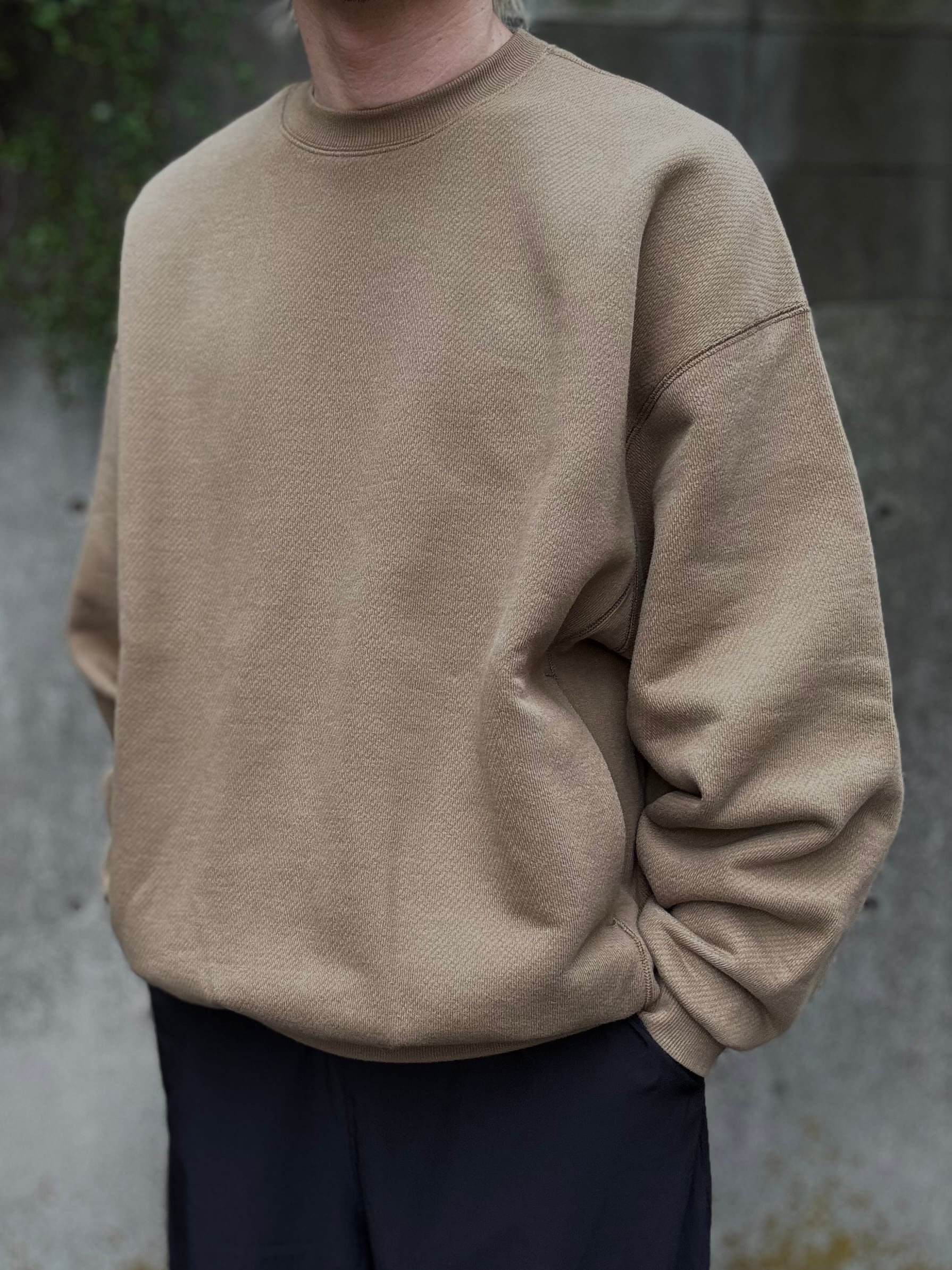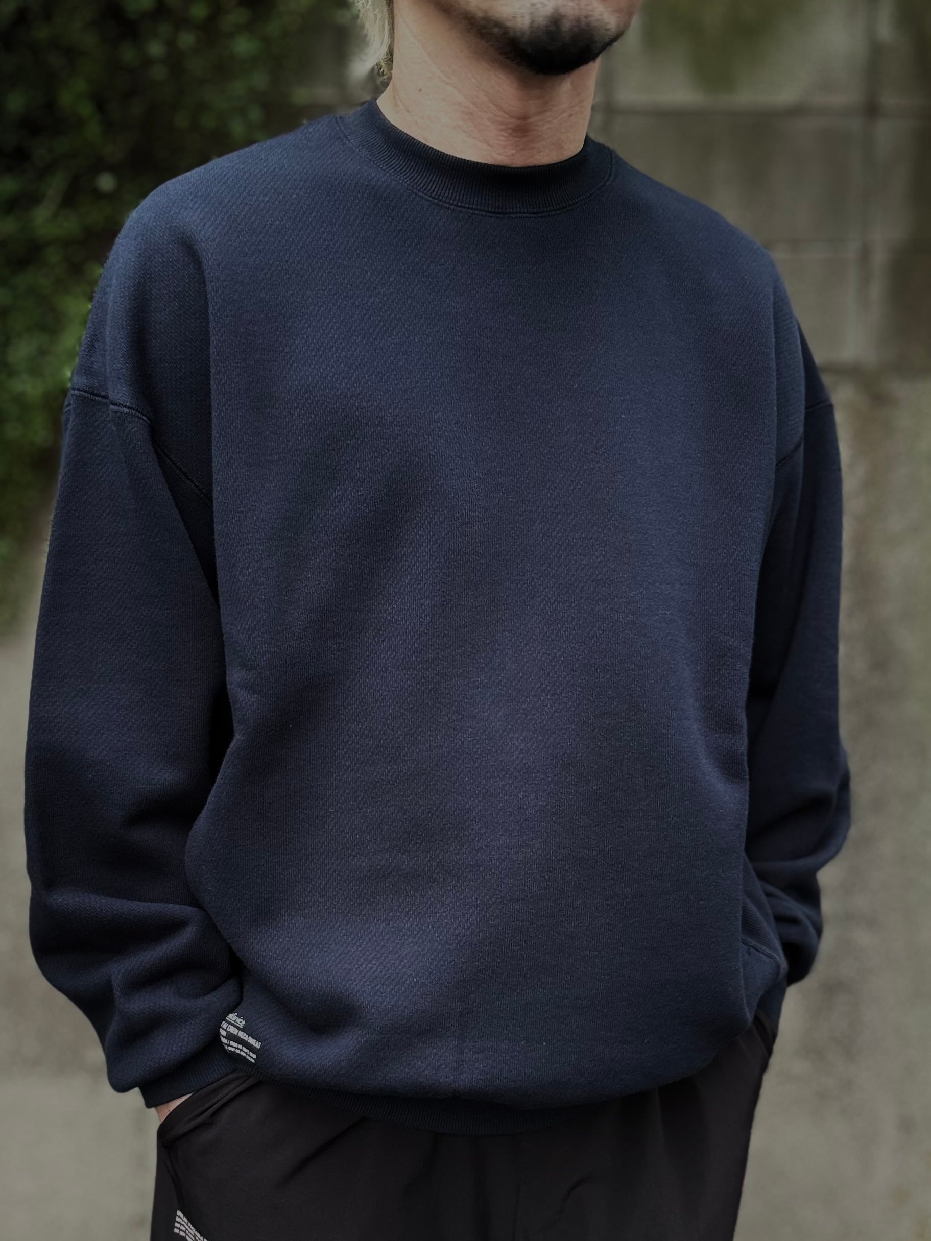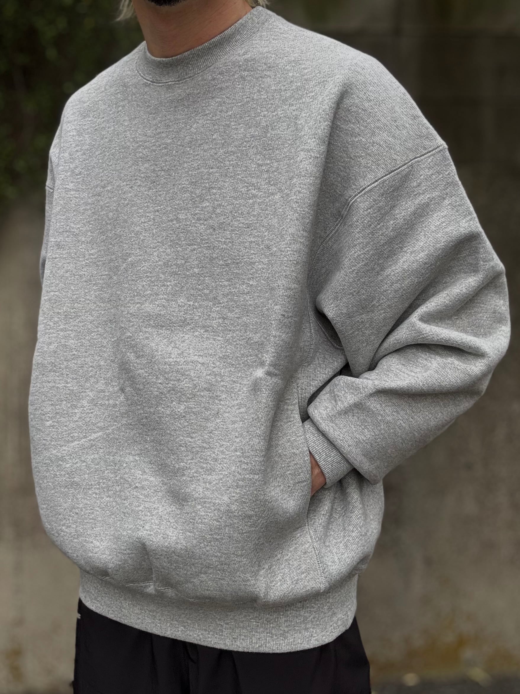 しっかりとしたタフな素材を使ったクルーネックスウェット。生地の素材にはしっかりと目が詰まった肉厚な裏毛素材を採用。また、特徴的な編み目もポイントになっています。ボディのサイドには幅広のリブ素材を配し、さらにサイドポケットも装備しています。FreshServceらしい身幅からアームまでゆったりとしたルーズフィットで一枚で着回せるトップスです。