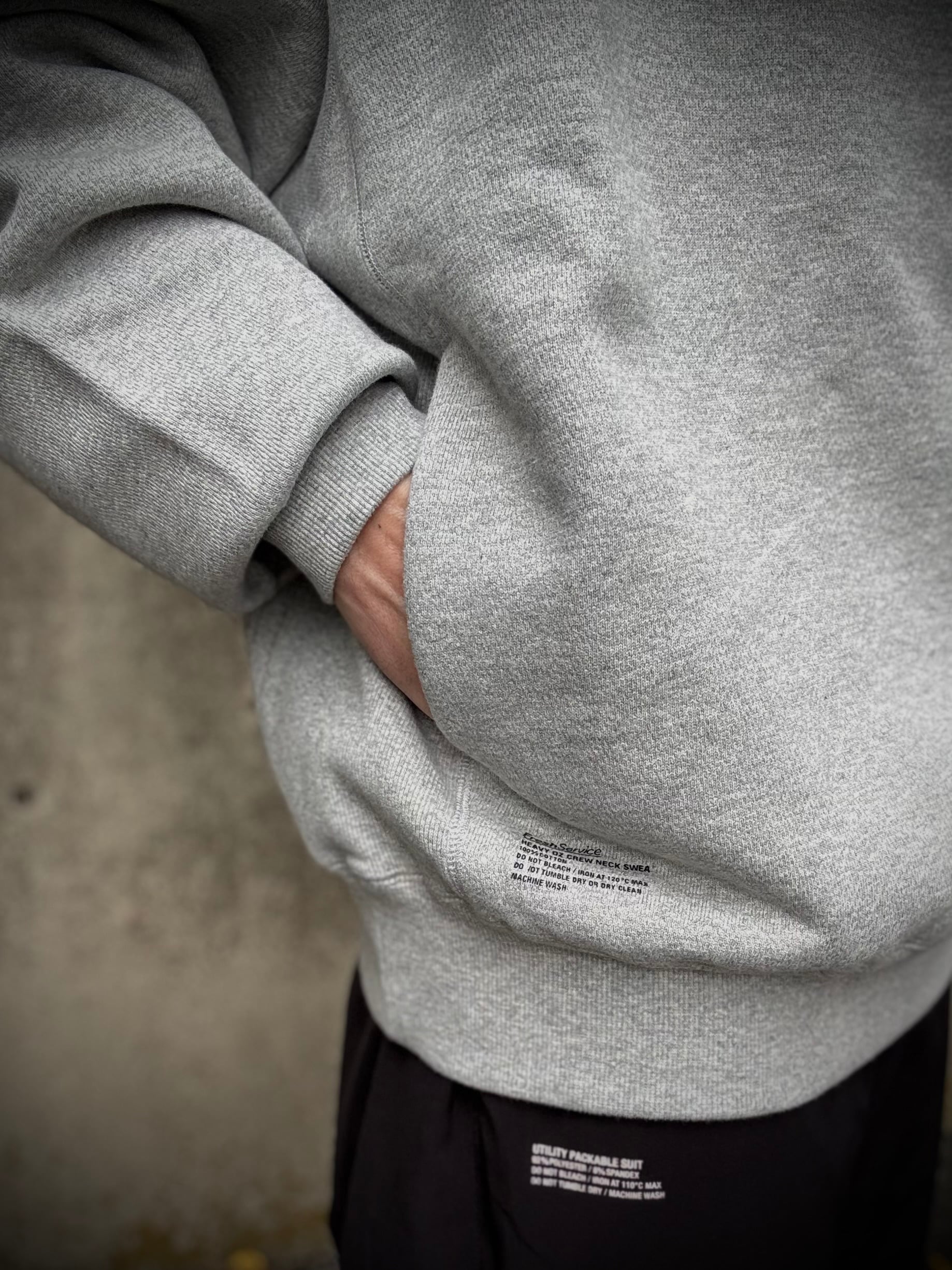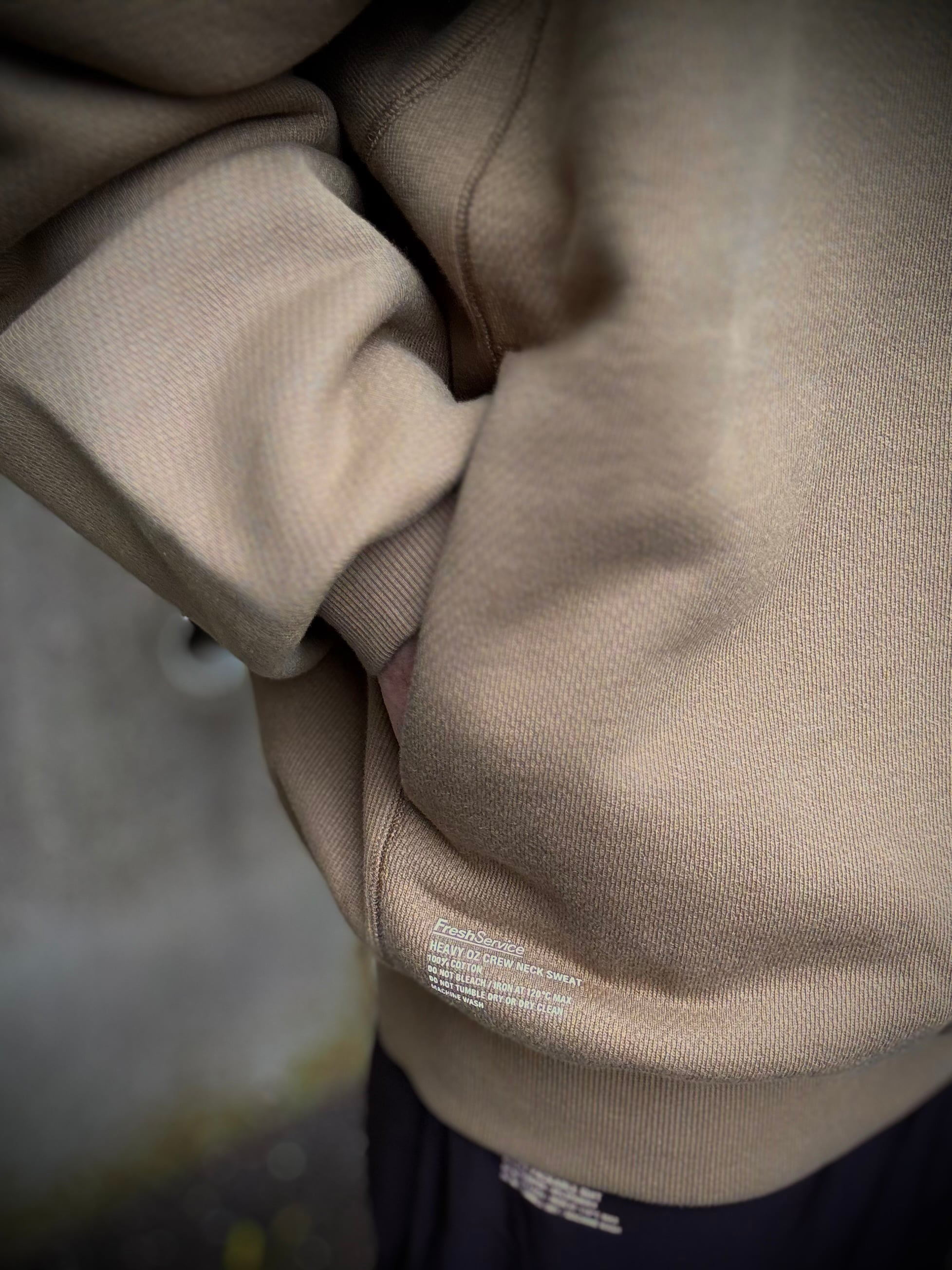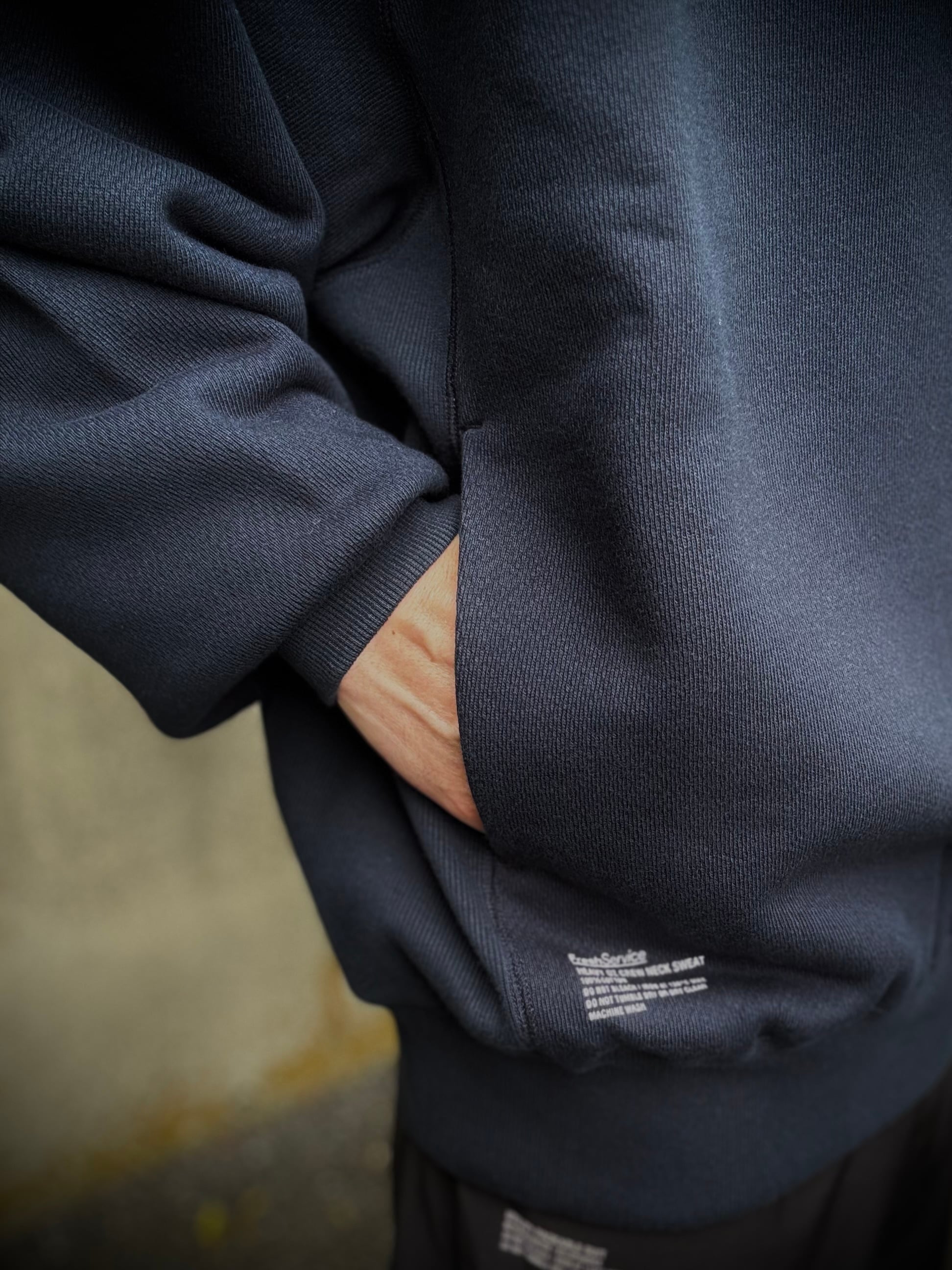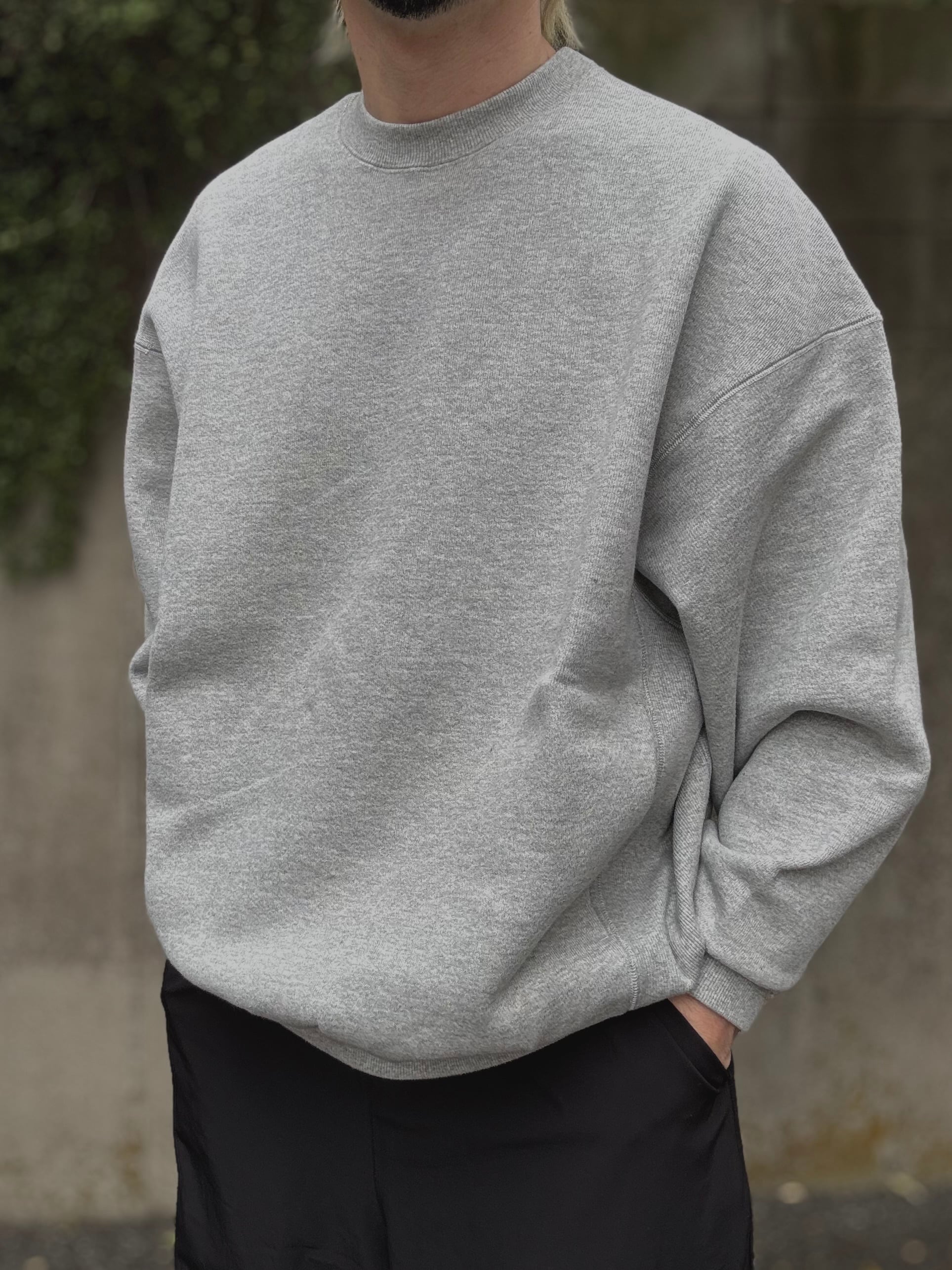 しっかりとしたタフな素材を使ったクルーネックスウェット。生地の素材にはしっかりと目が詰まった肉厚な裏毛素材を採用。また、特徴的な編み目もポイントになっています。ボディのサイドには幅広のリブ素材を配し、さらにサイドポケットも装備しています。FreshServceらしい身幅からアームまでゆったりとしたルーズフィットで一枚で着回せるトップスです。