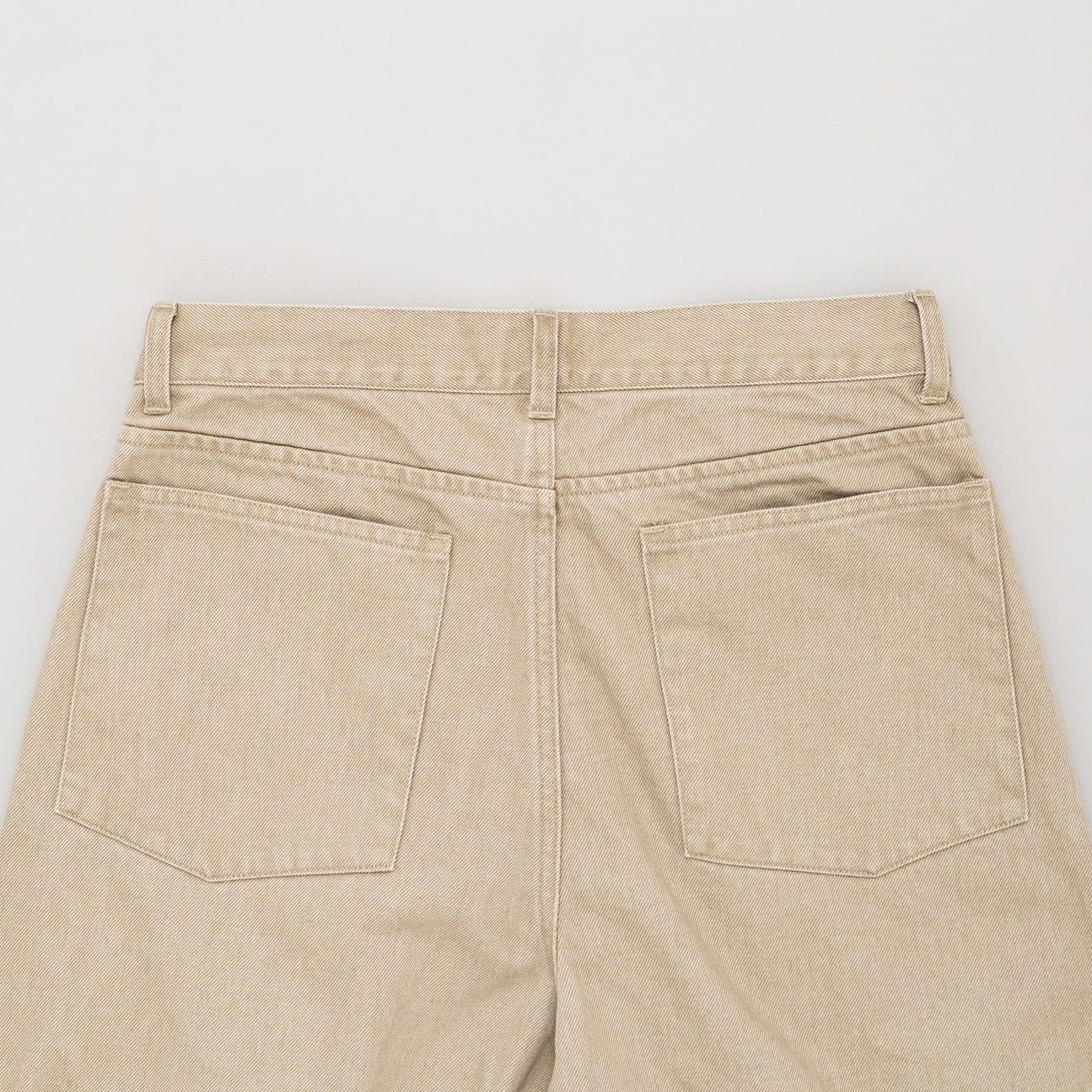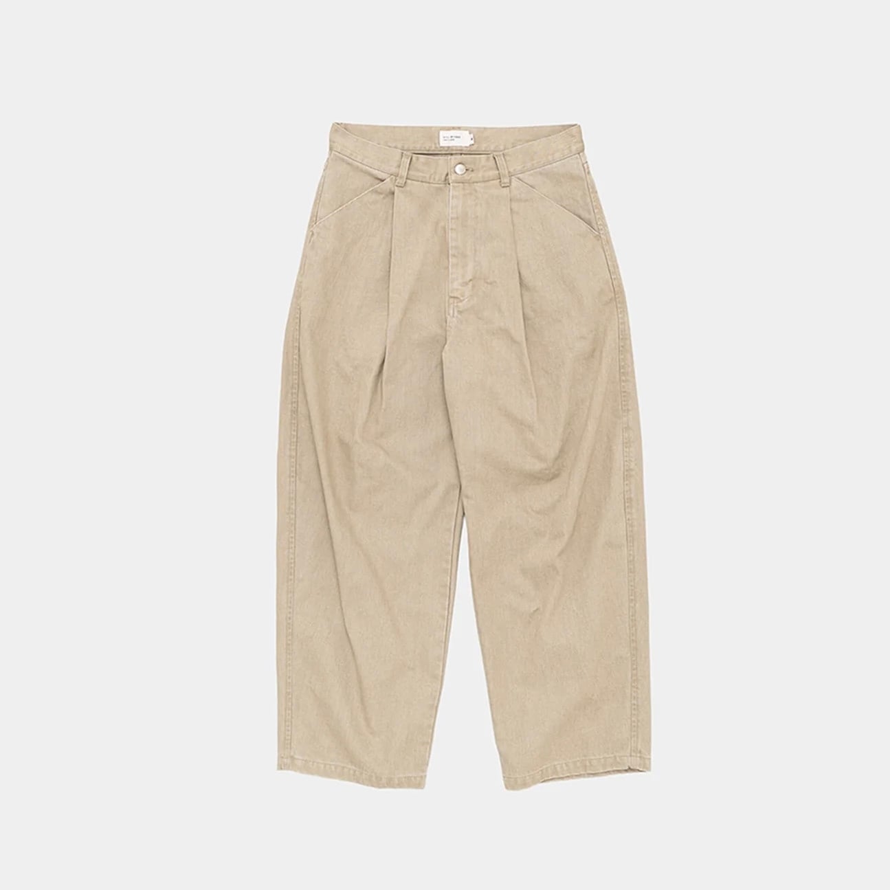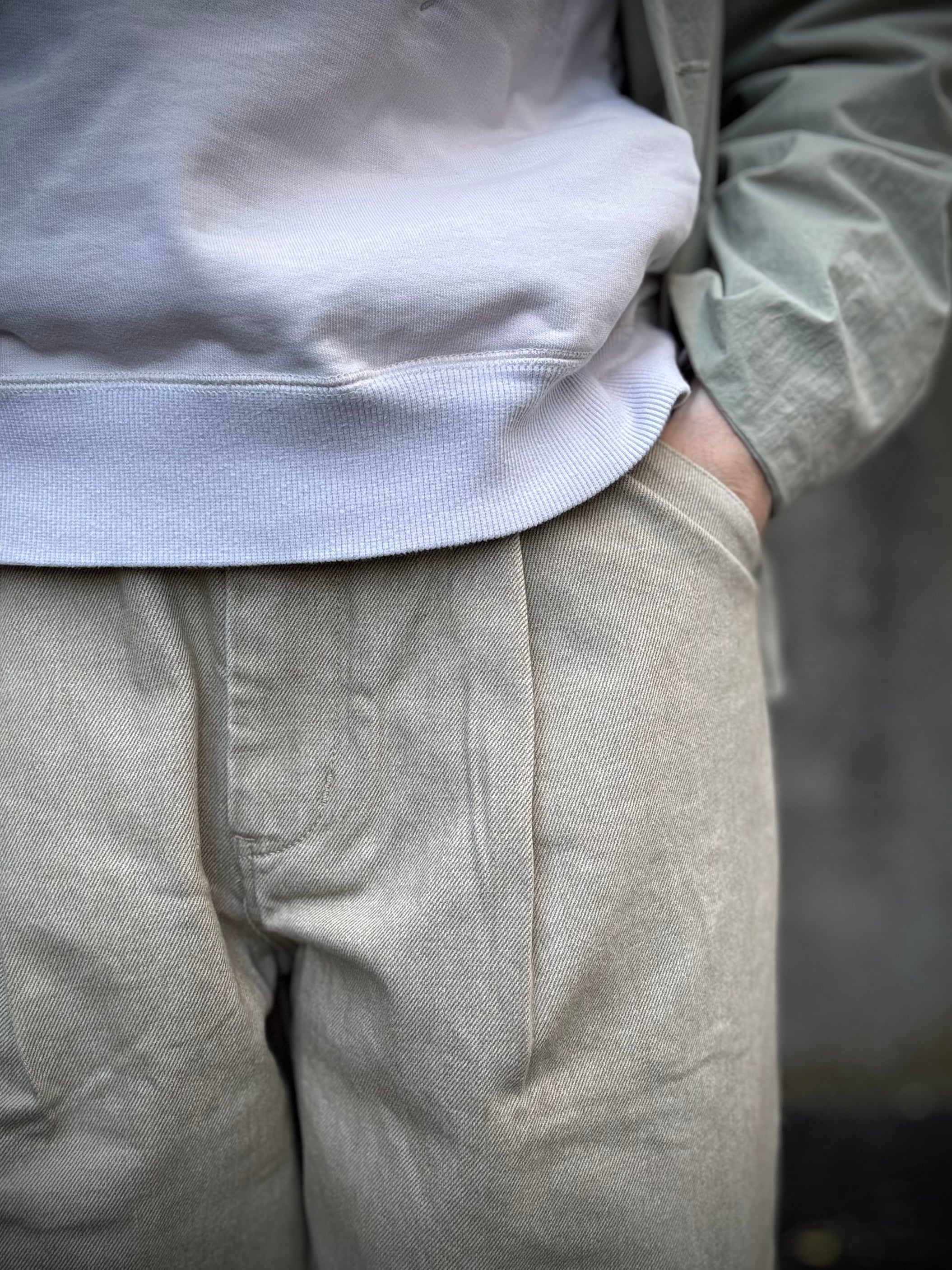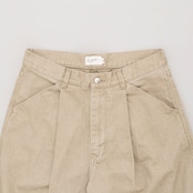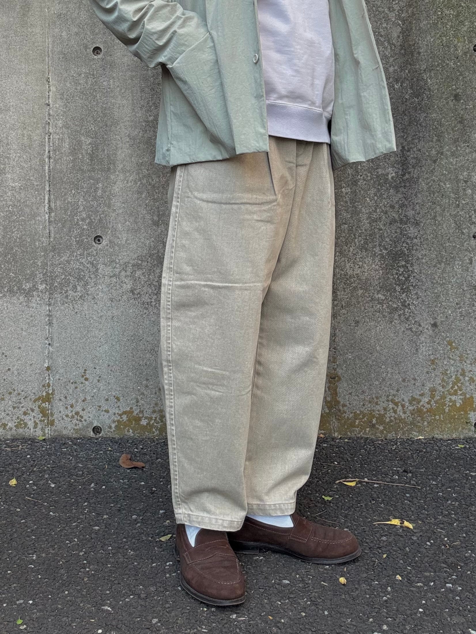 特殊な染料を使用した12オンスのカラーデニムパンツに加工を加えて、少しフェード感のある表情にしています。外脇のカーブにより膨らみを持たせた特徴的なシルエットで、深いタックを入れて更にボリューム感を出しています。