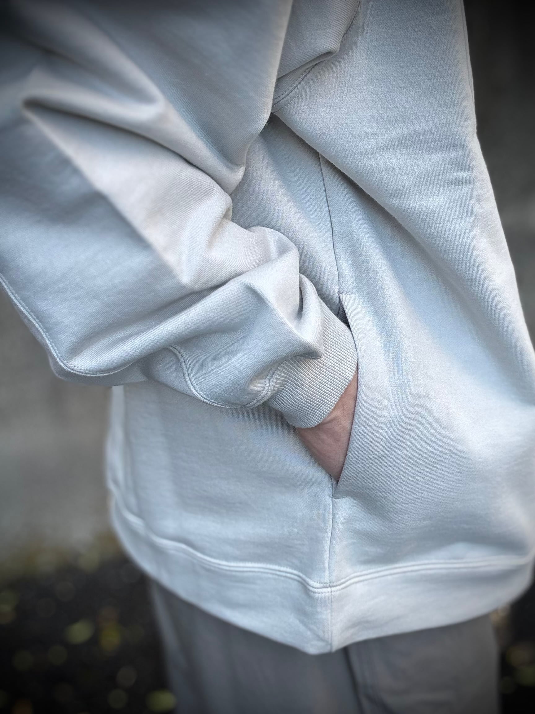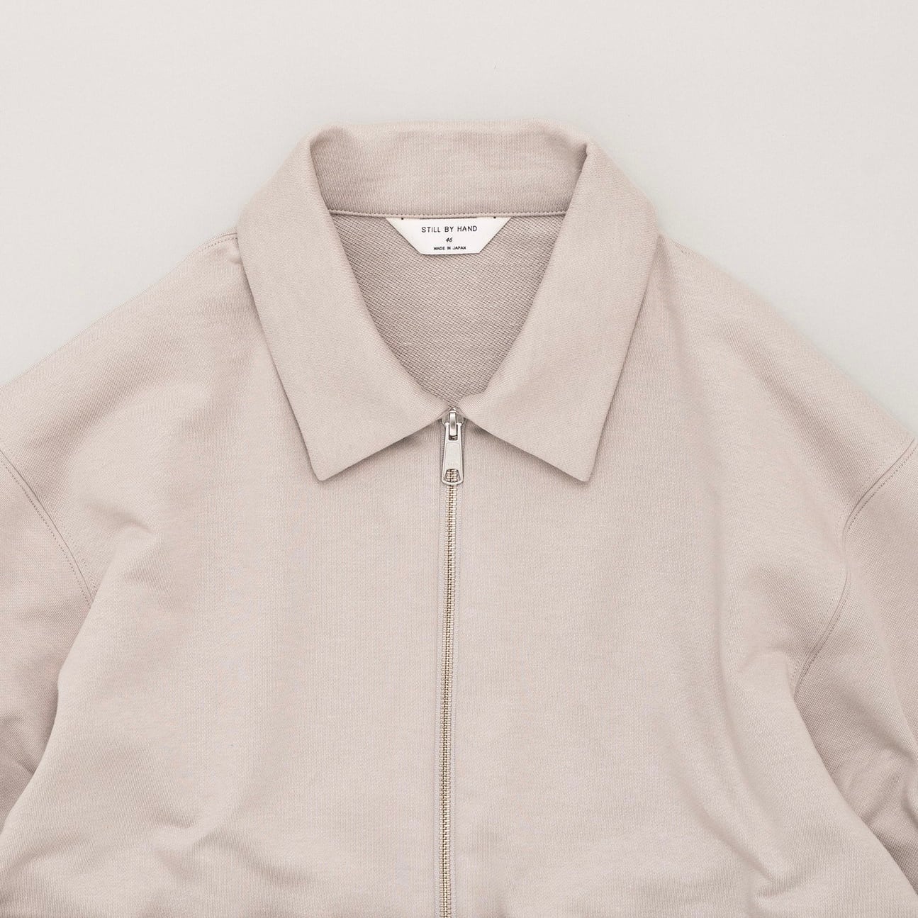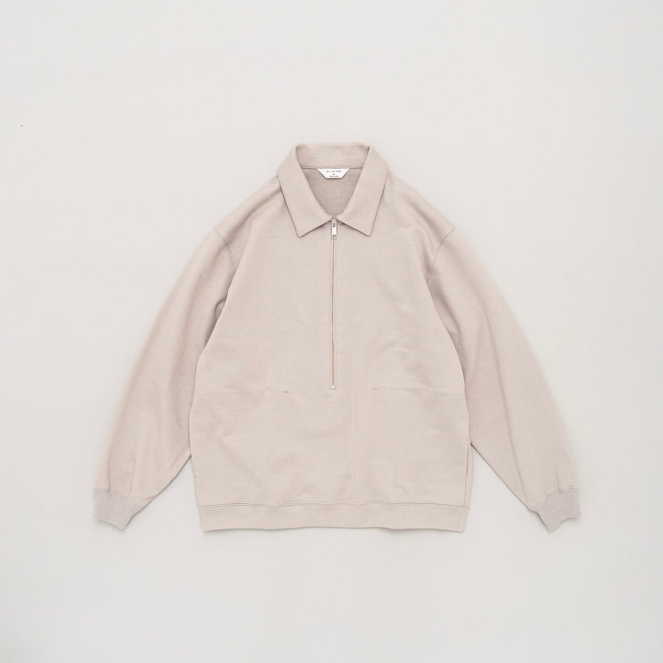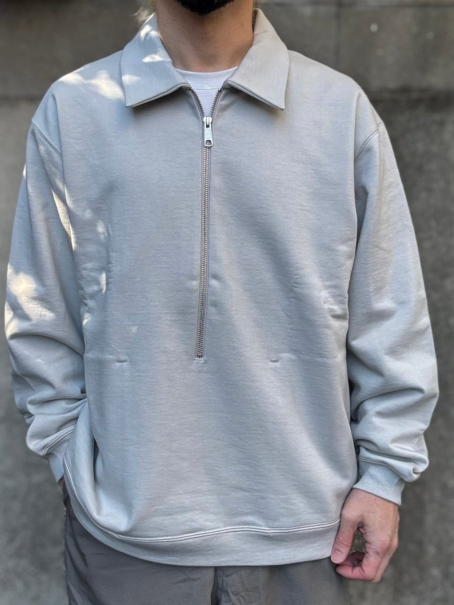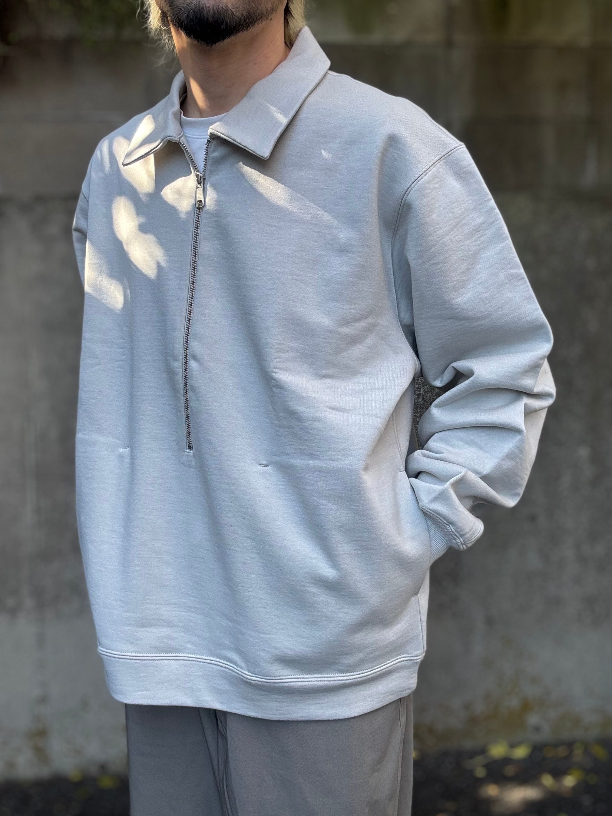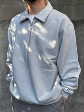しっかりと度を詰めて編まれたフレンチテリー素材を使用したハーフジップスウェット。みぞおちぐらいまである長いジップが特徴です。シンプルに見えて存在感がしっかりとある、春先に活躍するアイテムに仕上がっています。