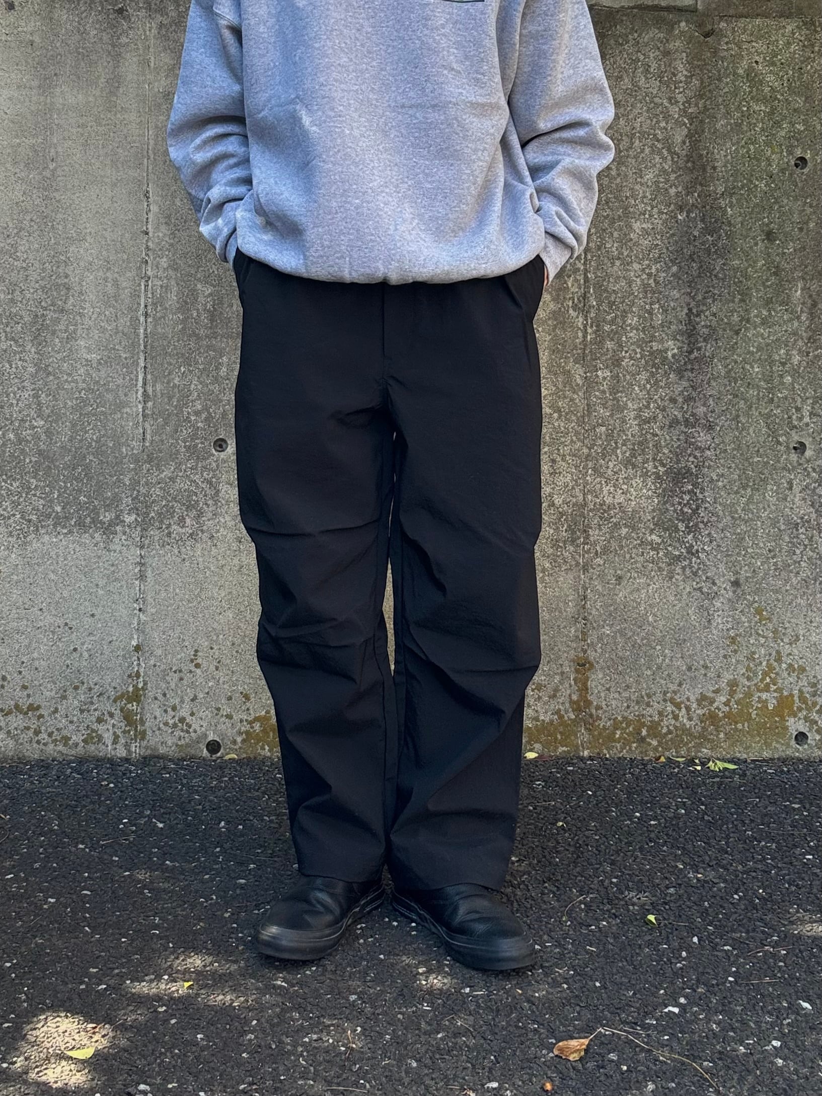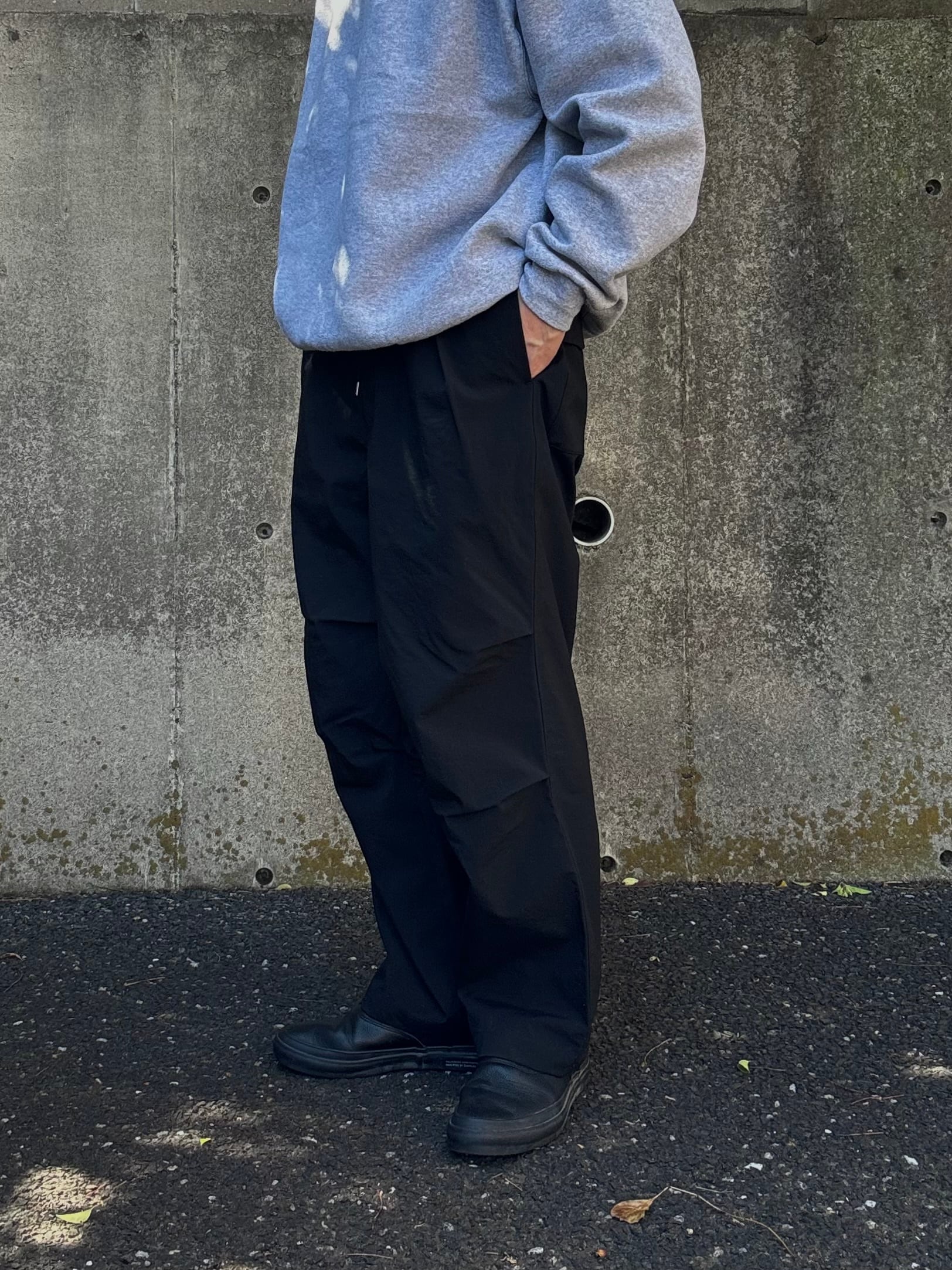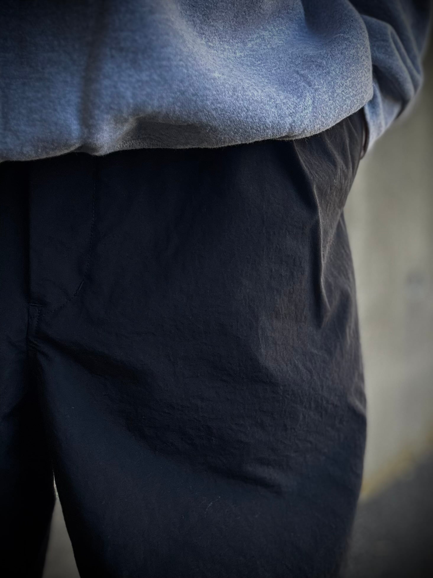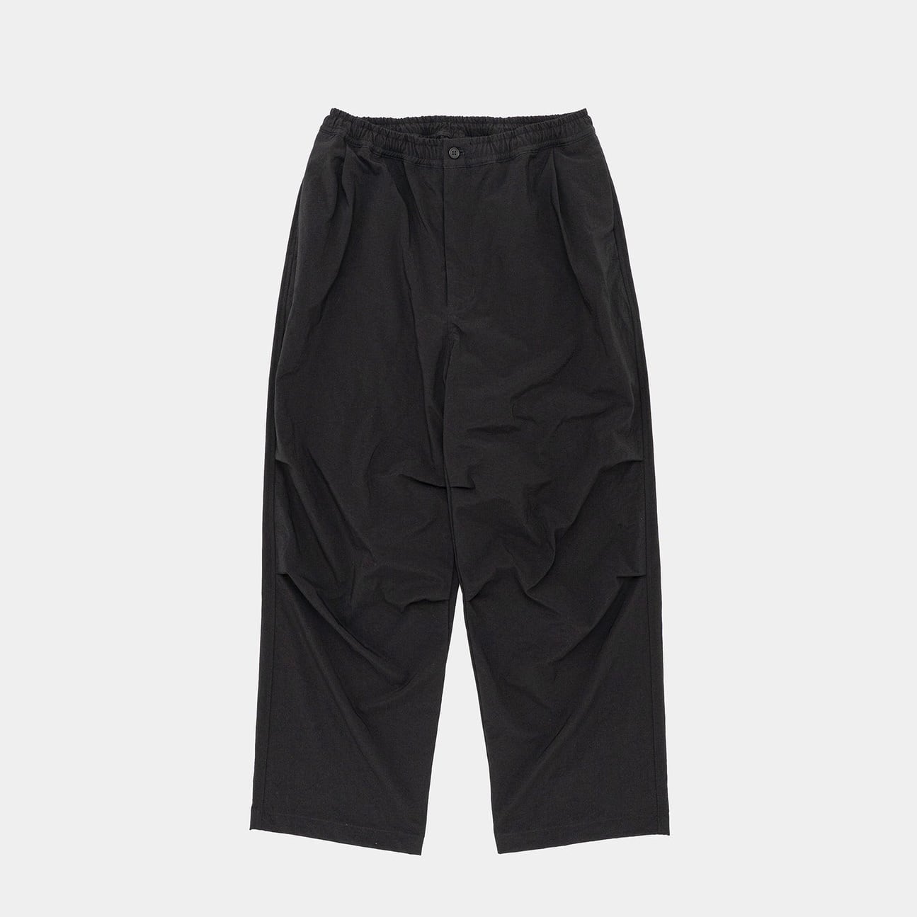 光沢を抑えたマットな質感が特徴のタスランナイロンを使用したニータックパンツ。ウエストに平ゴムを叩きつけた仕様でベルトループはなく、スピンドルコードで絞って履いていただくタイプです。シルエットはやや太めで、ミリタリーパンツなどに見られる膝のタックにより動きのあるデザインになっています。かなりしっかりとしたナイロン生地なので、丈夫で汚れにも強く、乾きが早くてイージーケアな所も◎です。