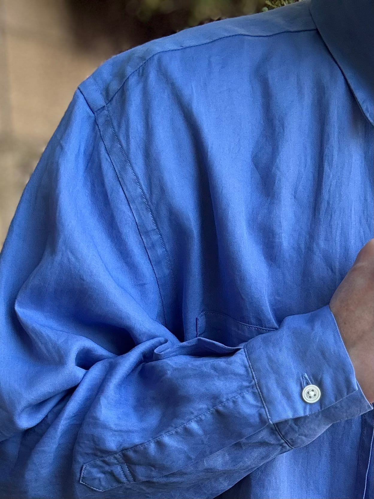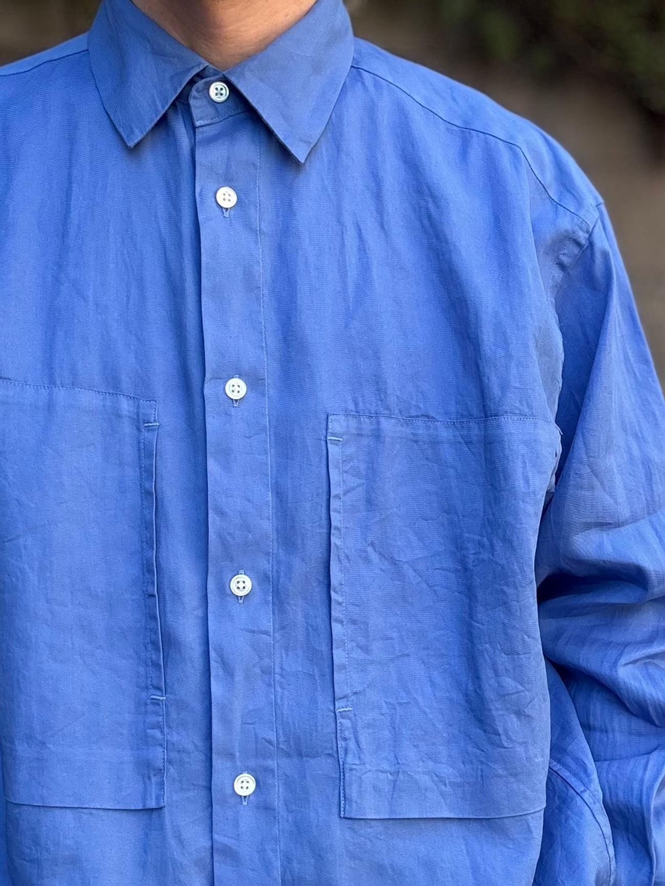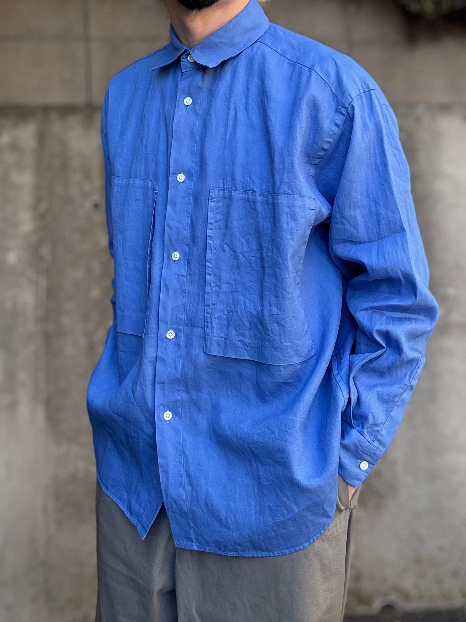 コットン100%とは思えないようなドライなタッチと麻のようなシャリ感が特徴の長袖シャツ。製品染めを施しているので上品な印象の中にもラフな雰囲気があります。ゆったり目のサイズ感とWポケットのデザインでシャツアウター的にも使用できるアイテムです。