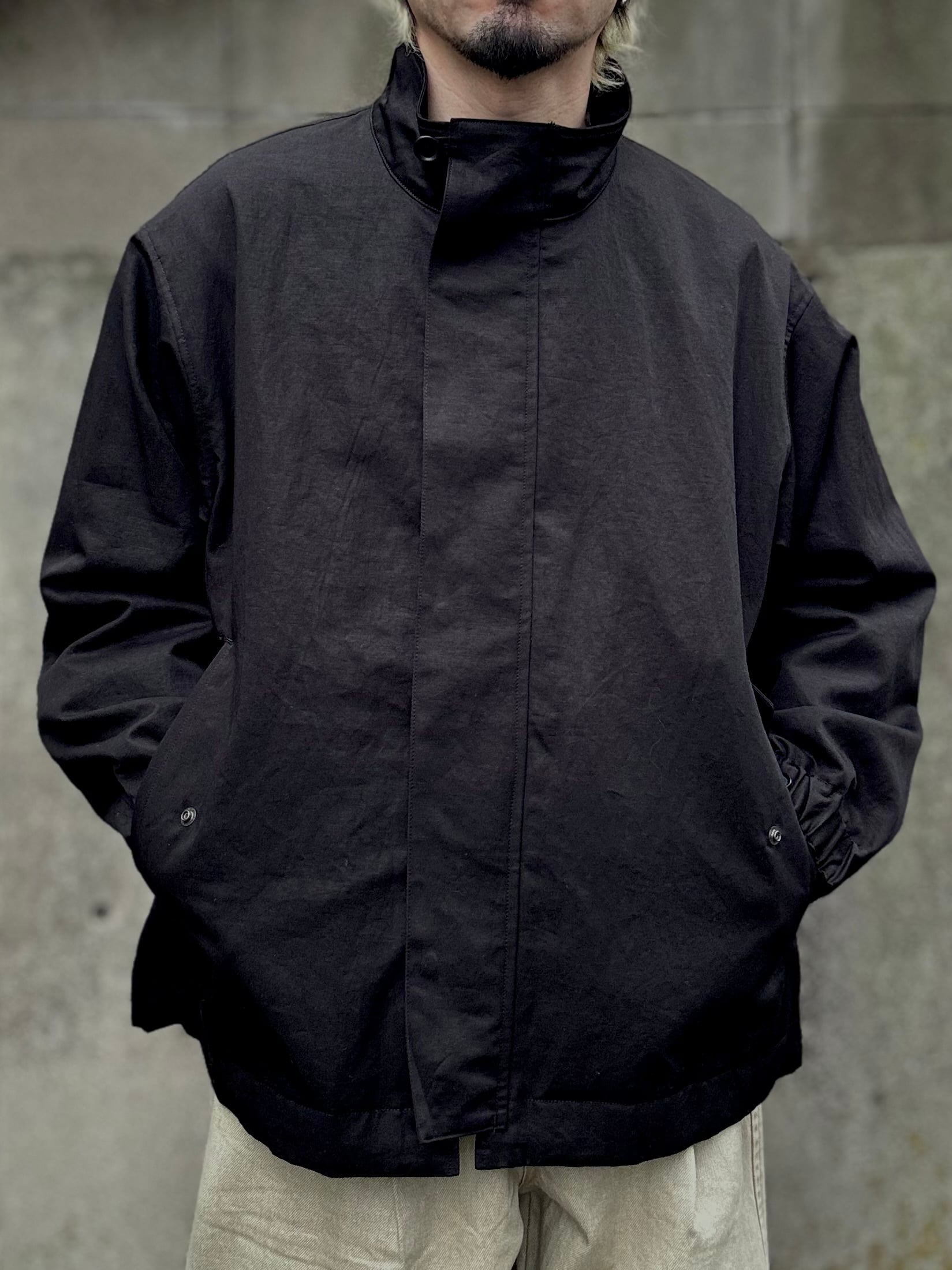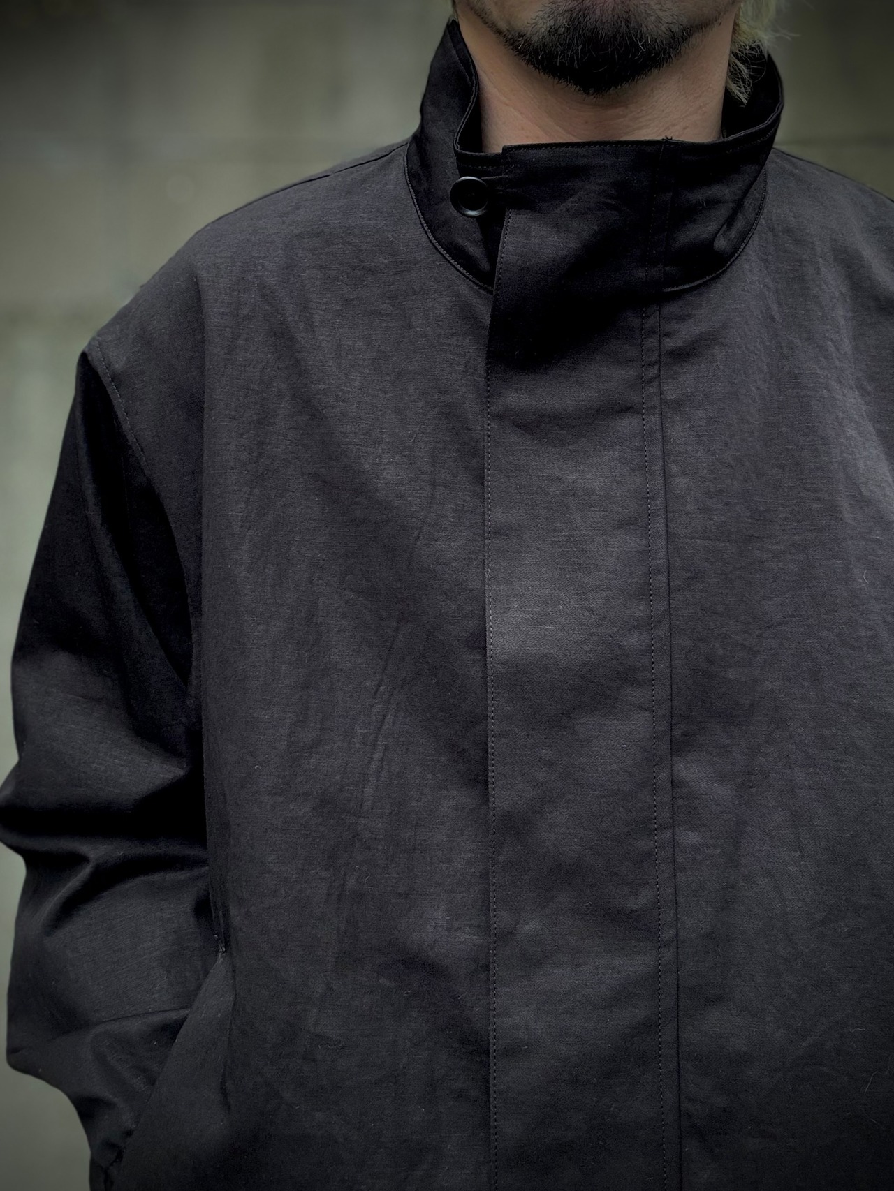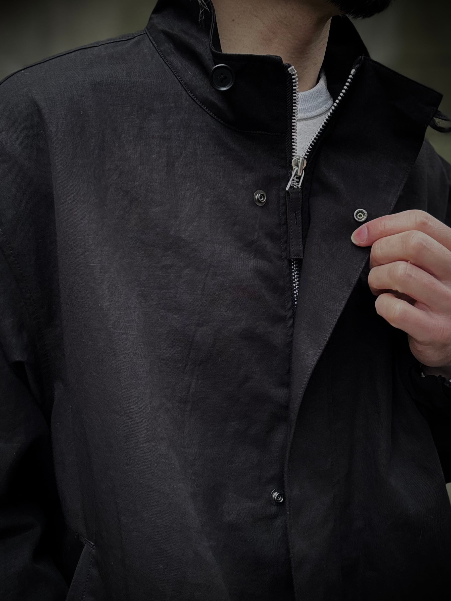 ミリタリーコートをショート丈にしたようなデザインのライトアウター。素材は綿麻のツイル生地で、麻特有の自然なシワが季節感のある一着に仕上がっています。また、リネンならではの光沢感が、より一層上品な表情になっております。裾にはスピンドルコードが付いており、シルエットの調整が可能です。