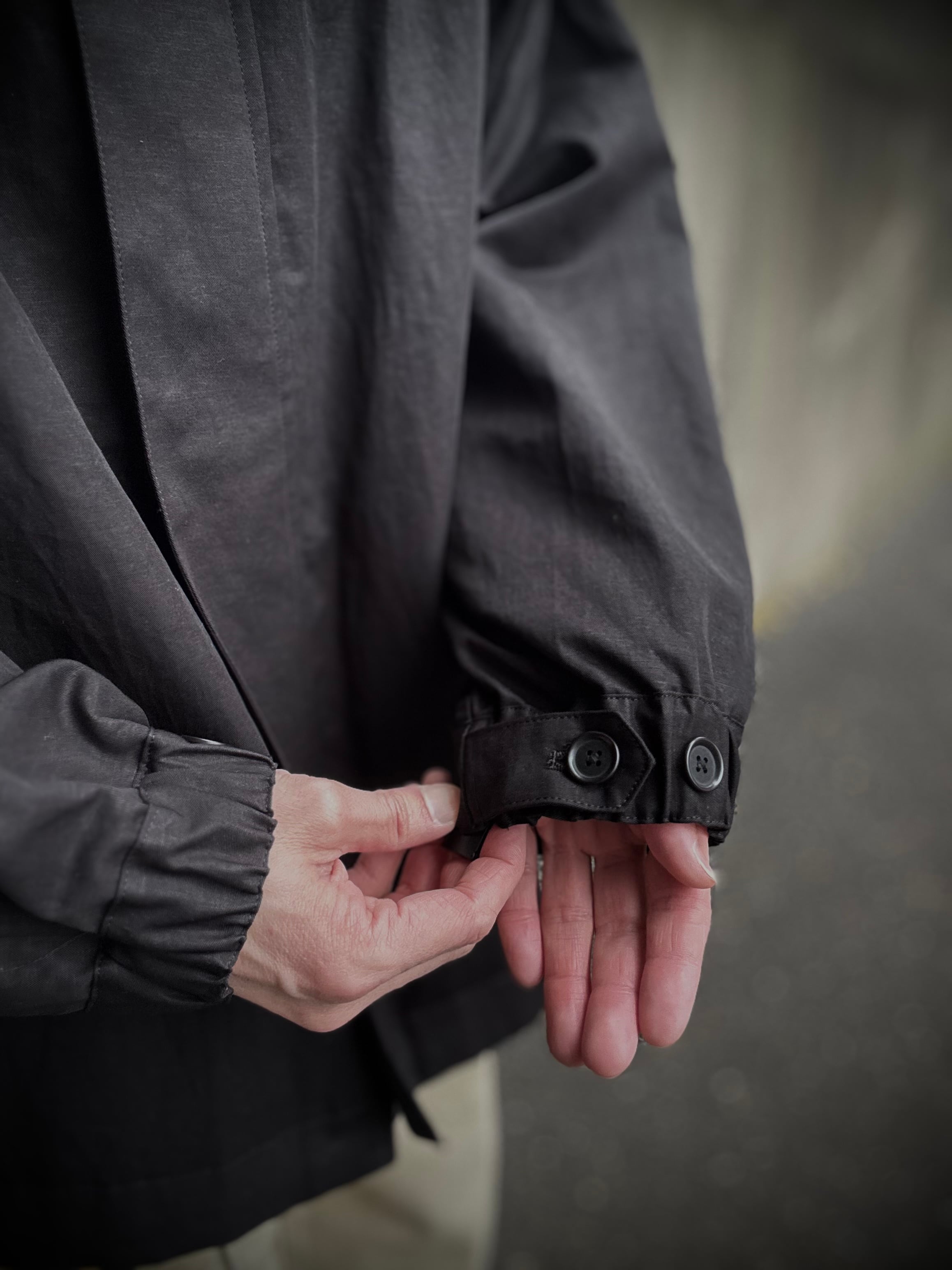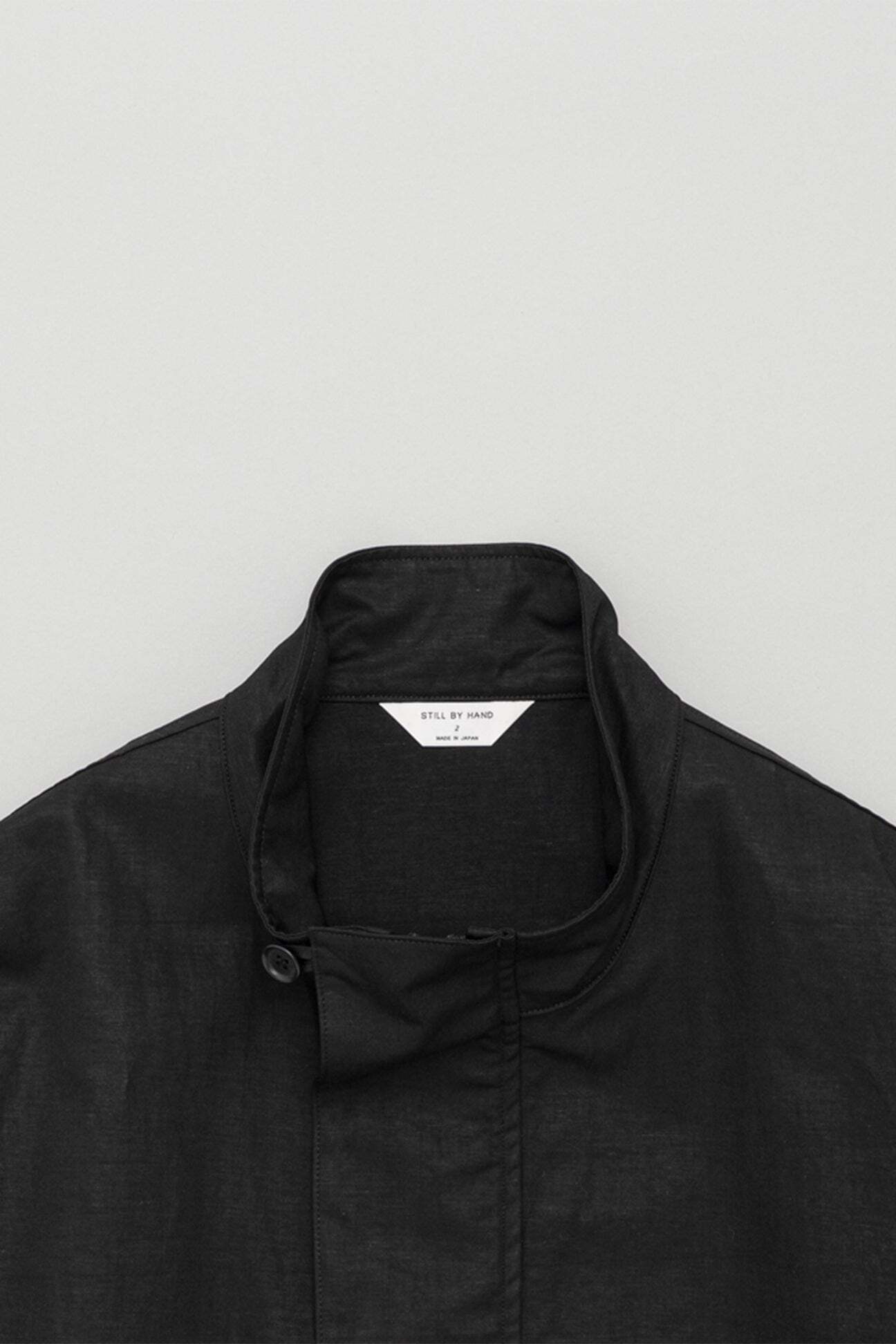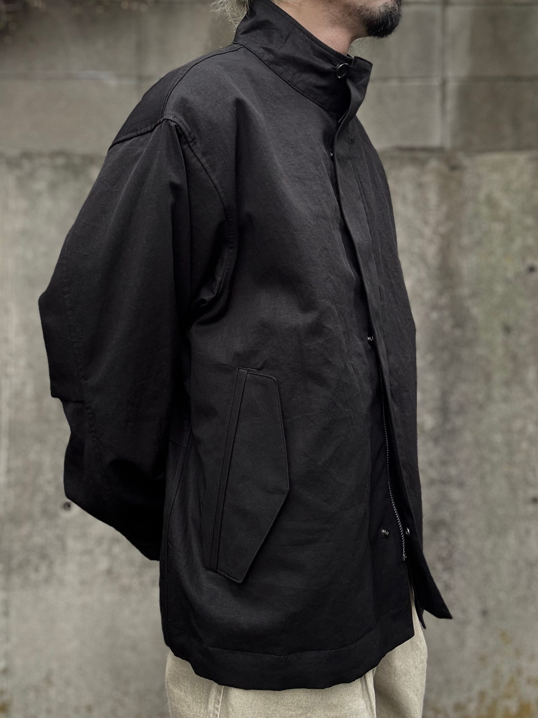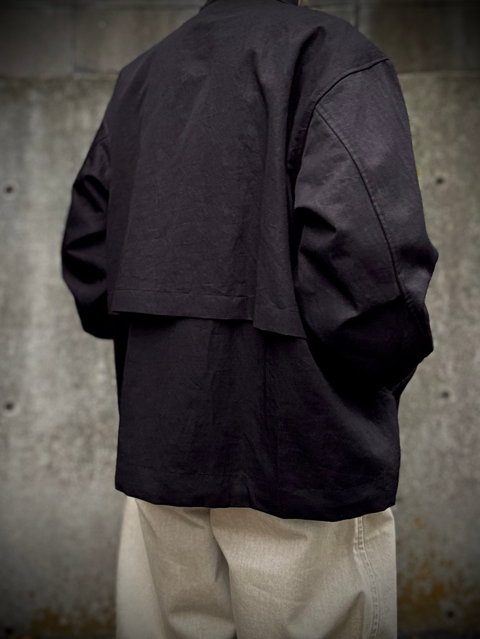 ミリタリーコートをショート丈にしたようなデザインのライトアウター。素材は綿麻のツイル生地で、麻特有の自然なシワが季節感のある一着に仕上がっています。また、リネンならではの光沢感が、より一層上品な表情になっております。裾にはスピンドルコードが付いており、シルエットの調整が可能です。
