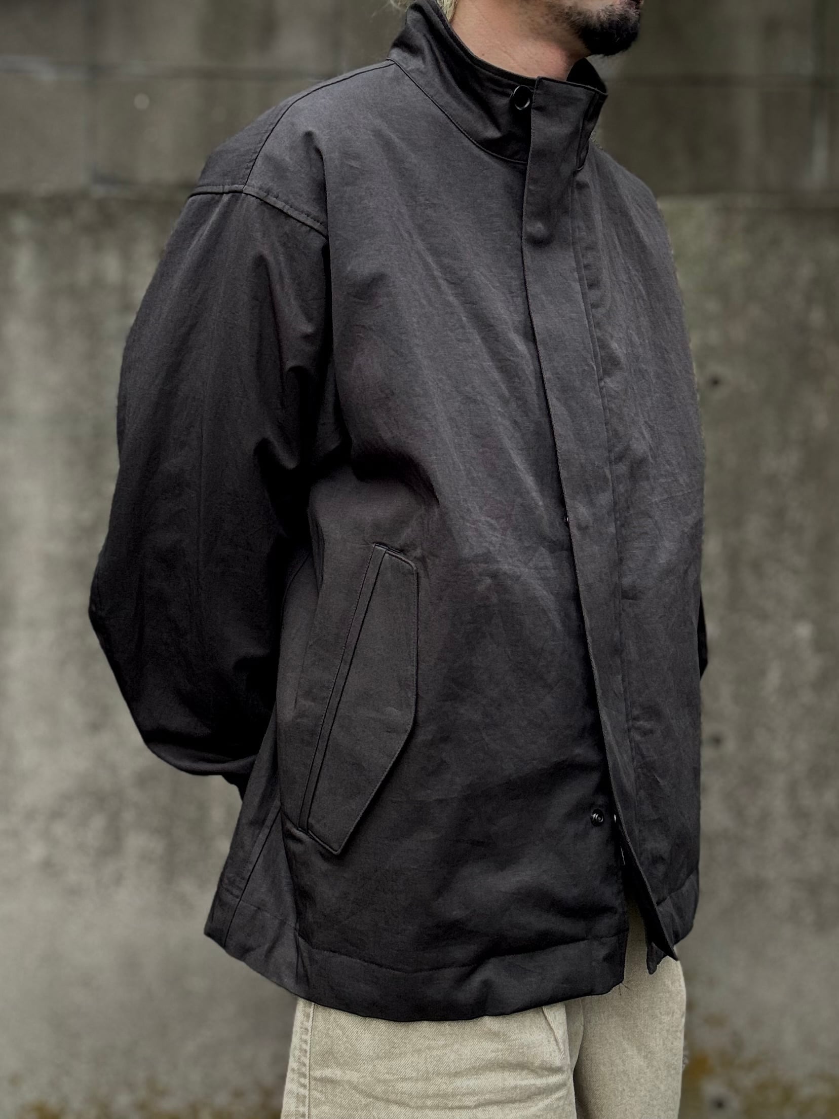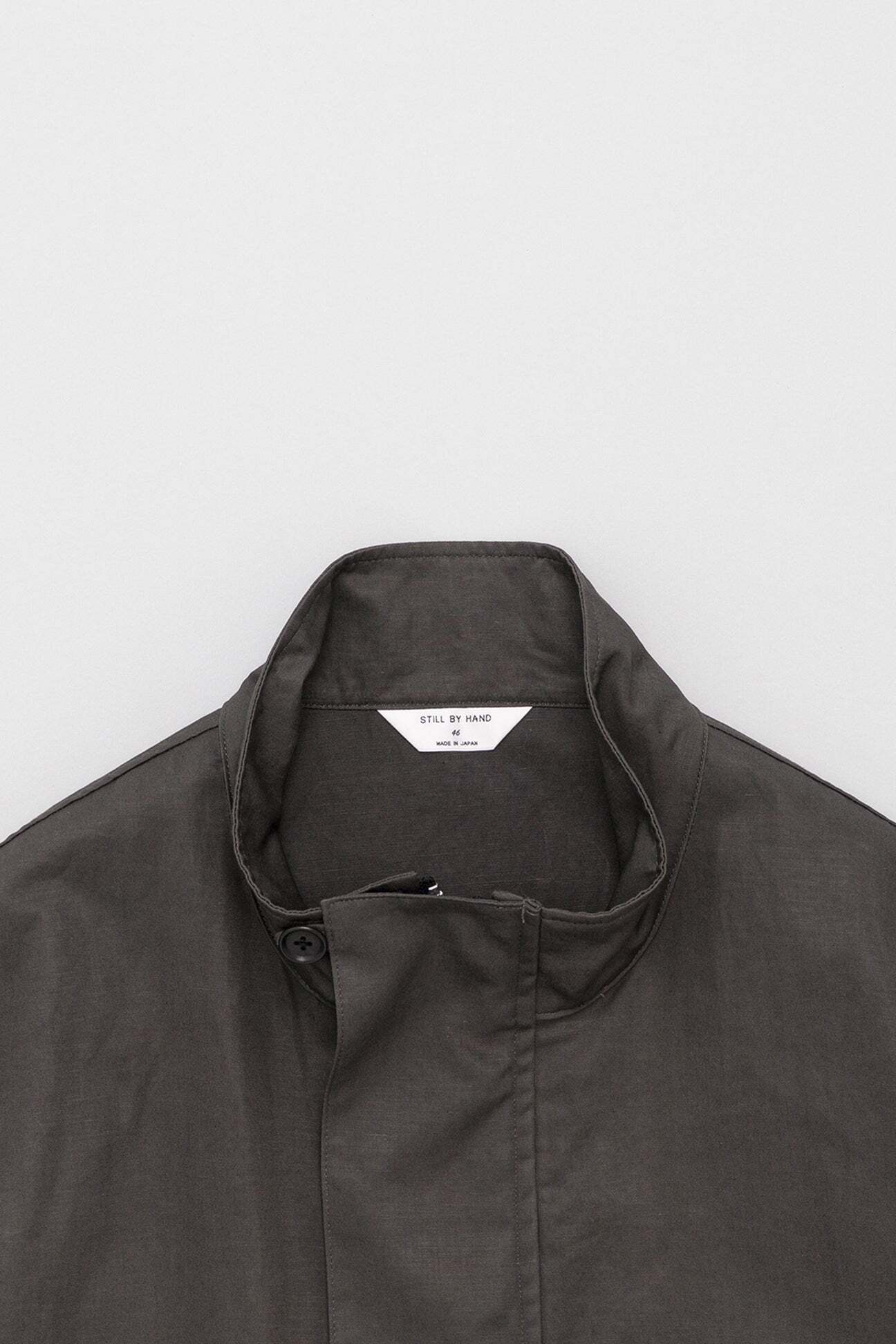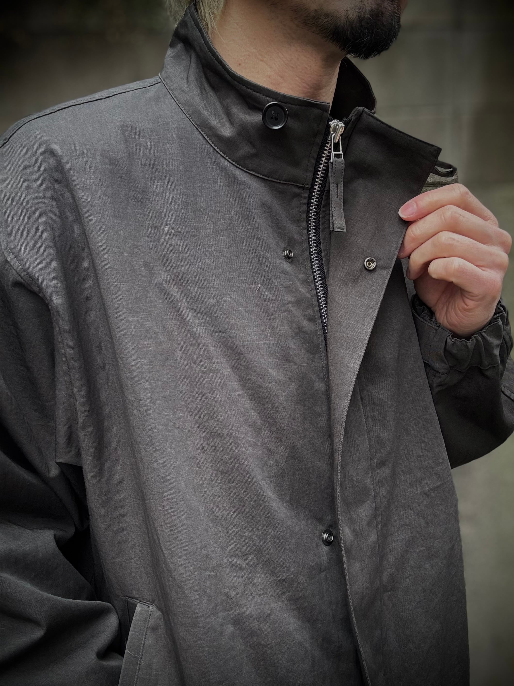 ミリタリーコートをショート丈にしたようなデザインのライトアウター。素材は綿麻のツイル生地で、麻特有の自然なシワが季節感のある一着に仕上がっています。また、リネンならではの光沢感が、より一層上品な表情になっております。裾にはスピンドルコードが付いており、シルエットの調整が可能です。