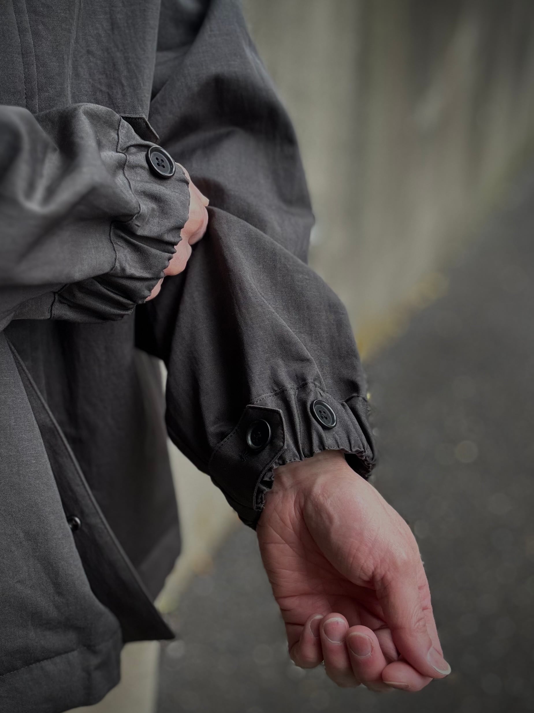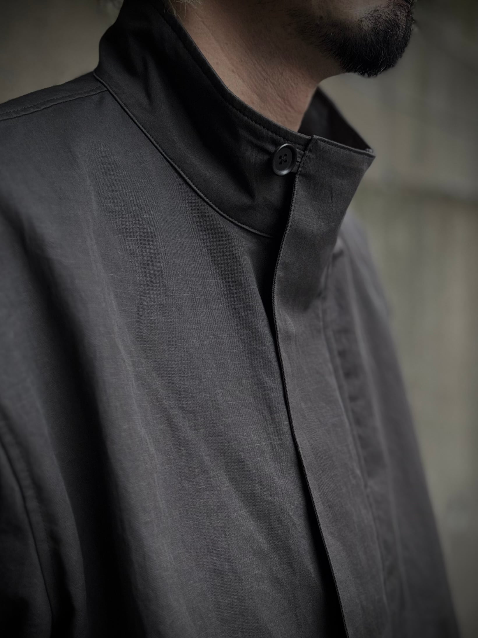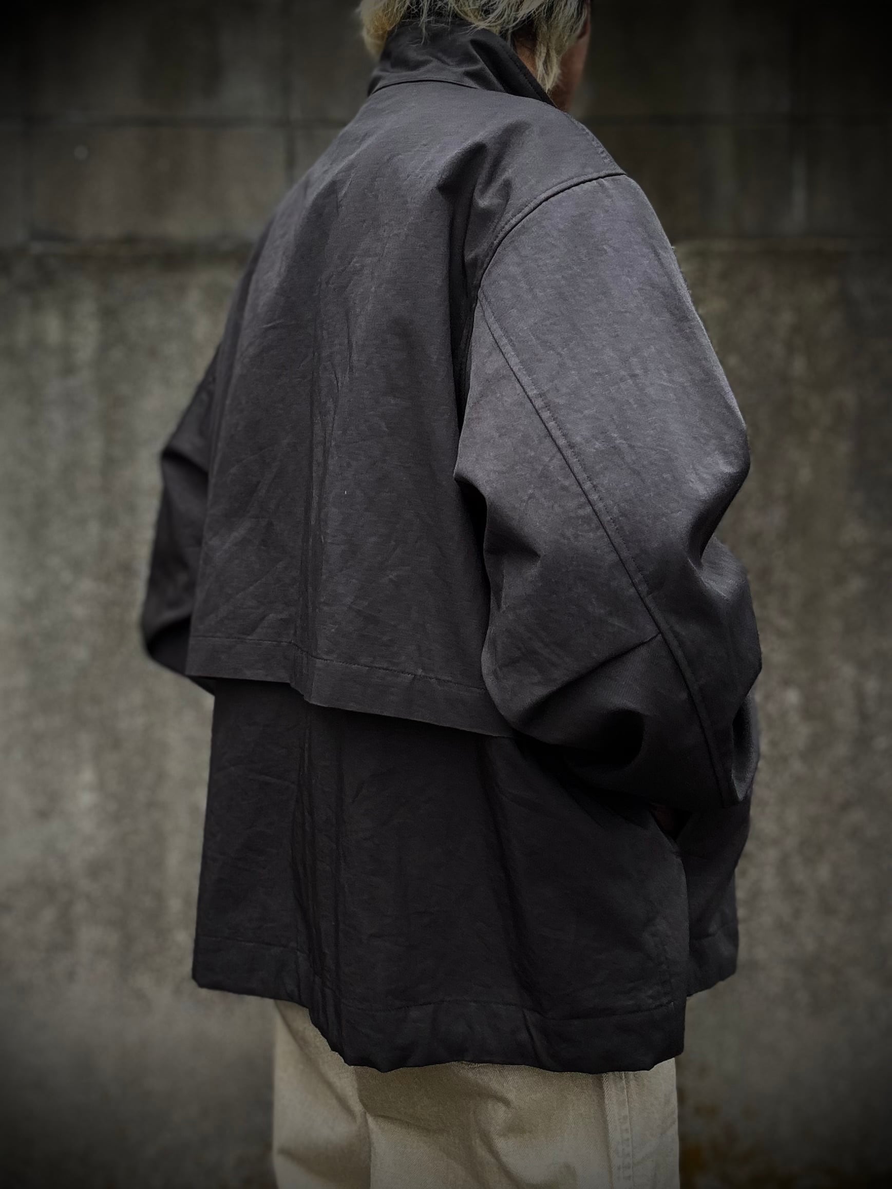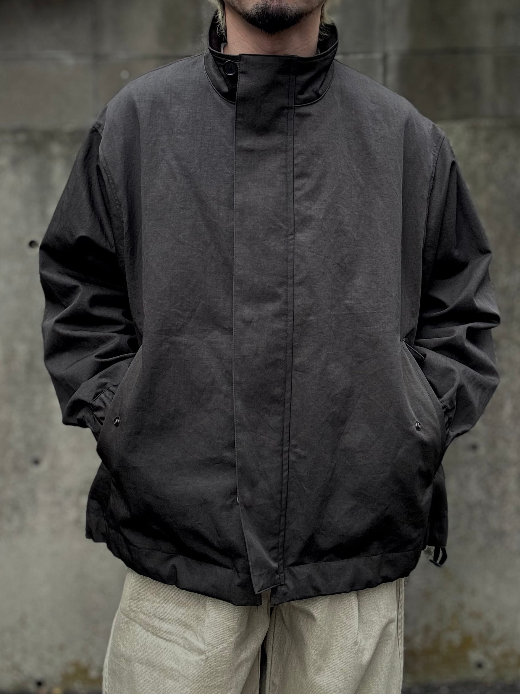 ミリタリーコートをショート丈にしたようなデザインのライトアウター。素材は綿麻のツイル生地で、麻特有の自然なシワが季節感のある一着に仕上がっています。また、リネンならではの光沢感が、より一層上品な表情になっております。裾にはスピンドルコードが付いており、シルエットの調整が可能です。