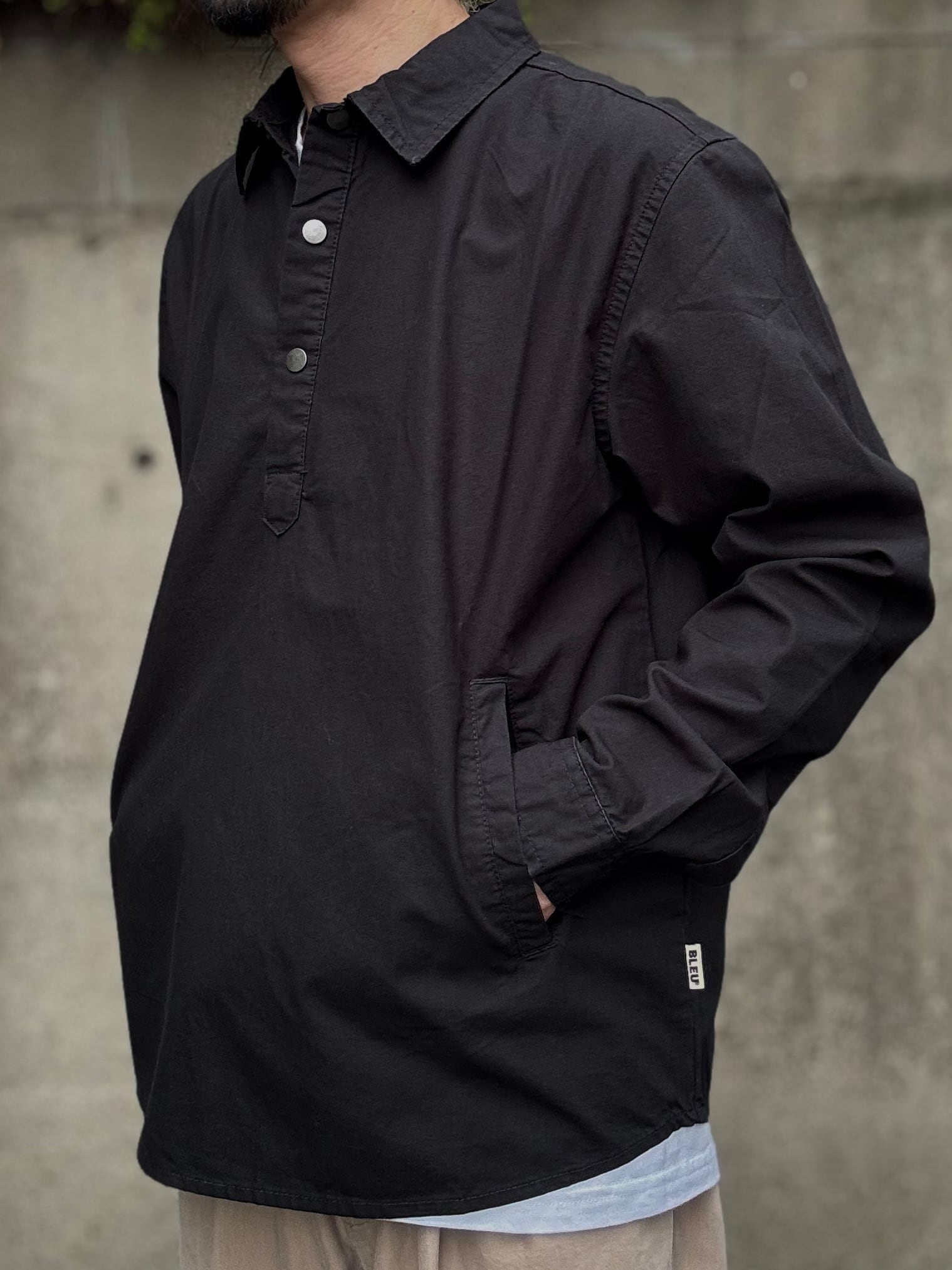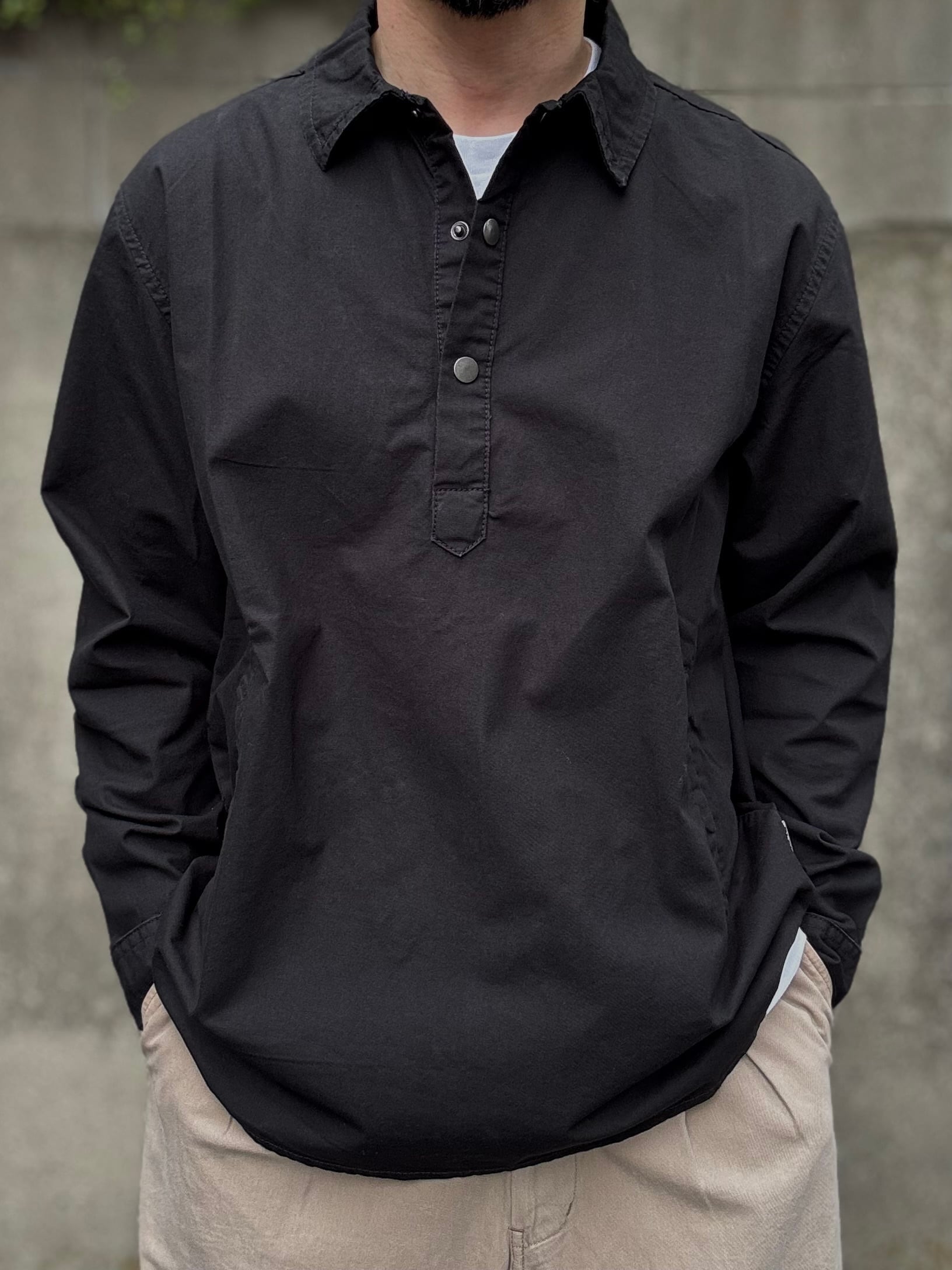 ユーロワークのヴィンテージウェアのような雰囲気を持ちあわせるユーロ製のプルオーバーシャツ。引き揃えの糸を平織りで織った生地が素敵な表情の一着です。フロントはメタル製のスナップボタン仕様で、前身頃には玉縁ポケットタイプのバンドウォーマーが付いています。ややゆったりとしたシルエットで、裾は前後共にラウンド型になっています。