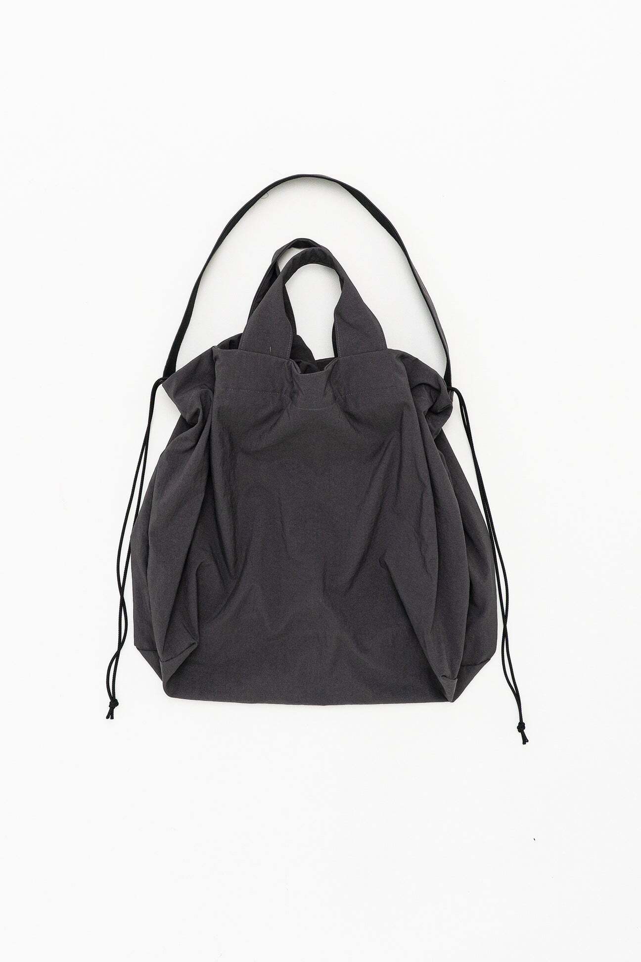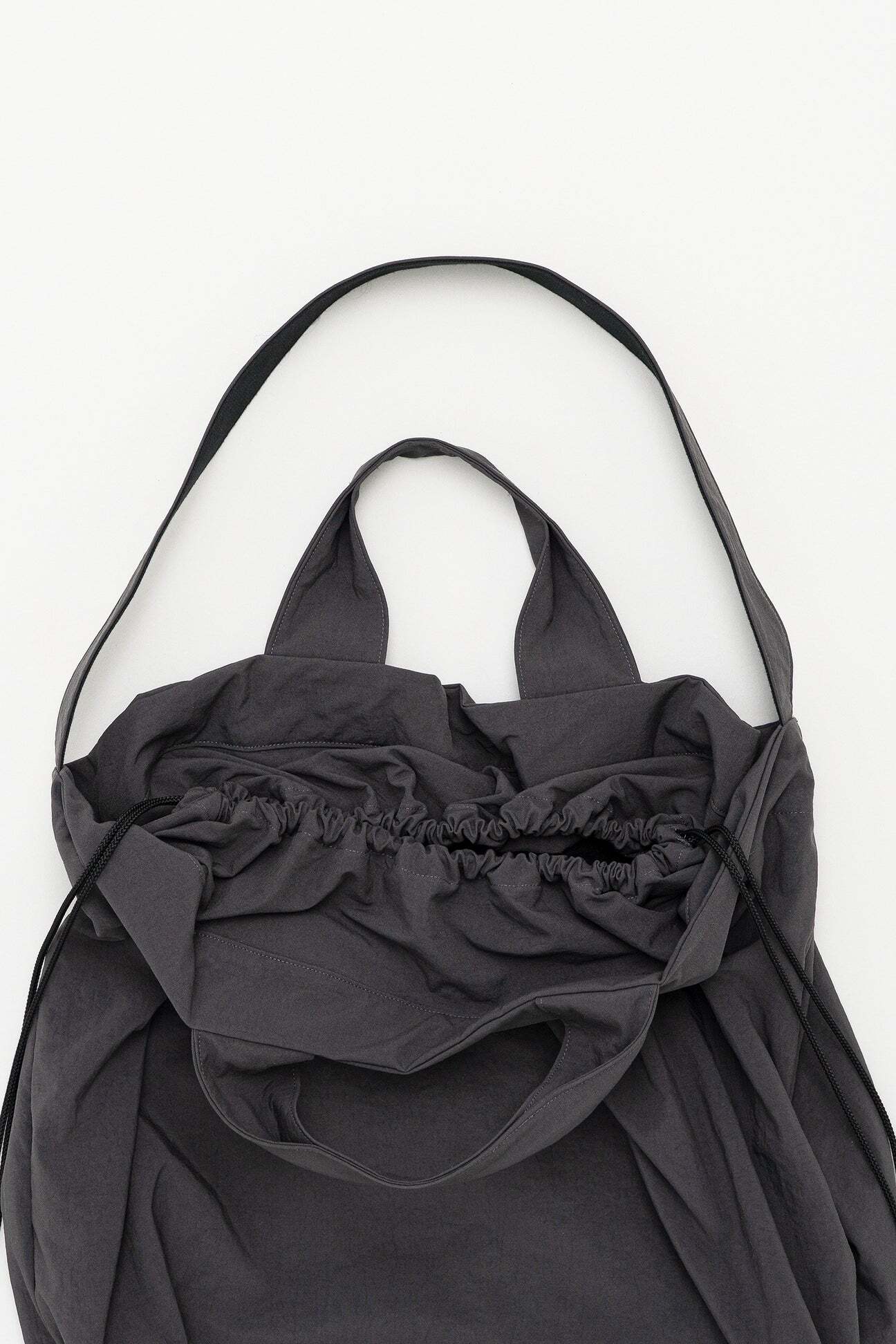 撥水性のあるナイロンオックス素材を使用した2wayバッグ。長いストラップを使用して肩掛けと、ショートハンドルでトートバッグとしても使用出来ます。口部分についている巾着ディテールを絞るとフォルムを変えれ、同時に中身が見えなくなるためプライバシー面と防犯面にも役立ちます。撥水性のある素材なので汚れにくいのも嬉しい。