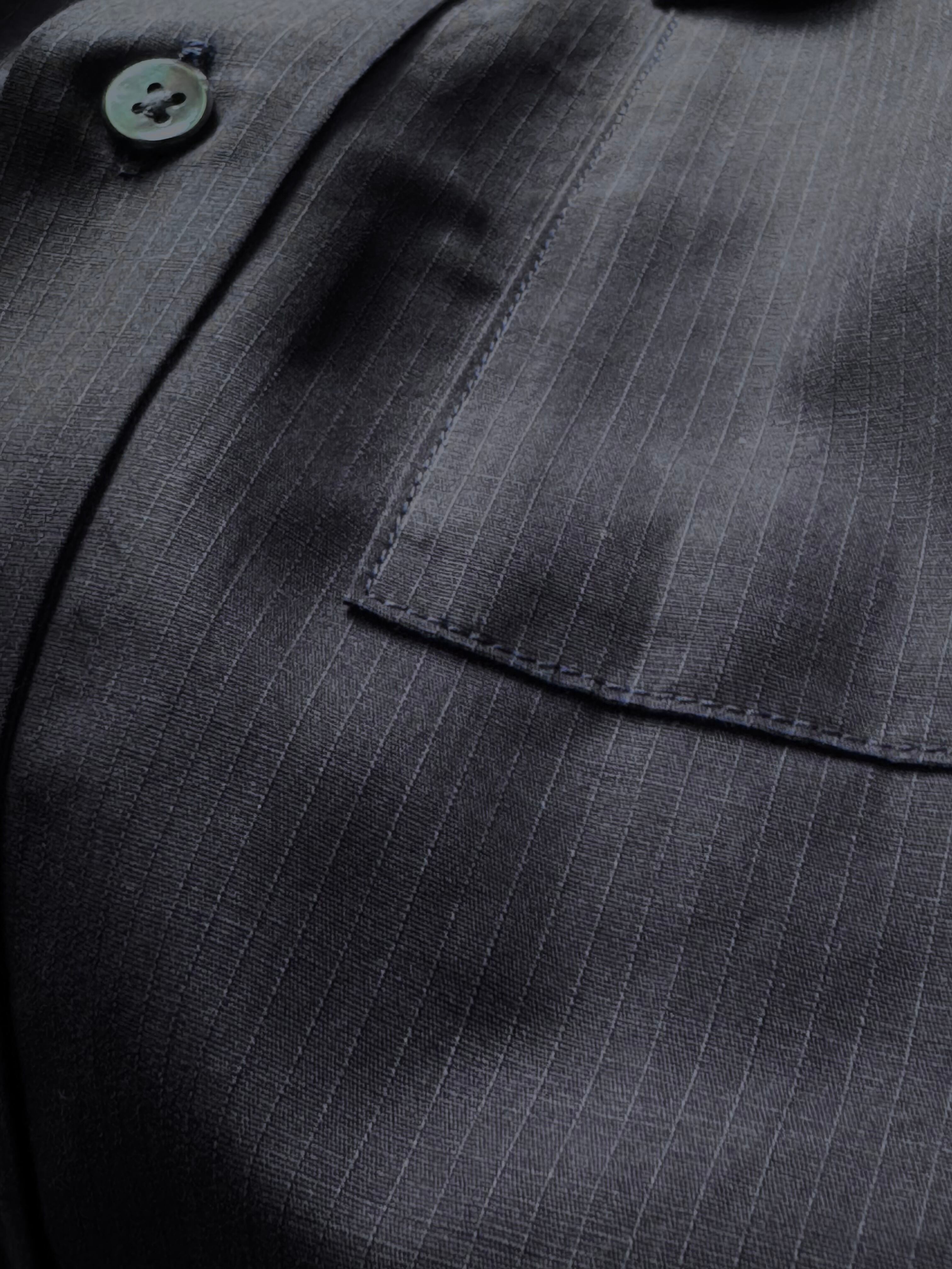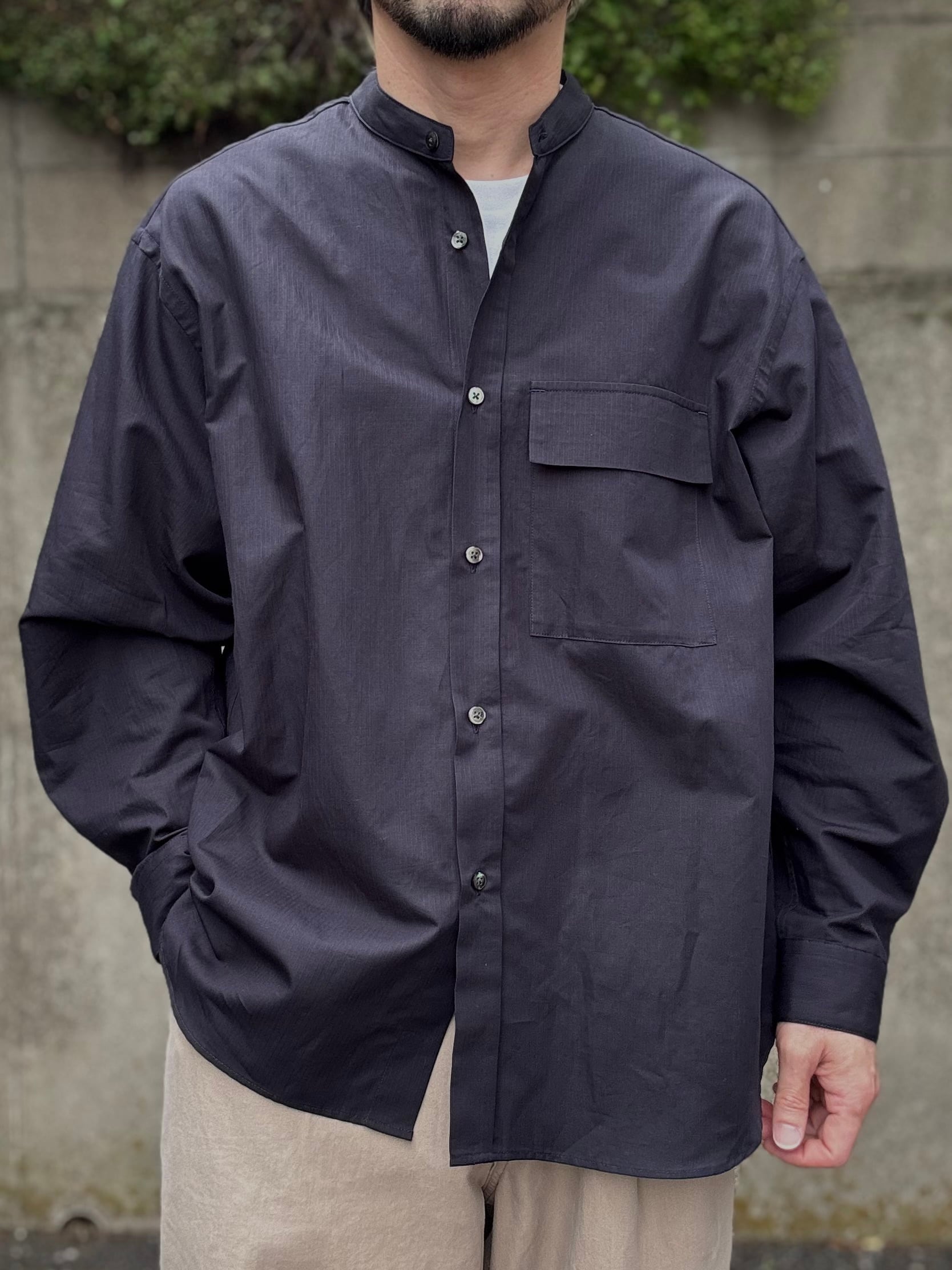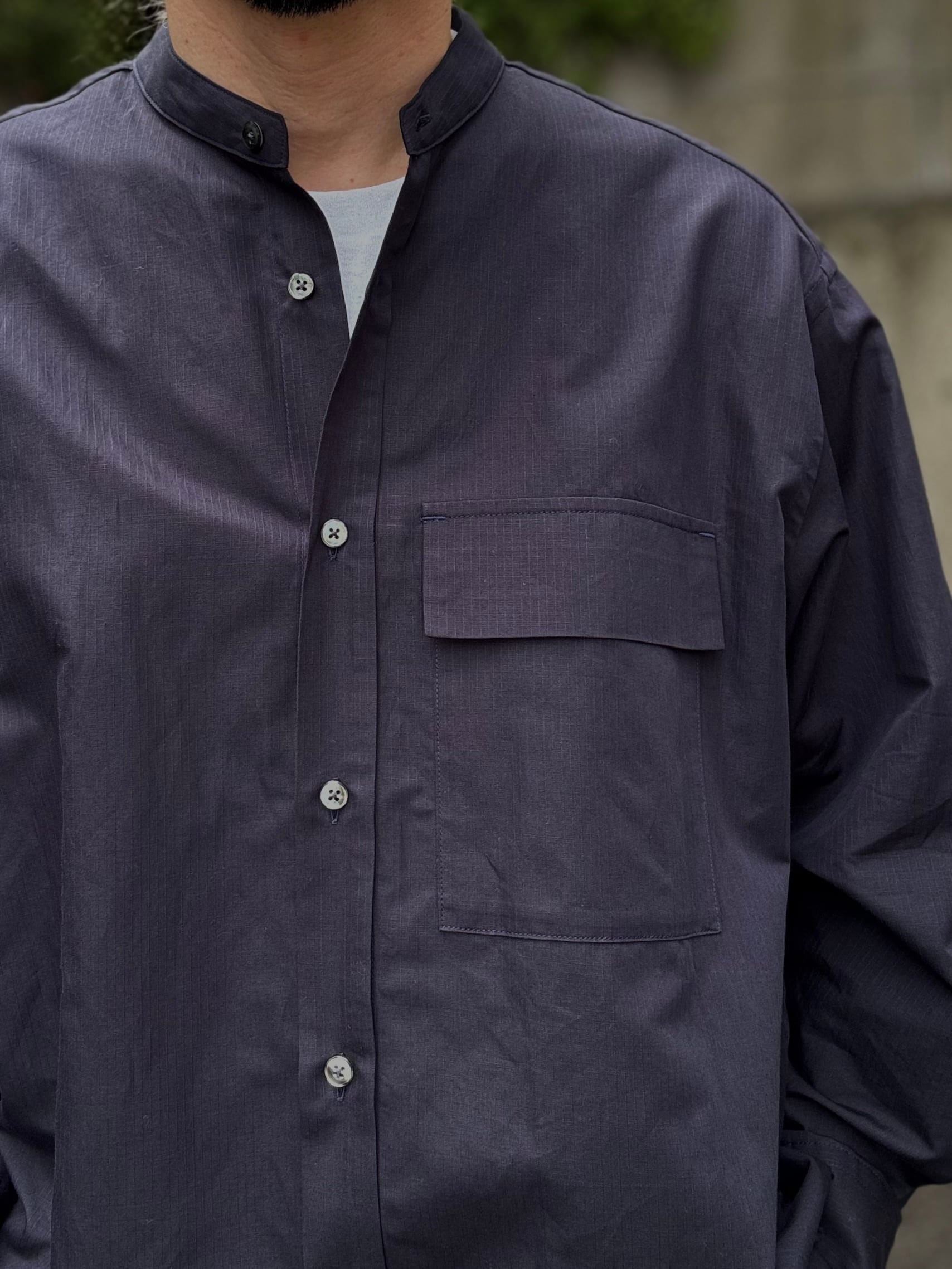 薄手で軽い生地の、ややゆったりとしたシルエットのバンドカラーシャツ。コットン/ラミー(麻)の生地は、コットン100%に比べて吸水性や通気性、速乾性に優れており、長袖でも暑い時期に過ごしやすい生地となっています。生地は、播州織りの国内最大産地である兵庫県の西脇産地で作製したオリジナルの先染めシャツ生地を使用。サイジングはゆったりとしたゆとりのあるシルエットで、風が通りやすく暑い時期にも比較的快適に着用していただけます。夏はショーツもおすすめです。