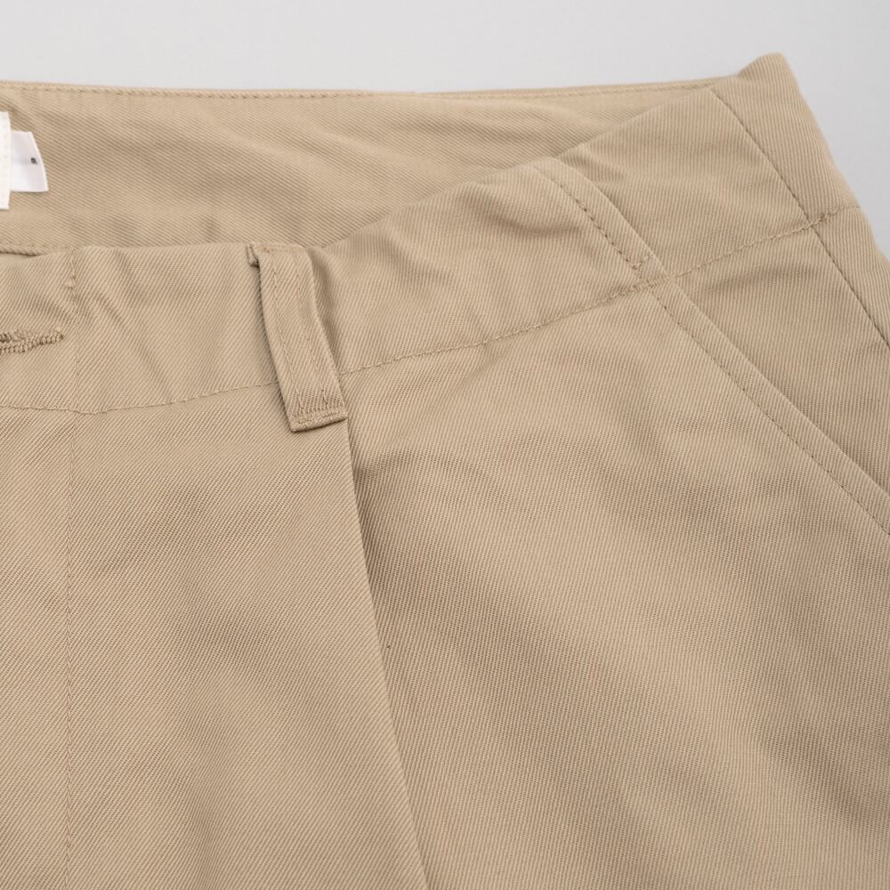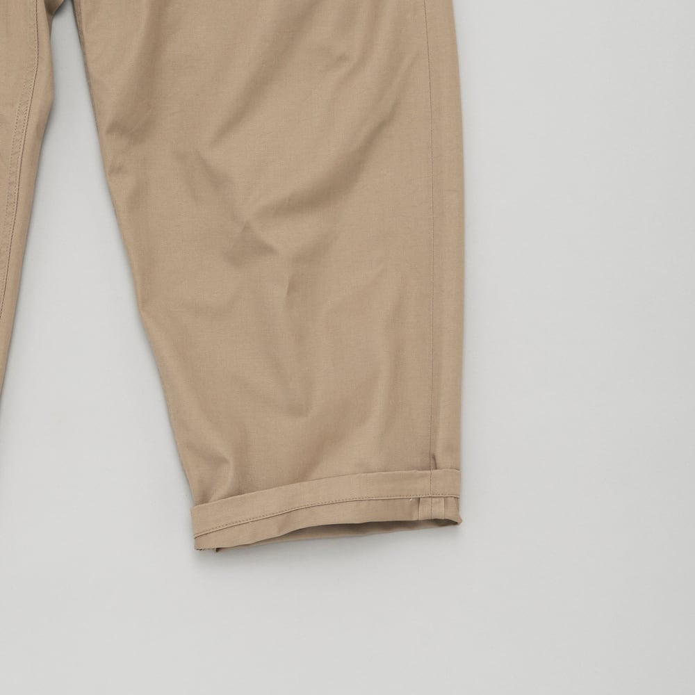 別注セルビッチチノ素材のテーパードタックパンツ。STILLBYHANDらしくあえて綺麗な糸を使用したセルビッチファブリックを使用。すっきりとした丈感が、サンダルスタイルにも相性良しです。
