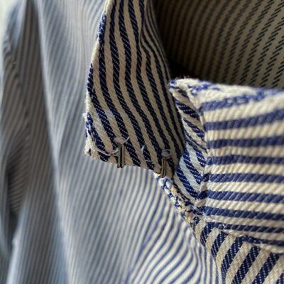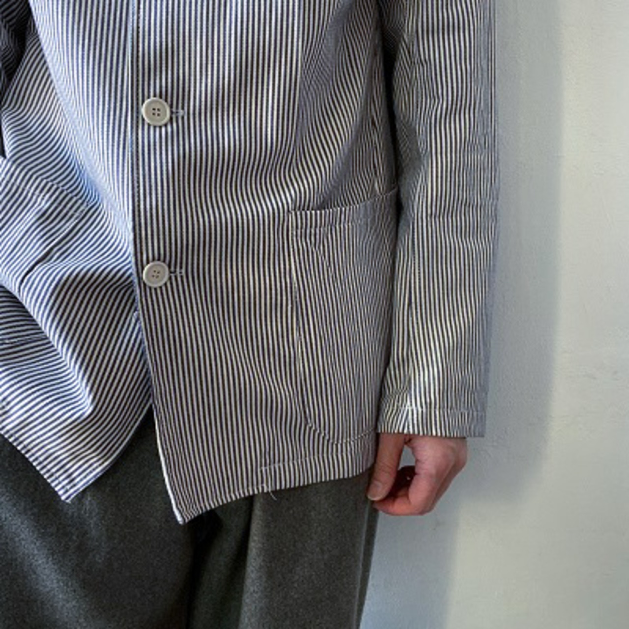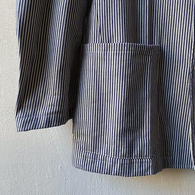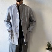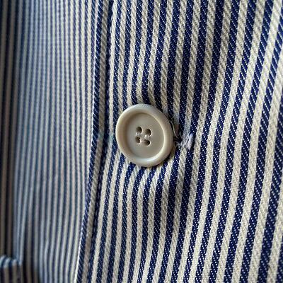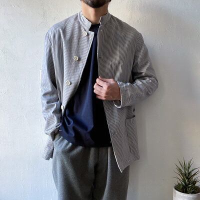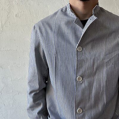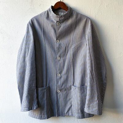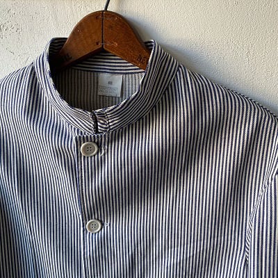 1980年代のイタリア海軍シェフジャケットが入荷しました。希少なデッドストック(未使用品)になります。こちらのジャケットはイタリア海軍の軍属料理人(ミリタリーシェフ)が着ていた物になります。生地は汚れを目立たなくする為に使われるヒッコリーストライプを使用しており、襟はシェフジャケット定番のスタンドカラーとなります。ポケットは2つのみとシンプルで、体に合わせたスッキリとしたシルエットがイタリアらしさを思わせます。生地が非常に柔らかく、軽いジャケット感覚でラフに羽織れる一枚となっています。詰襟ジャケットの様な襟先のフックも特徴的なディテールです。