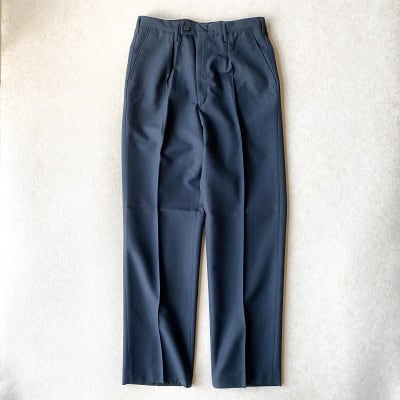 1960~1970年代製のスウェーデン軍のドレスパンツです。希少なデッドストック(当時の未使用品)になります。パレードや式典の時などに採用されていたと思われる、いわゆる準礼服のスラックスです。シルエットはワンタックでゆったりとした腰まわりから裾に向かい程良くテーパーが掛かっています。生地はウールとポリエステルの混紡生地で、しっかりとしたハりと柔らかさを兼ねたドライ感のある生地となっています。チャコールグレーにブルーを加えたような上品で落ち着いた色合いもの素敵です。裾はきっちりと自分サイズに直すと綺麗な印象に、ロールアップならカジュアルに穿いて頂けると思います。ミリタリー物ですので若干の素材やディテールの違いがございます。予めご了承くださいませ。