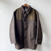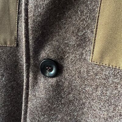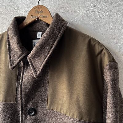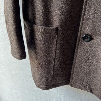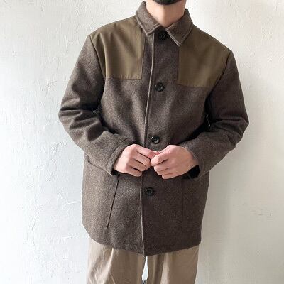 暖かなウールのメルトン素材を使用したヤーモのドンキーコート。イギリスの労働階級に愛用されていたワークジャケットが元になっているデザインで、運搬用に補強されたショルダーパッチがデザインのポイントです。少しゆったりめのサイズ感で、動きやすく軽い着心地。落ち着いたブラウンカラーと長く愛用できるデザインの一枚です。