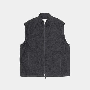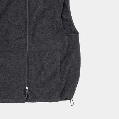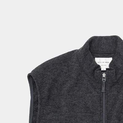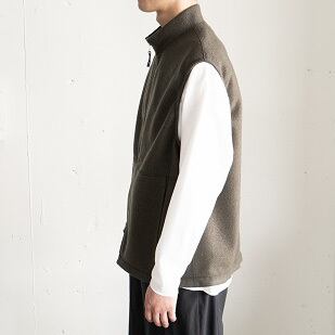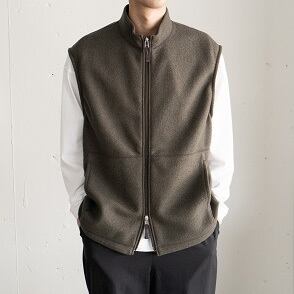 アウトドアライクなベストを上品なウール混素材で仕立てたフルジップベスト。フラットに縫製が可能な特殊ミシンを使用し、快適な着心地を実現しています。身頃をたっぷり取り、裾のスピンドルで丸いシルエットでも着用いただけます。