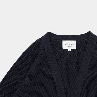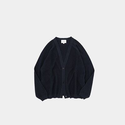 特殊な加工でクリスピータッチに仕上げた綿糸のカーディガン。特徴あるタッチが際立つよう10ゲージの編み機で凹凸のある編み組織で作成しています。通常よりも幅にゆとりを持たせて、着丈を短めに設定しています。少し丈の長いインナーと合わせたバランスを考えデザインされています。