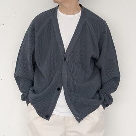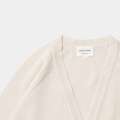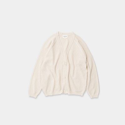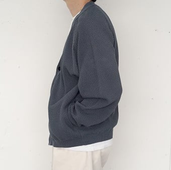 特殊な加工でクリスピータッチに仕上げた綿糸のカーディガン。特徴あるタッチが際立つよう10ゲージの編み機で凹凸のある編み組織で作成しています。通常よりも幅にゆとりを持たせて、着丈を短めに設定しています。少し丈の長いインナーと合わせたバランスを考えデザインされています。