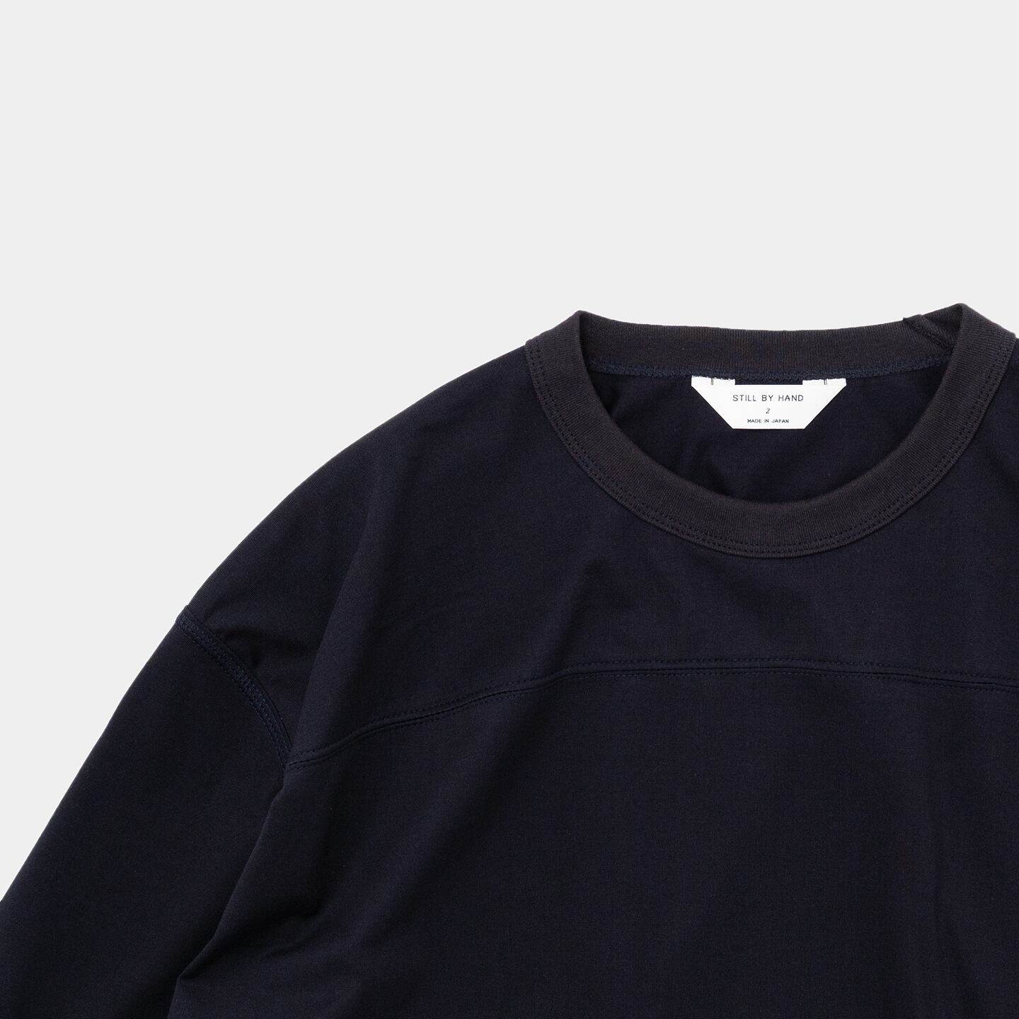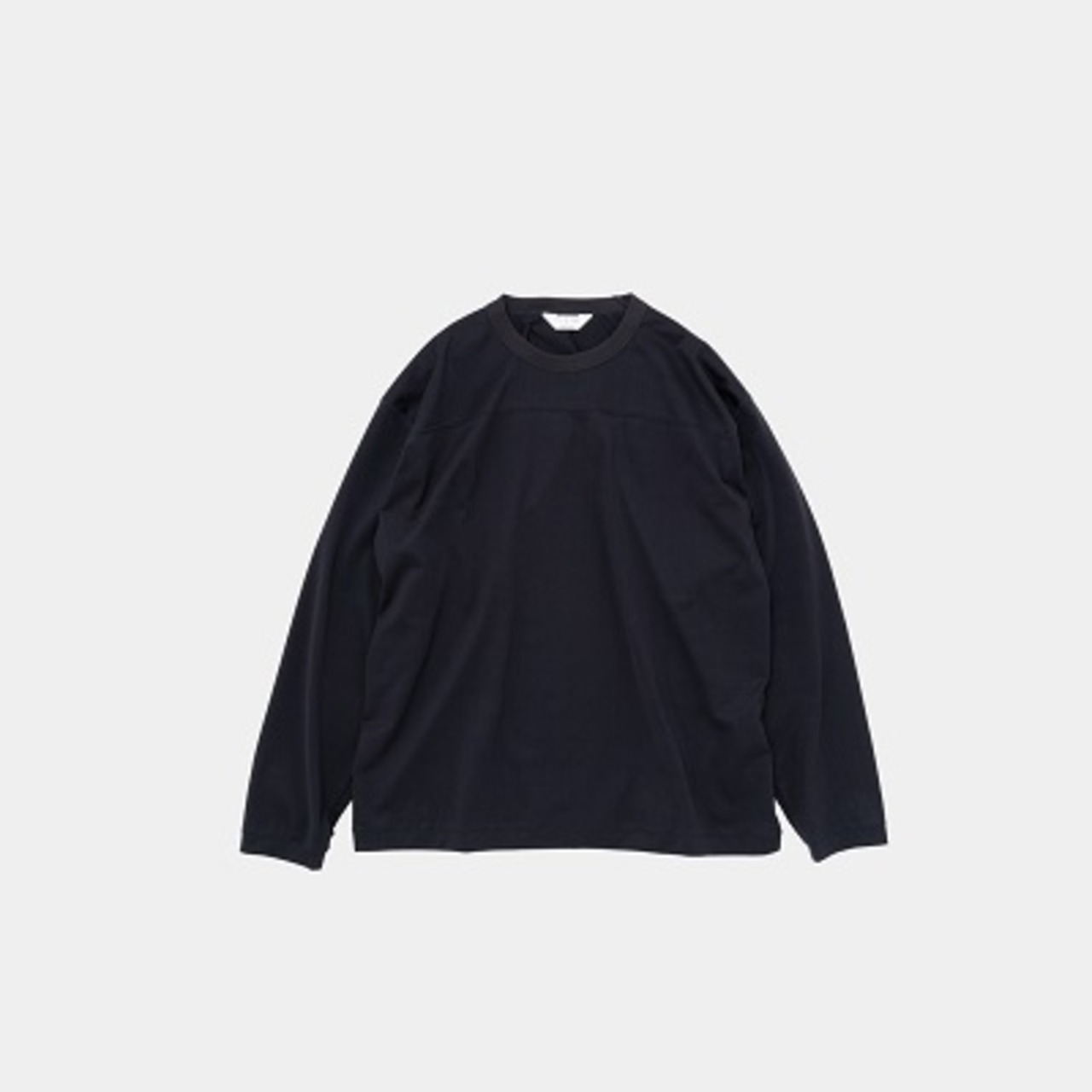 毛羽の少ないコンパクト糸を使用したロングスリーブのカットソーは、滑るような肌触りと上品な光沢感が特徴。フットボールTシャツのような切り替えが前身頃だけに施されており、肩の部分は肩線が無く、前後の身頃を一枚で繋げたパターンも特徴的です。
