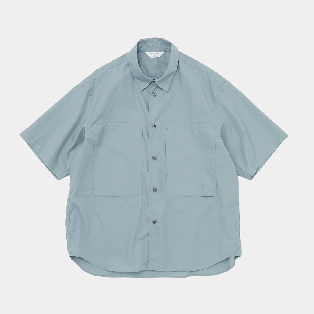 ピマコットン素材のブロード生地を使用したレギュラーカラー半袖シャツ。大きめのダブルポケット付きのデザインです。ルーズすぎないサイズ感ですが、袖丈は少し長めのデザインで肘に掛かる長さになっています。