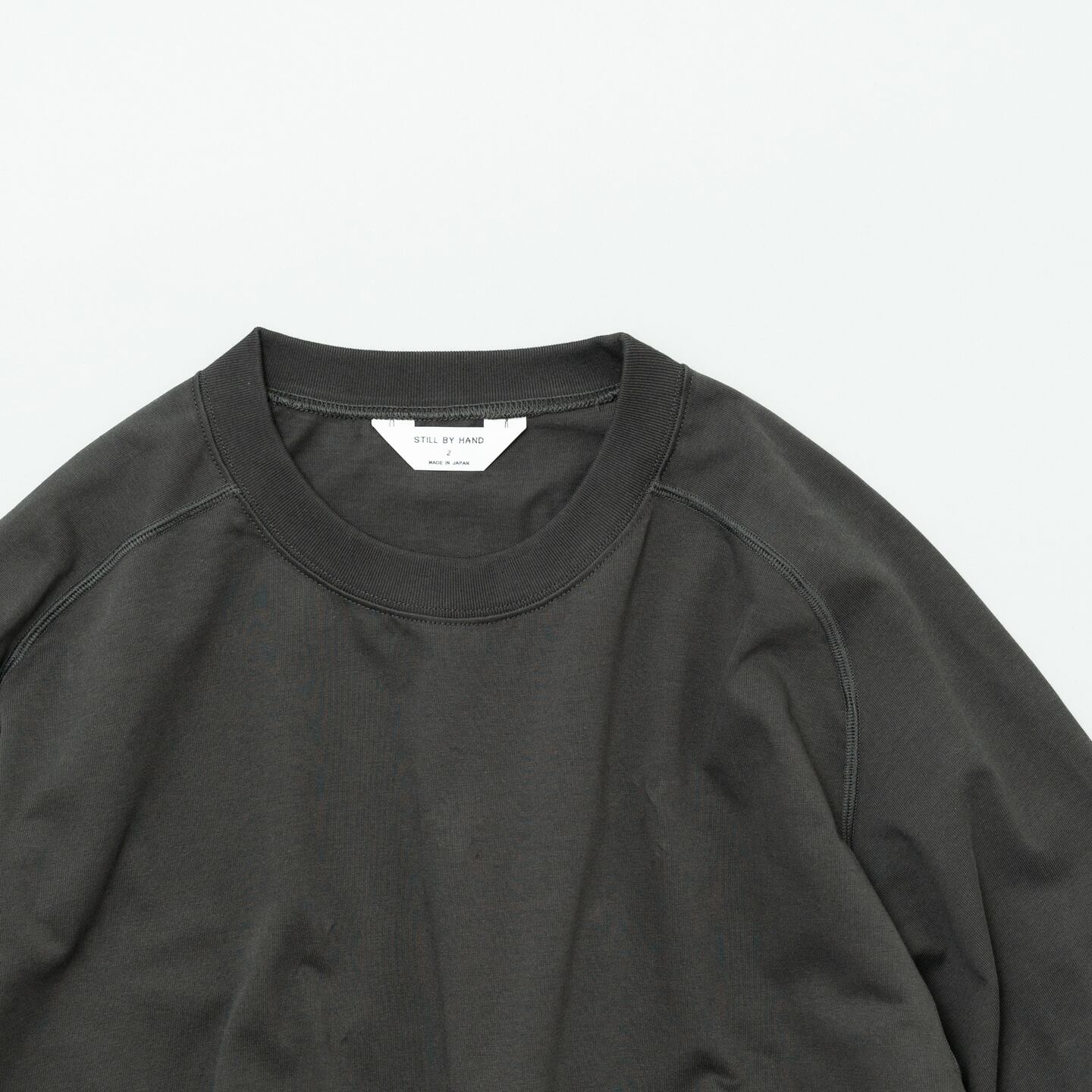 強撚糸を度詰めでしっかり編み立てた天竺素材を使用したカットソー。伸縮性の強いコットン生地で、ワンラック上のロンTといったイメージのアイテムです。カットソーではあまり見ないサドルスリーブの袖付けが特徴で、一枚で着ていただいても様になるデザインに仕上がっています。