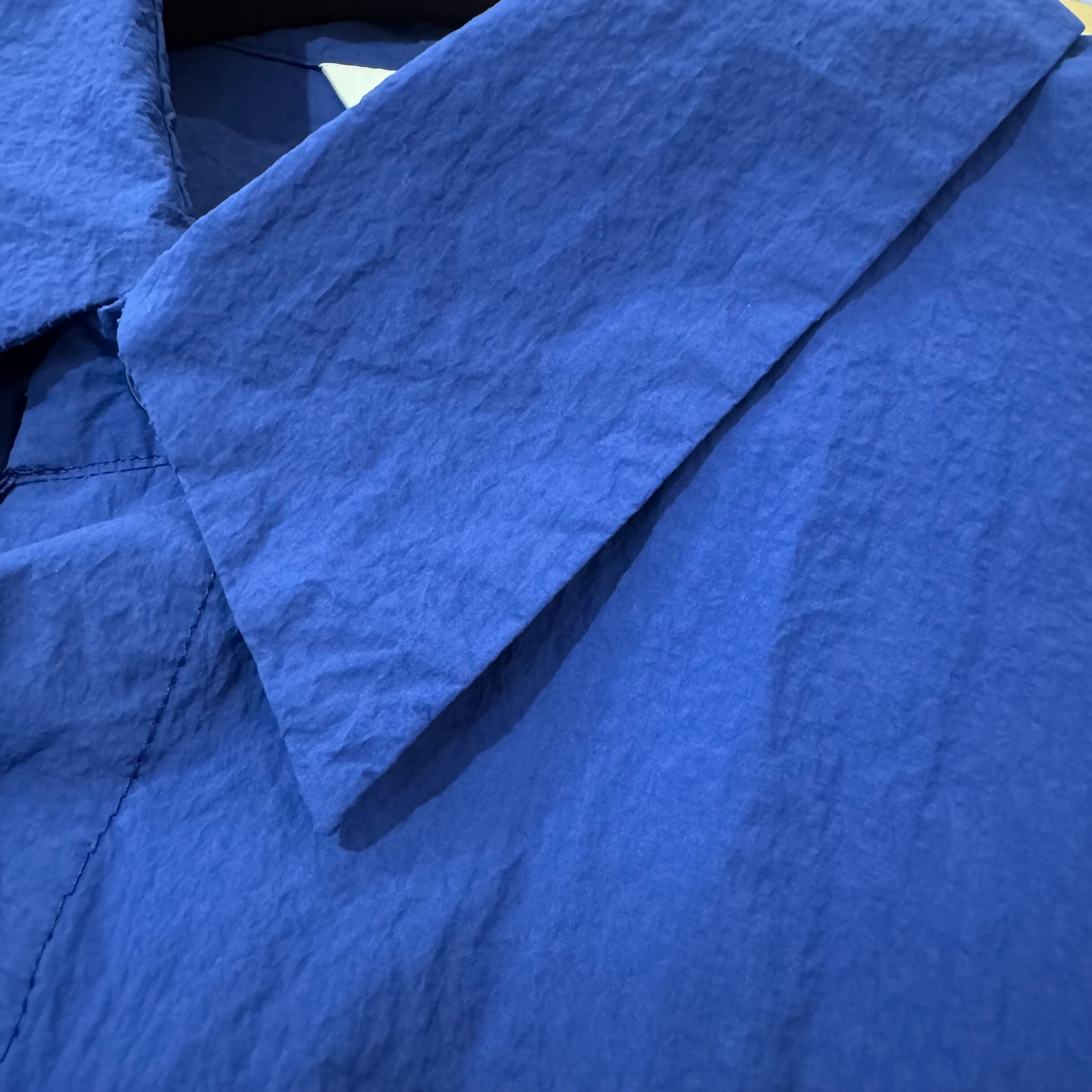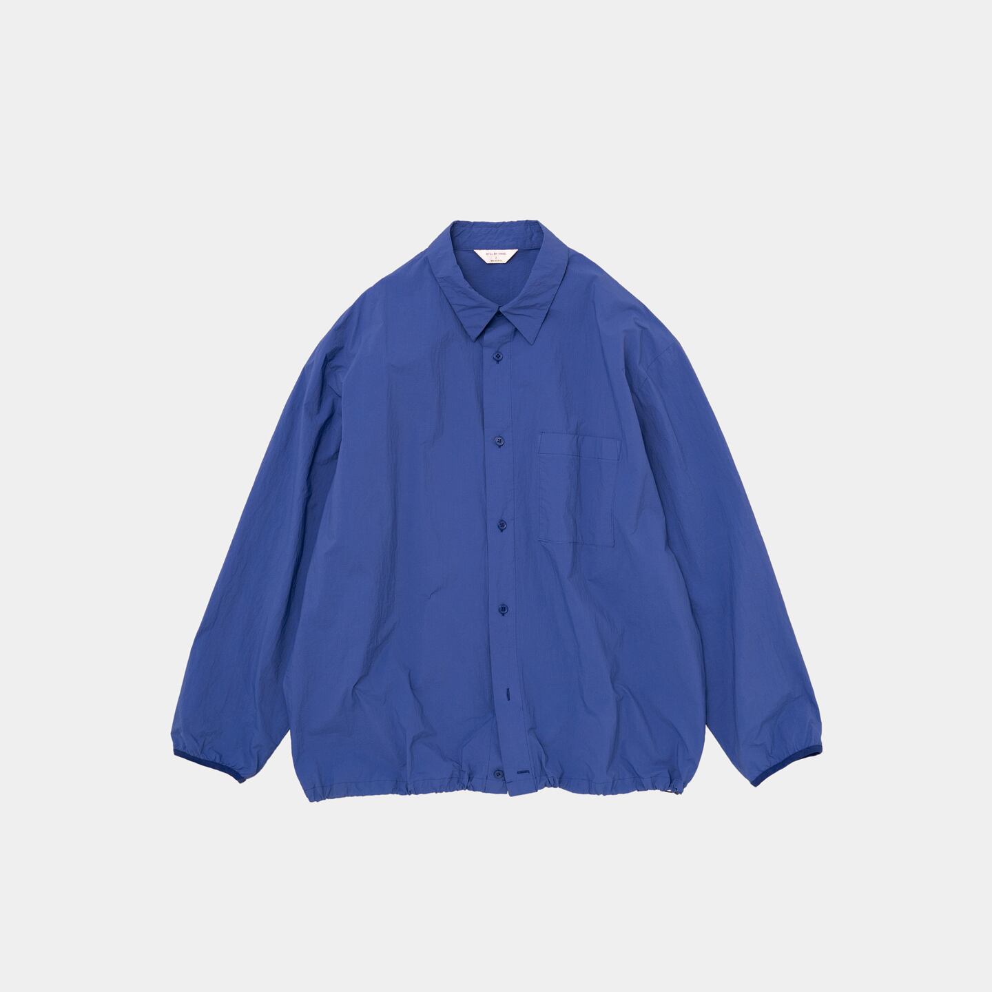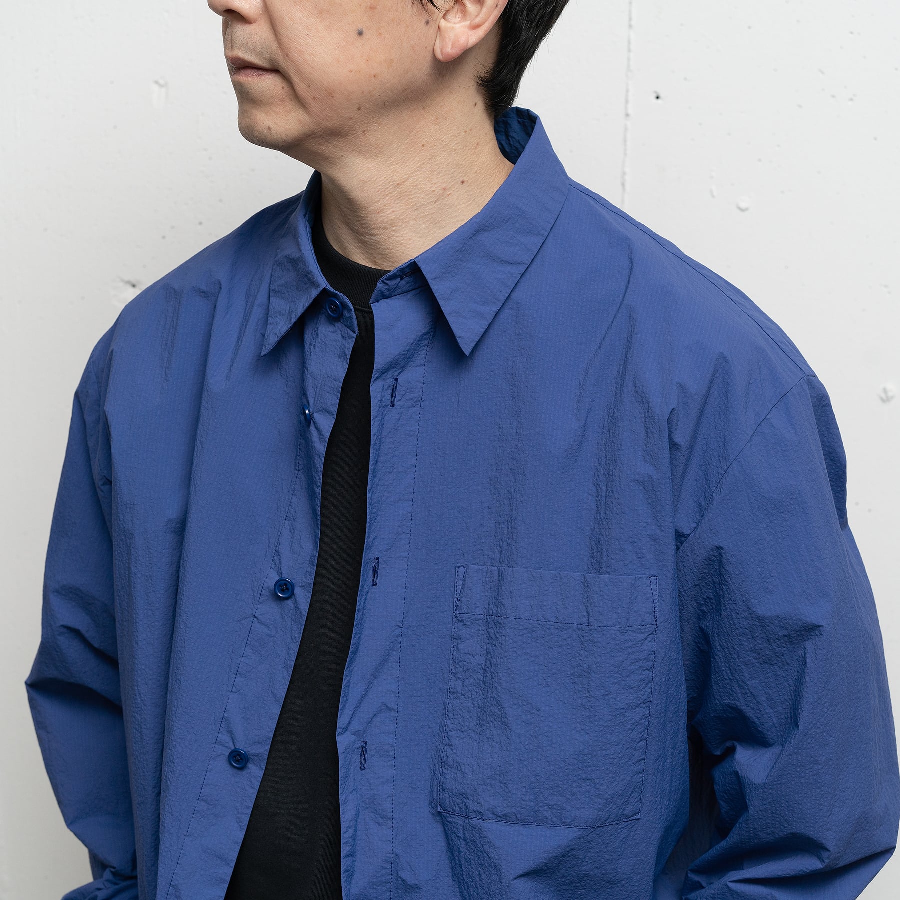 カシャッとしたライトで独特な手触りのナイロンシャツブルゾン。細番手のマイクロリップ素材を製品染めにし、染色後に強力な撥水加工を施しています。アノラックのようにミドルレイヤードに使うと面白いのではという発想でデザインされています。デザインはシャツですが、袖口はニットバインダー仕様、裾には絞れるスピンドルコードが付くなど、面白いギミックのあるアイテムです。