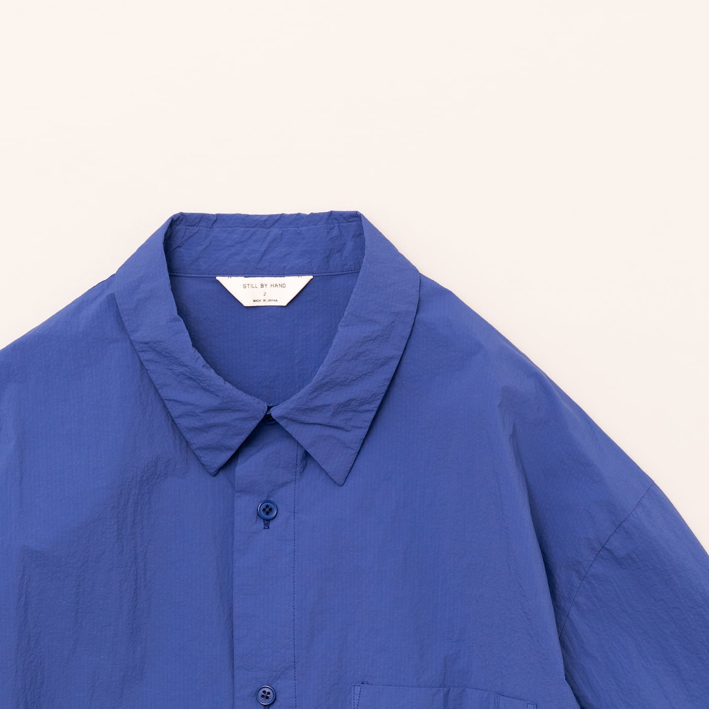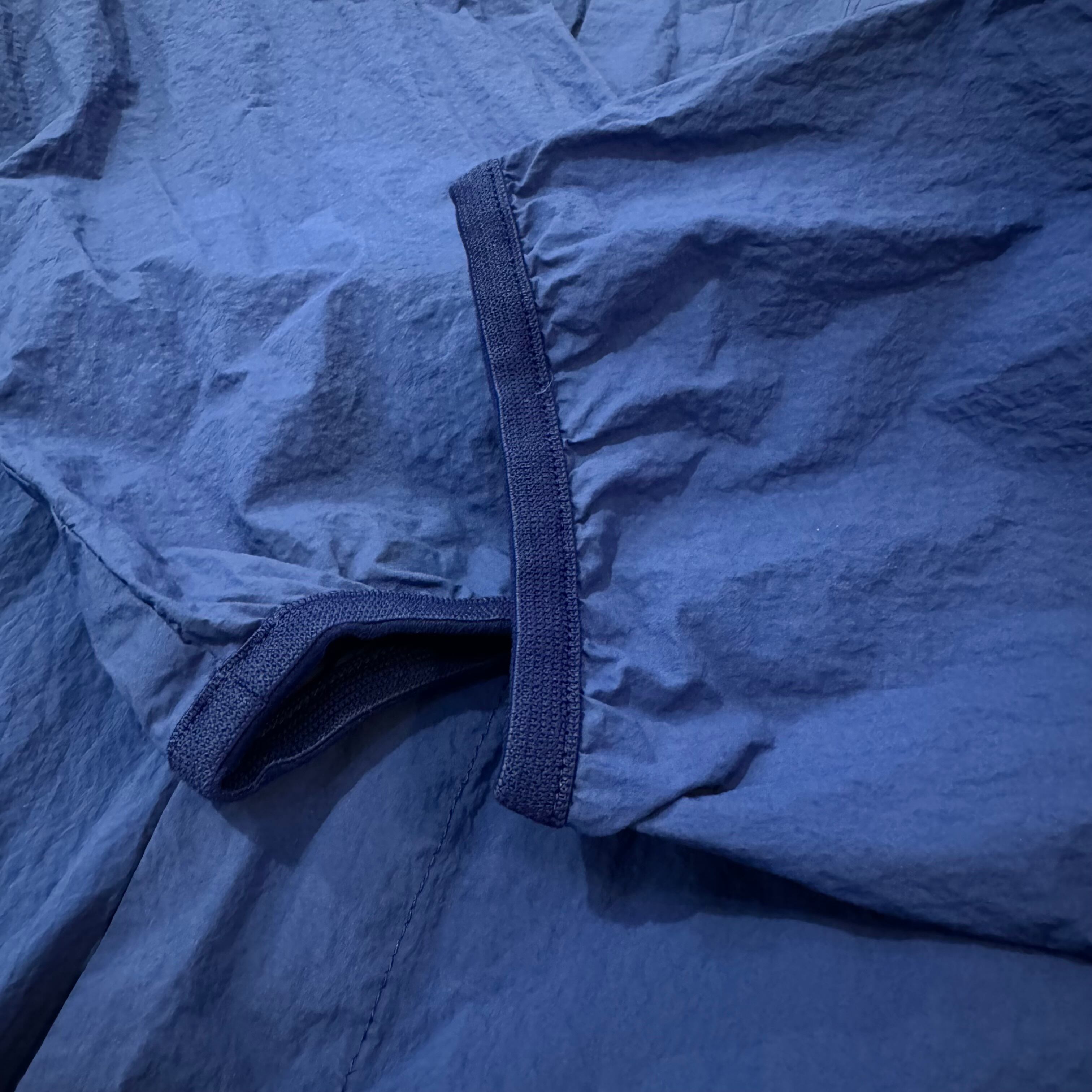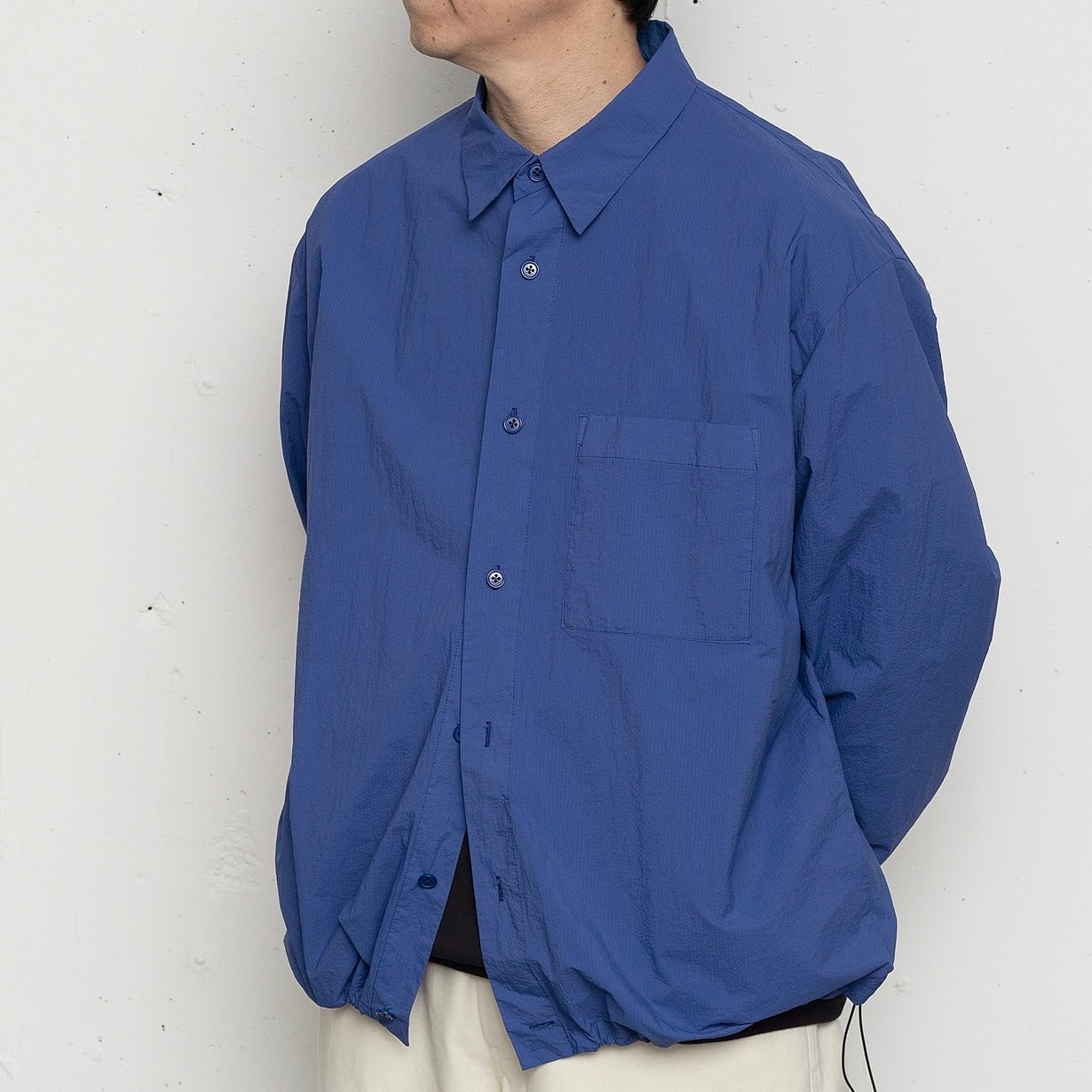 カシャッとしたライトで独特な手触りのナイロンシャツブルゾン。細番手のマイクロリップ素材を製品染めにし、染色後に強力な撥水加工を施しています。アノラックのようにミドルレイヤードに使うと面白いのではという発想でデザインされています。デザインはシャツですが、袖口はニットバインダー仕様、裾には絞れるスピンドルコードが付くなど、面白いギミックのあるアイテムです。