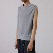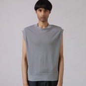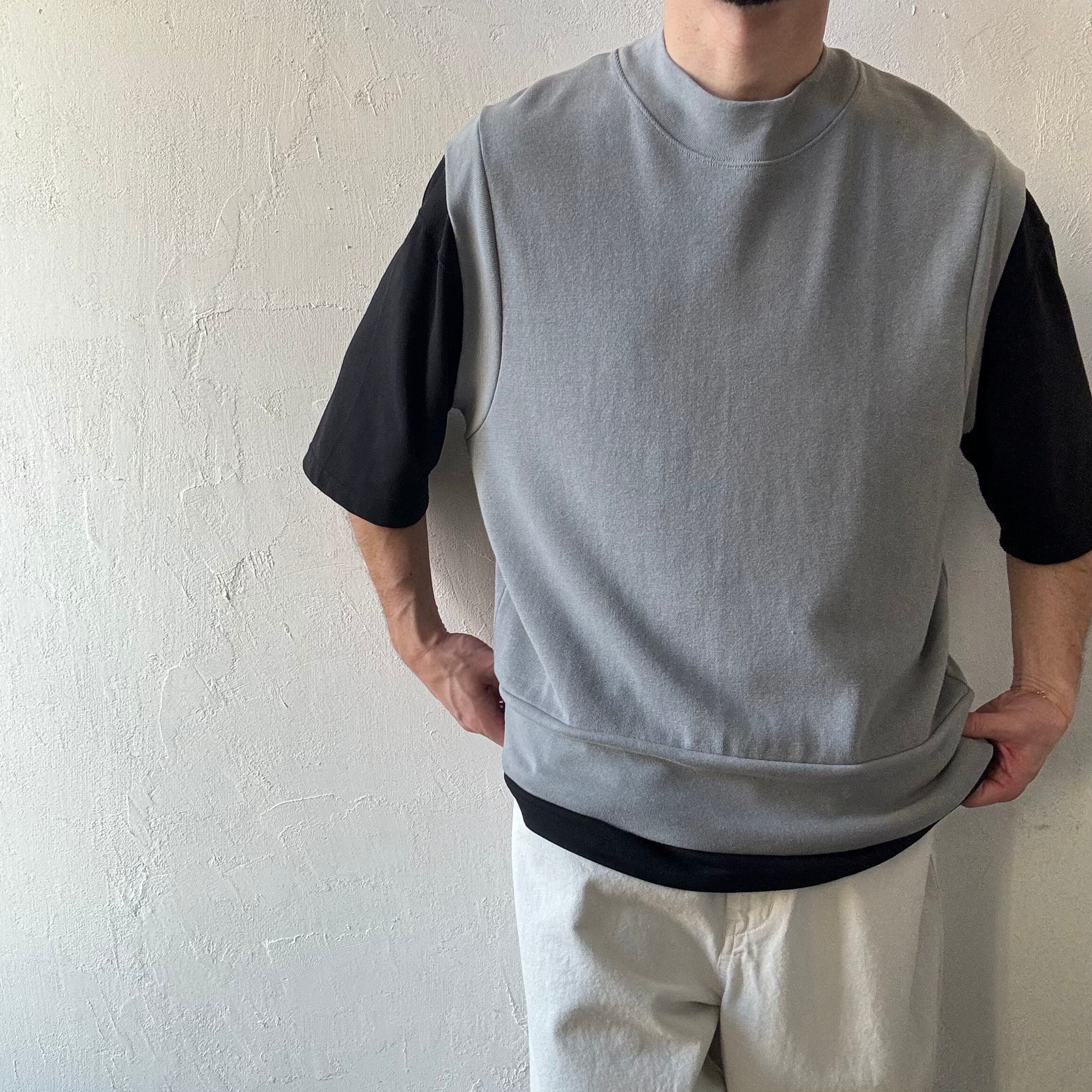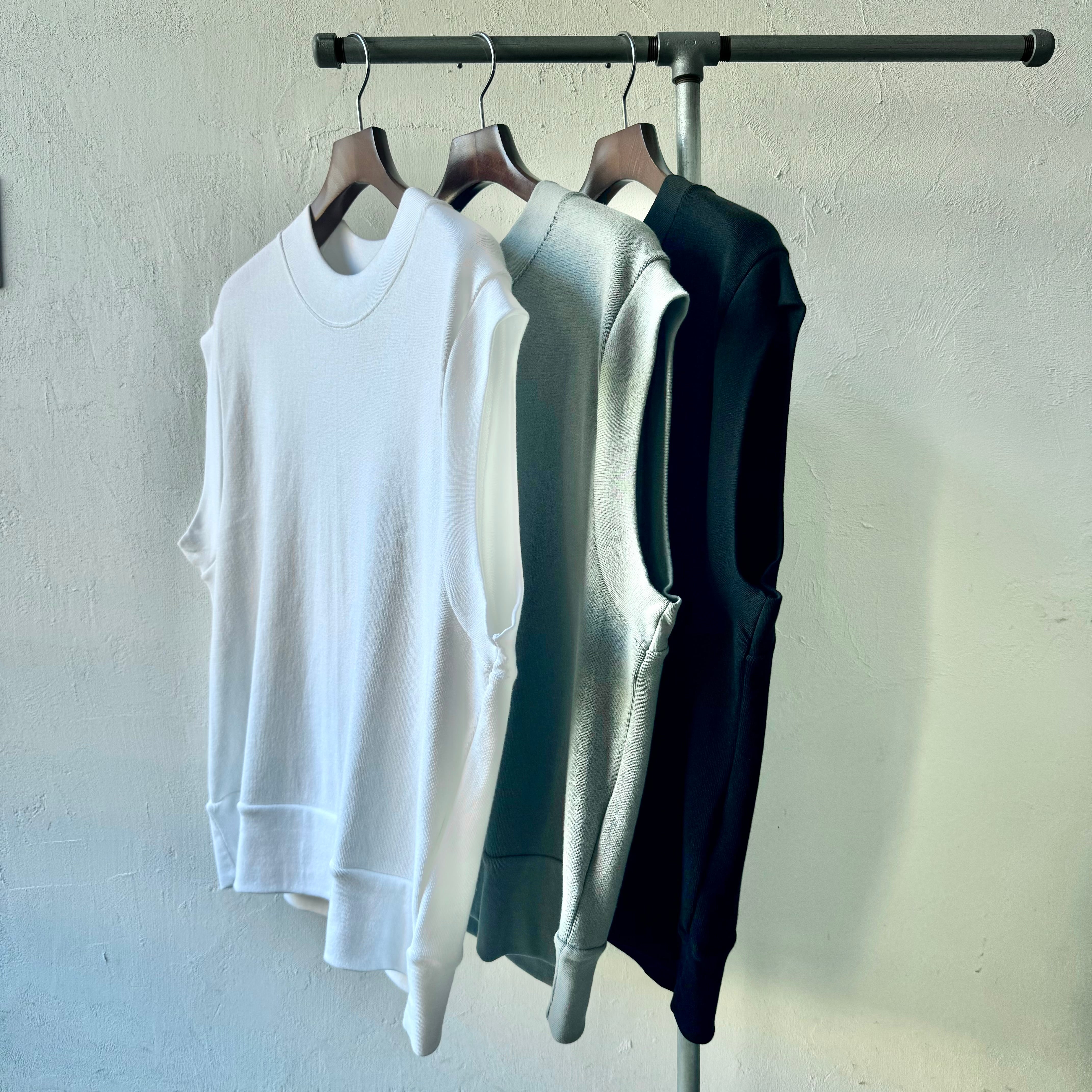クルーネックリブ付きジレ型ミラノリブニットソー。シルエットはリラックス感あるワイドフィット。ミラノリブの上品さを持った通年欠かせないレイヤードの定番アイテムとしておすすめです。アームホールを大きく設定することでオーバーサイズインナーも容易くレイヤーが可能です。裾は9cm幅ダブルの1×1リブになっており、ニットソーですがスウェット感覚で着用していただけます。ネックデザインは幅広の4.5cm幅ダブルの1×1リブ仕様でキュッっと詰まった印象のデザインです。コンパクトなネックまわりですが1×1リブ仕様の上、素材の特性もあって肌馴染みが良く締めつけ感がありません。タフさと程よく上品さを兼ね備えたデイリーに着回せる素材PESANTEはgicipi自慢の素材です。