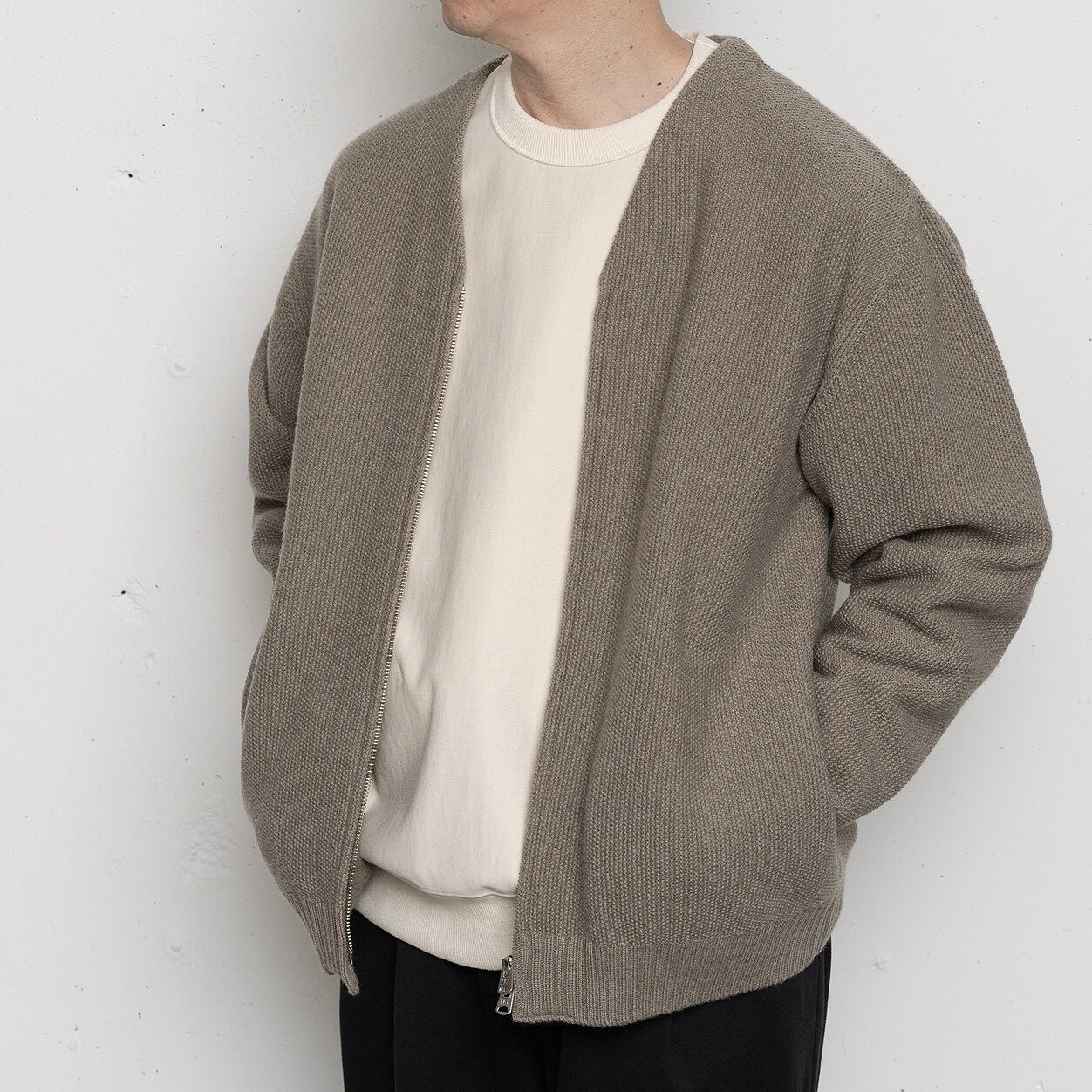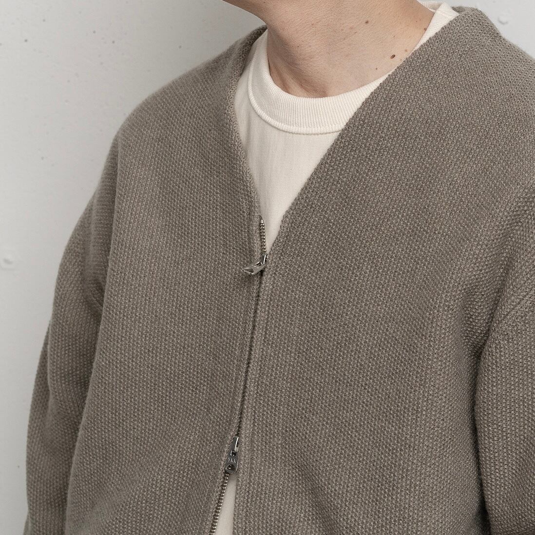 昨シーズン好評だったZIP付きニットブルゾンが新たな素材で登場。今回も毛糸からオリジナルで制作し、英国羊毛の糸とカシミアの糸を撚糸した風合いの良いブルゾンに仕上がっています。アウター的な使い方からコートの下に着るカーディガンのような着方まで、程良い厚みで使いやすいニットブルゾンです。フロントジッパーはクラシカルなデザインと、スタイリングのアレンジに重宝するダブルジッパーを採用。ポケットをシームポケットにすることで、シンプルかつすっきりとした印象に。