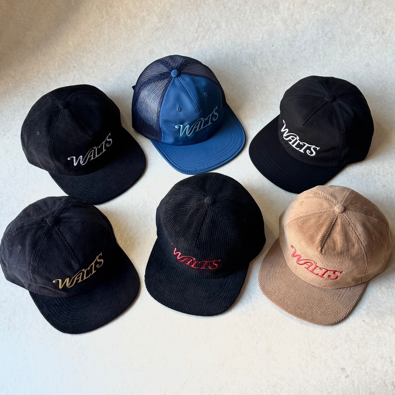 アメリカ・ロサンゼルスのイーグルロックエリアにあるWalt’s Barのオリジナルキャップ。ツイルキャップ、コーデュロイキャップ、メッシュキャップの3タイプで、それぞれのボディの正面にはWalt'sの刺繍が施されています。サイズ調整が可能で、メッシュキャップ以外はスナップバックになります。