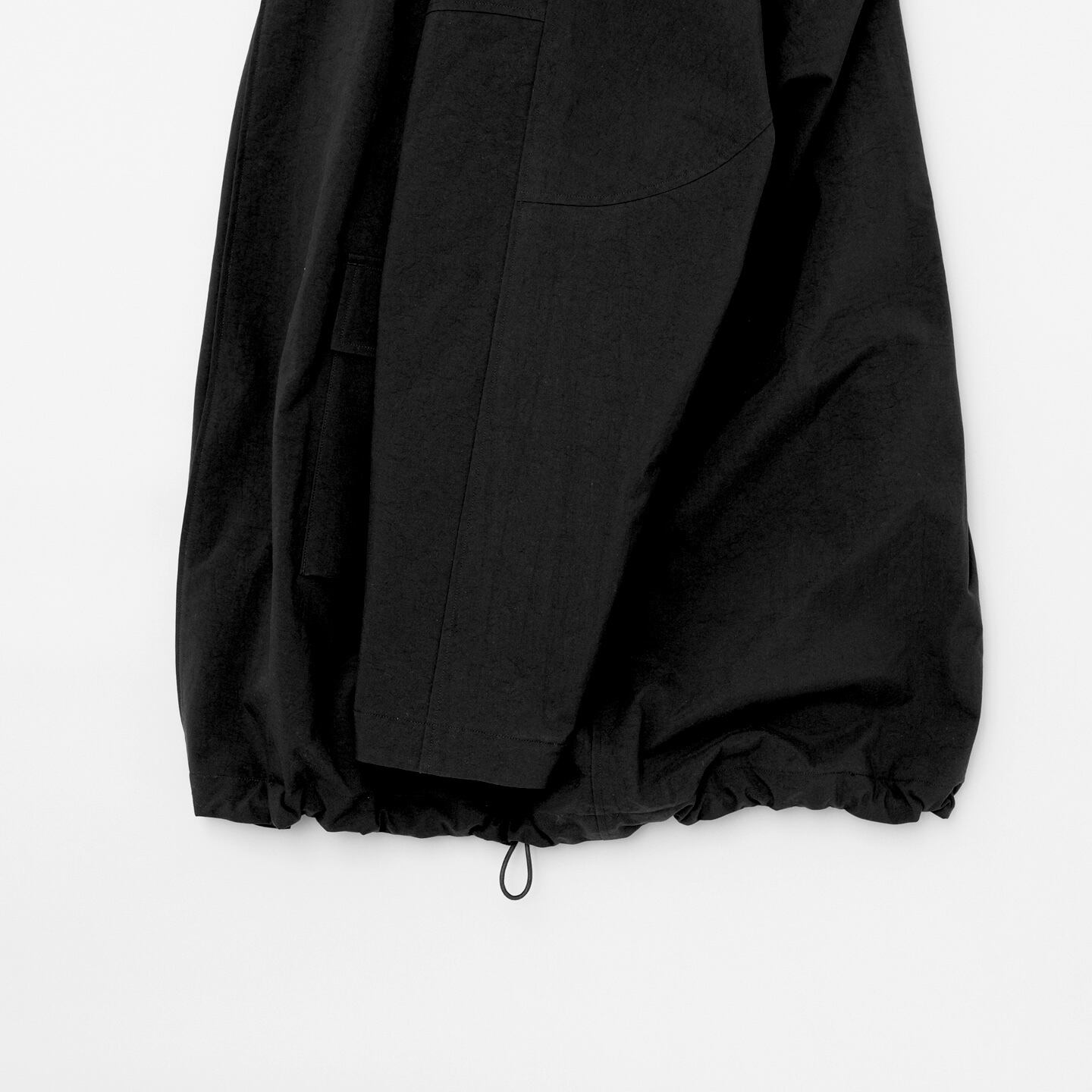フロント合わせの深いセミダブルのようなデザインがポイントのハーフ丈コート。撥水性、透湿性がありながら綿のような表情が特徴のナイロンオックス素材を使用しています。デザインはシンプルに纏められ、表に出ないスナップボタンでフロントをすっきりと見せています。裏地にはライトなシンサレートキルト素材を使い保温性を確保。カジュアル過ぎないデザインが様々なスタイリングにハマる一着です。