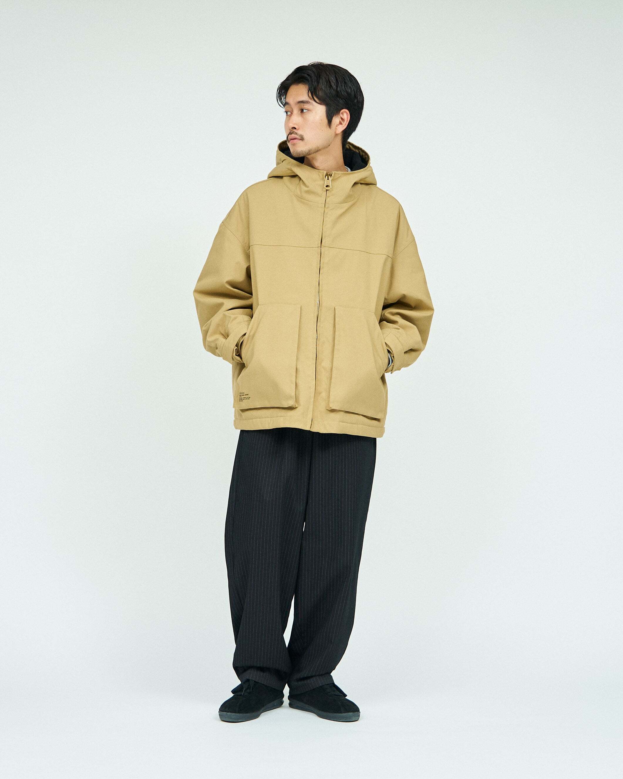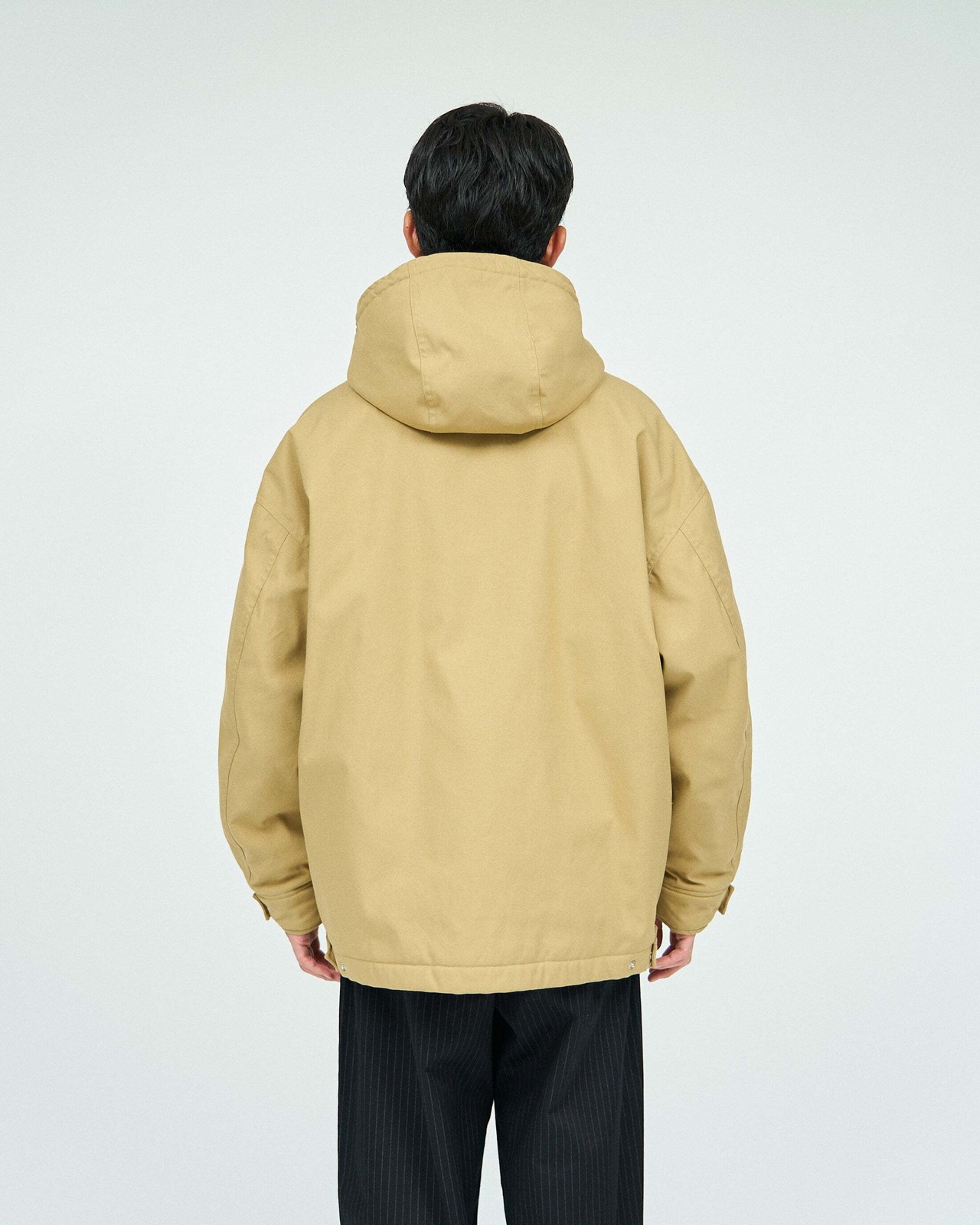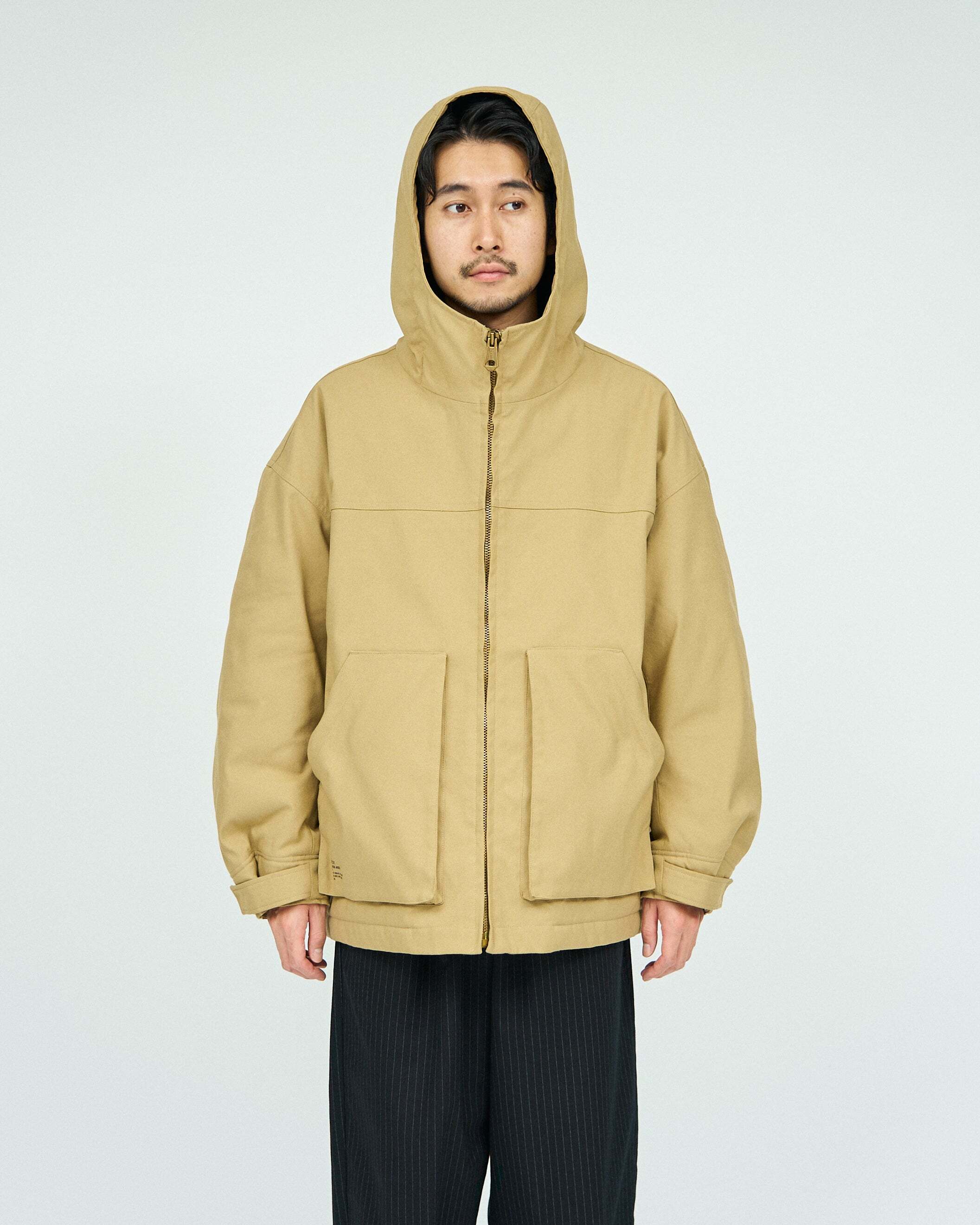 ワークスタイルの定番であるダック生地を使ったフードブルゾンをFreshService流にアレンジした一着。通常、コットンを使うダック生地をあえてポリエステル100%で作成。特殊な断面を持つポリエステルの糸を使用したダック素材なので、軽くドライなタッチとソフトな質感が特徴です。コットンダックのような見た目でありながら、驚くほど柔らかくて動きやすい快適な着心地です。顎あたりまでしっかりと覆うフードのデザインが特徴で、裏面に肌触りの良い保温性にも優れた肉厚のボアを配備することで保温性もしっかりと確保しています。