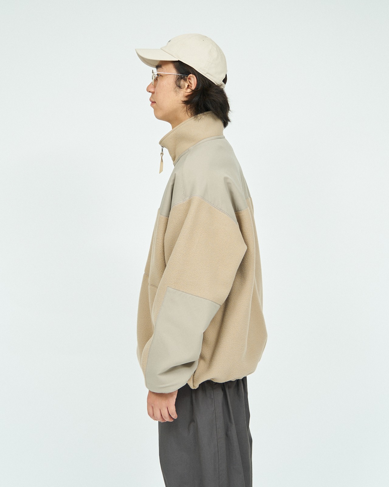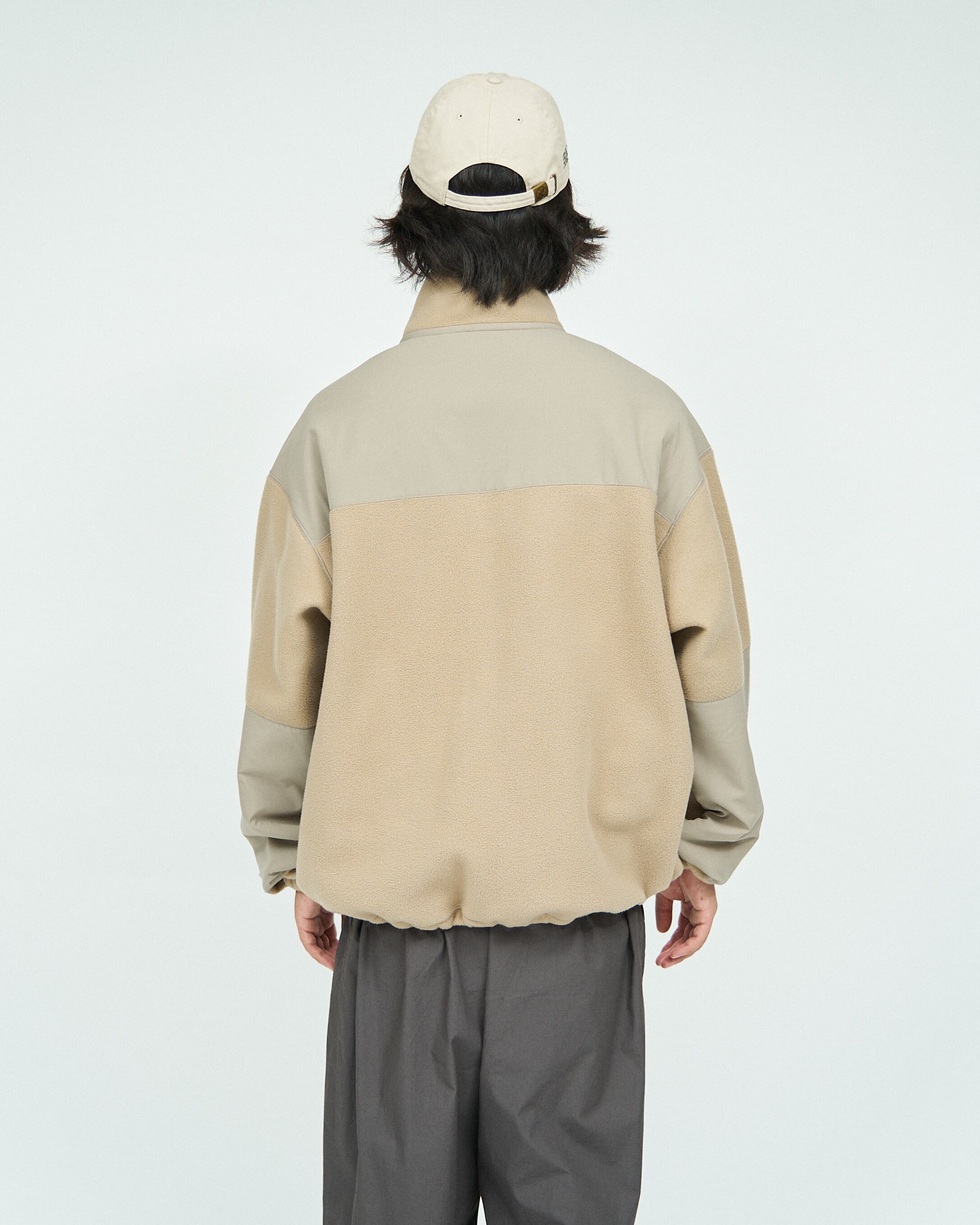 リサイクルポリエステルを使用したフリースブルゾン。肉厚でキメが細かく柔らかいフリース素材は、肌触りが良く軽量でありながら保温性を備えた一着。耐久性のあるタフタ素材で補強した肩周りと肘部分は、デザインのポイントにもなっています。ゆったりとボリュームのあるサイズ感で、裾に配したドローコードによりシルエットの調整も可能です。