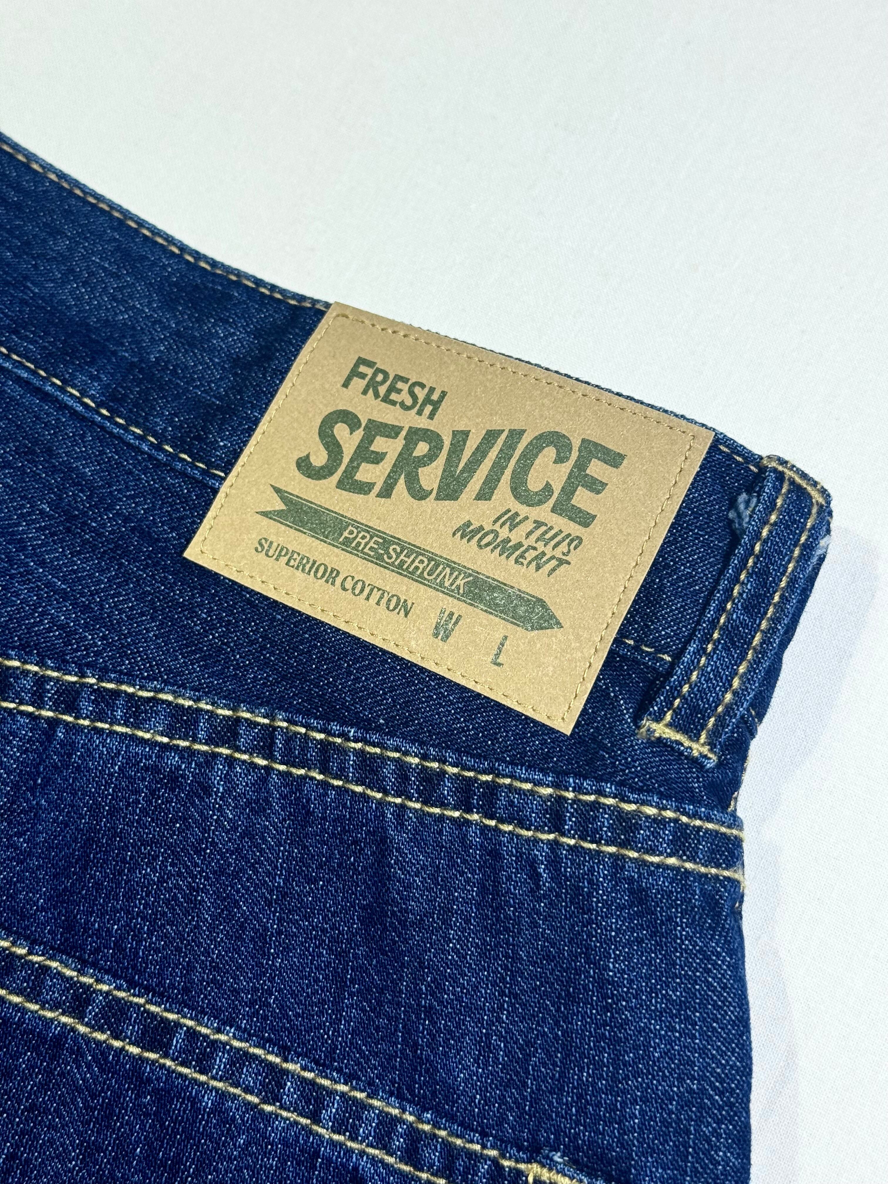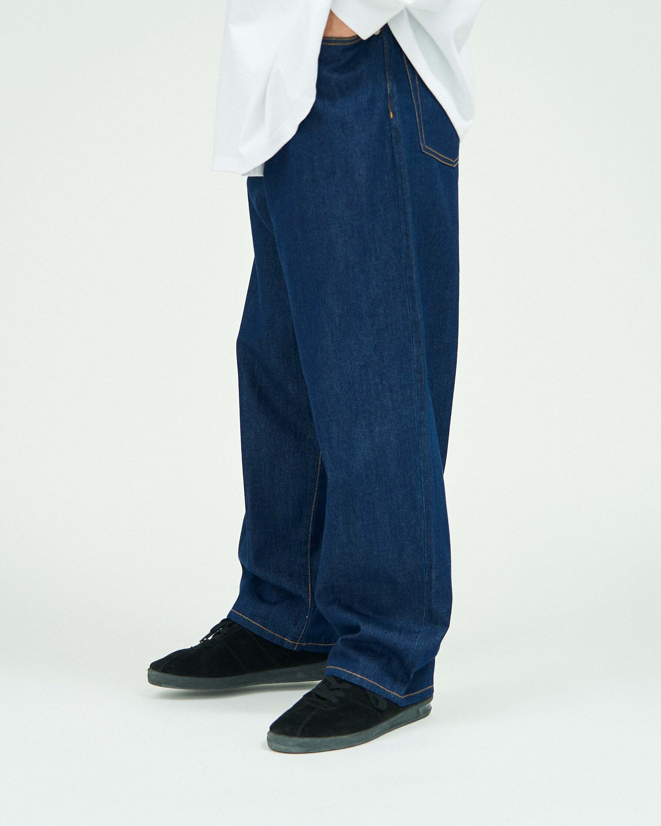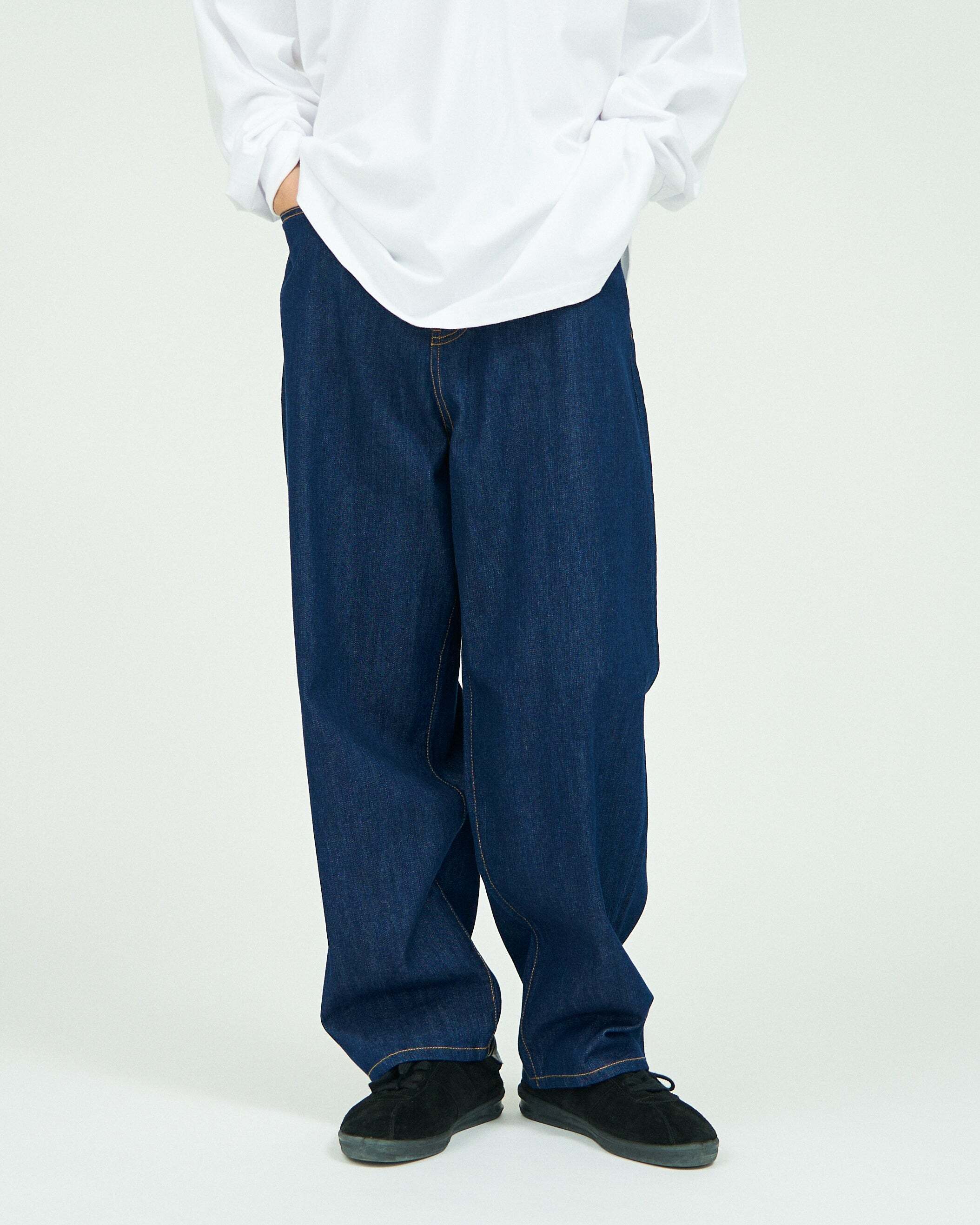 FreshServiceらしいワイドテーパードシルエットに仕上げたファイブポケットジーンズ。季節やシーンを選ばない軽く柔らかな肌触りの9.5ozのインディゴデニムを使用し、洗いざらしの自然な風合いが魅力のワンウォッシュカラーに仕上げました。シルエットはボリュームのある腰回りから裾に向かって緩やかに細くなるワイドテーパードです。