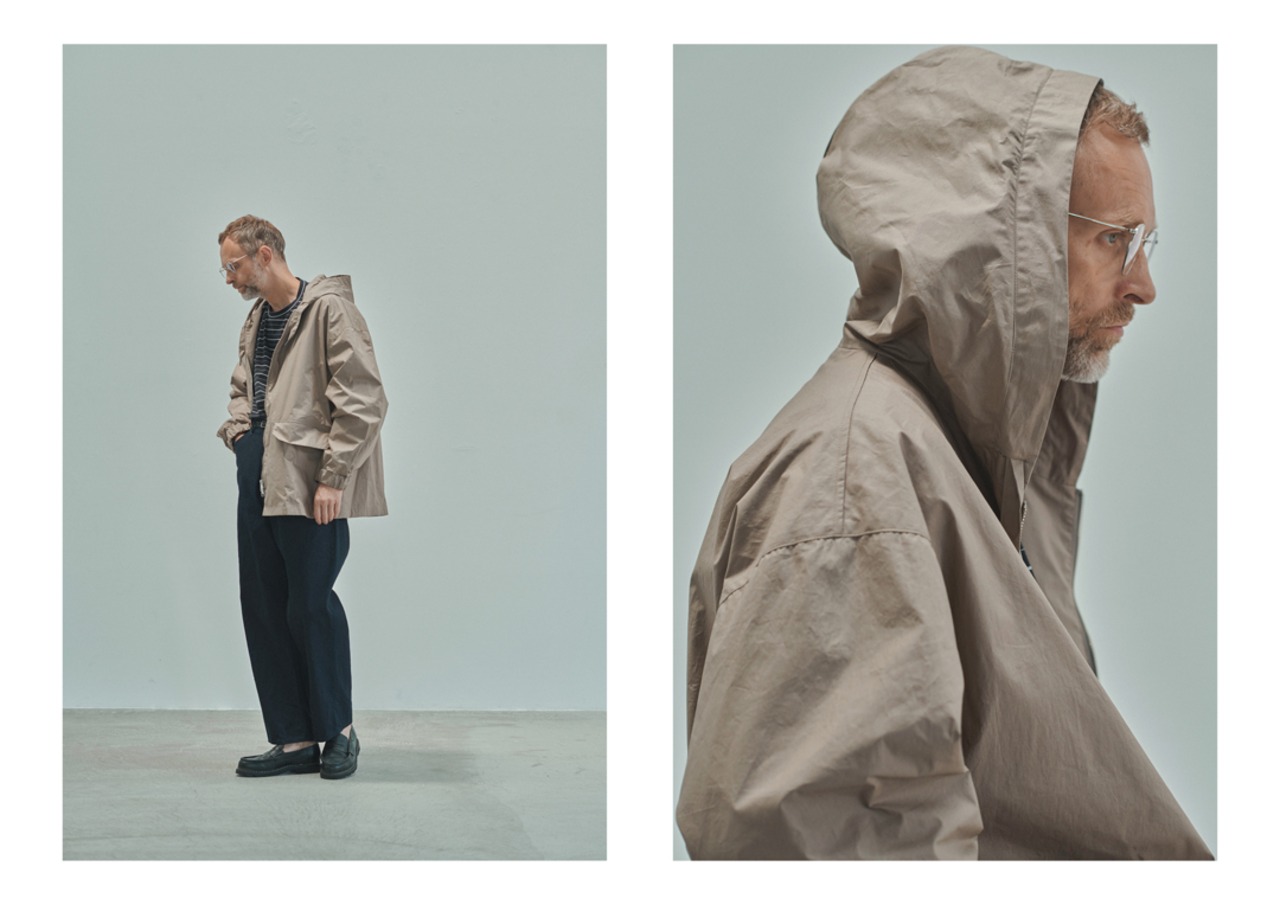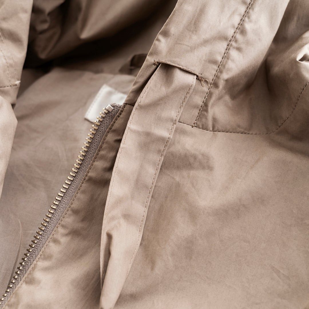 フロントジップタイプのライトアウターをスポーティ過ぎない印象を意識して制作した新作ブルゾン。素材は、シリコン樹脂をコットン生地の裏面から浸透させることで化繊のような独特の張りを持つユニークな生地です。高密度のタイプライター生地がベースなので非常に軽く、春先からのスタイリングに最適なアウターです。